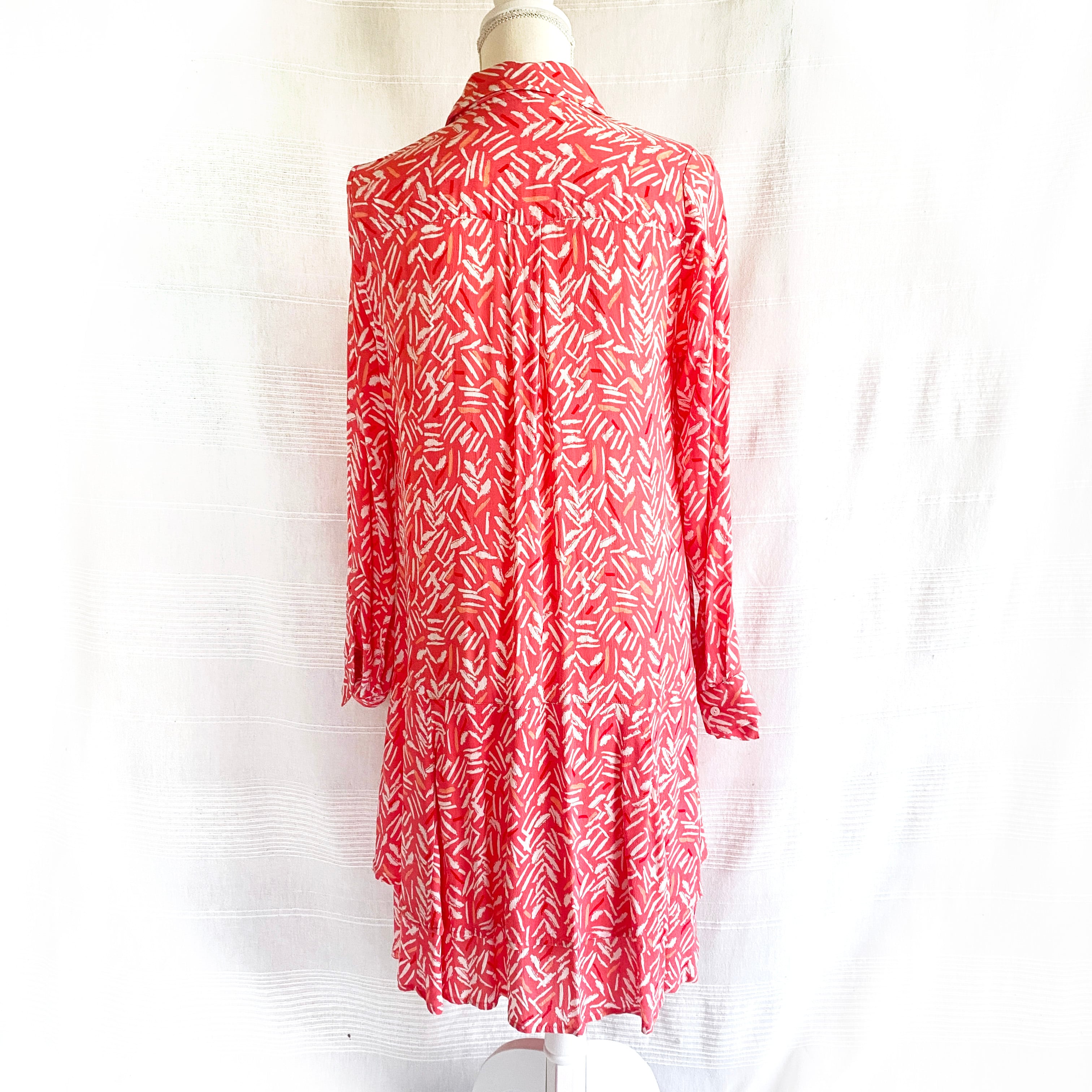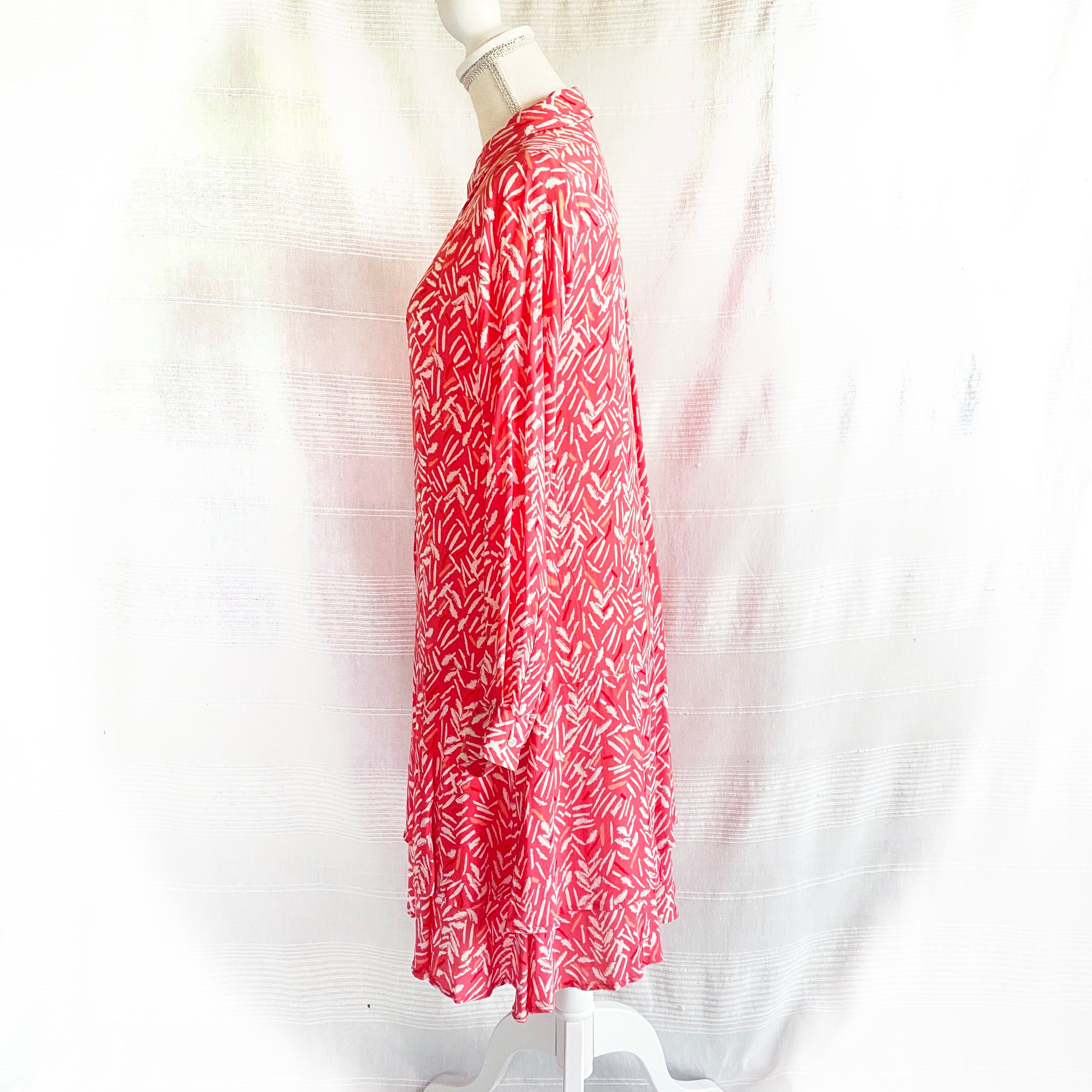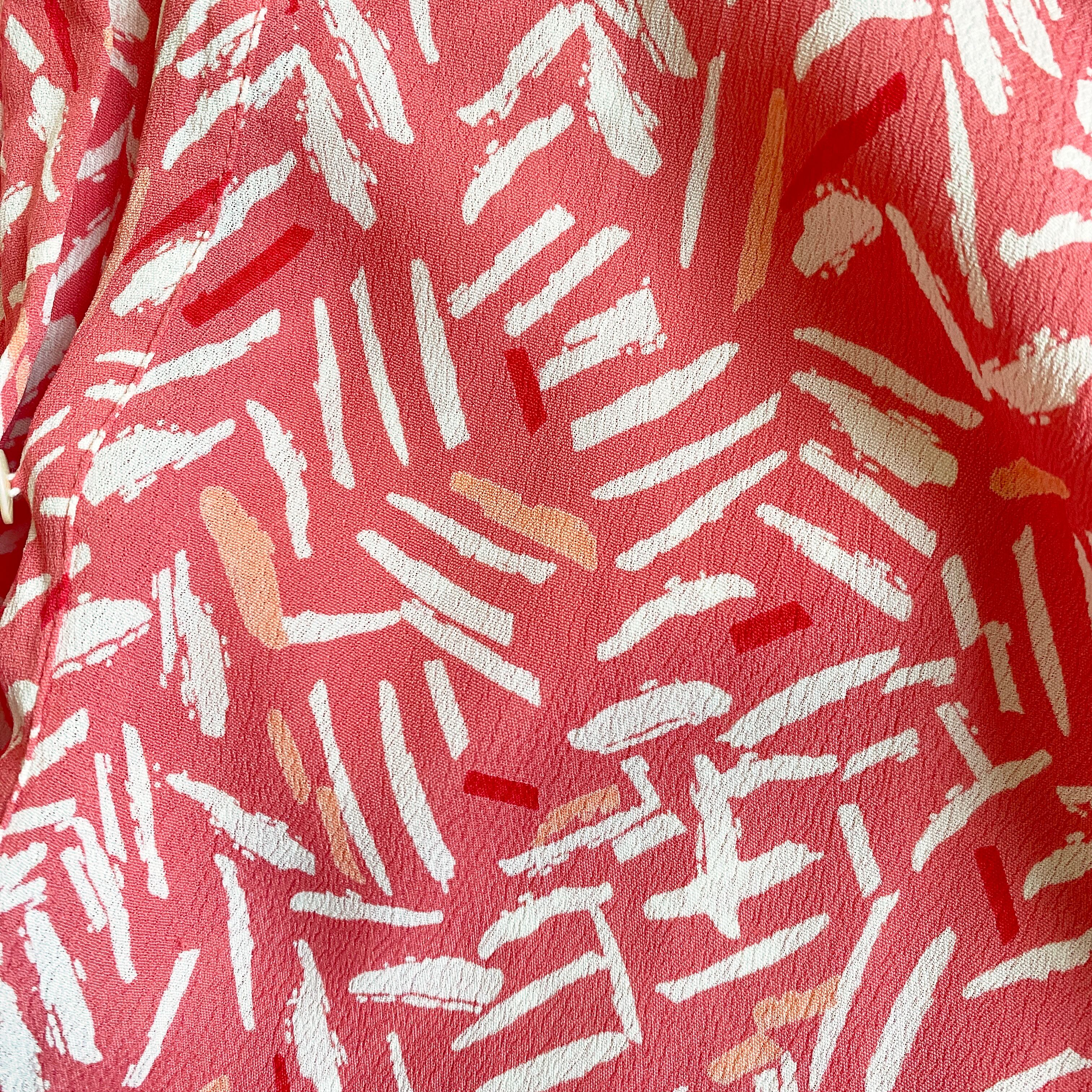 腰の低い位置からの切り替えのフレアのシルエットがかわいい、ピンクに白のプリントのワンピース。