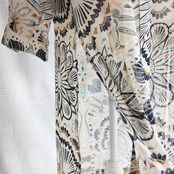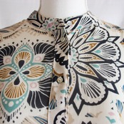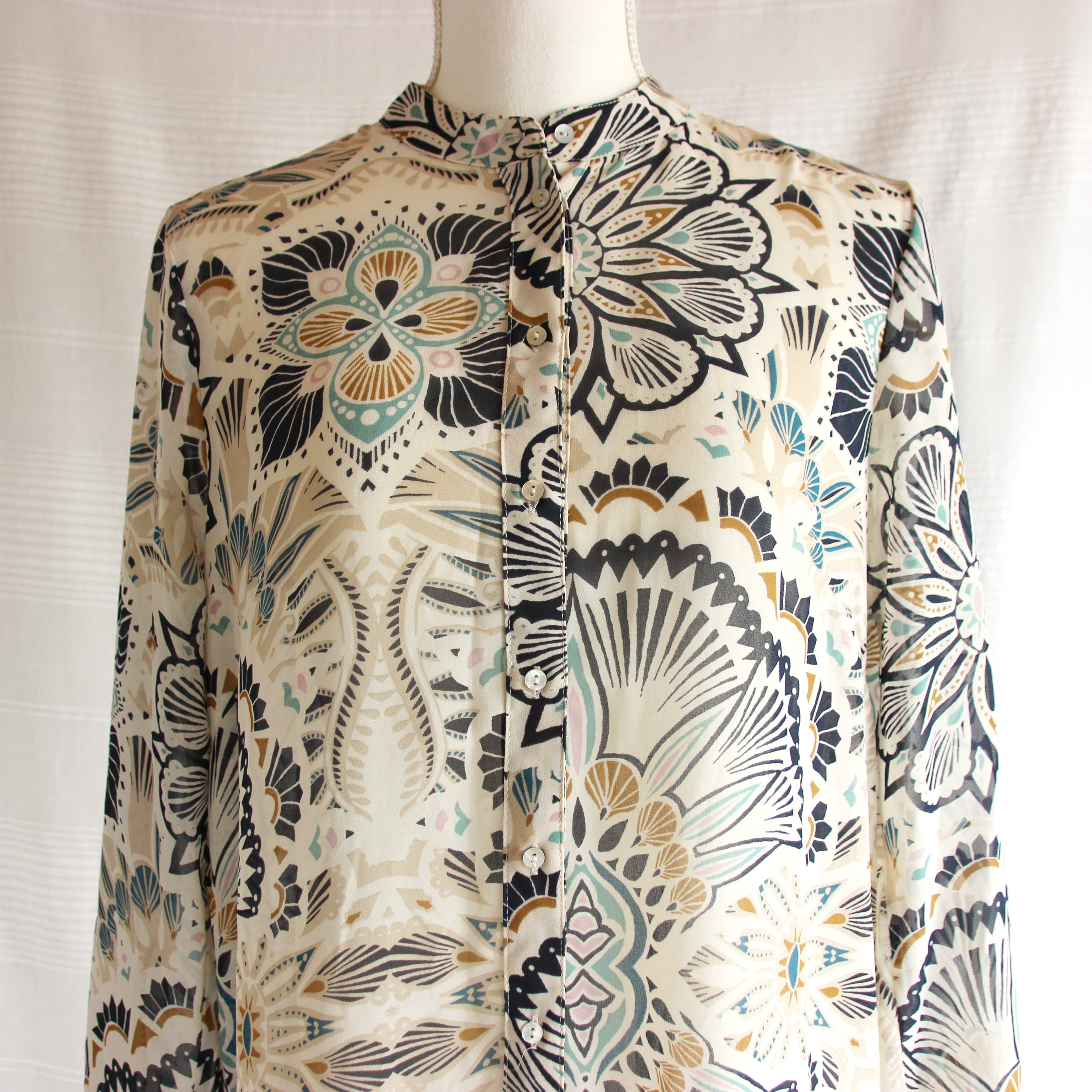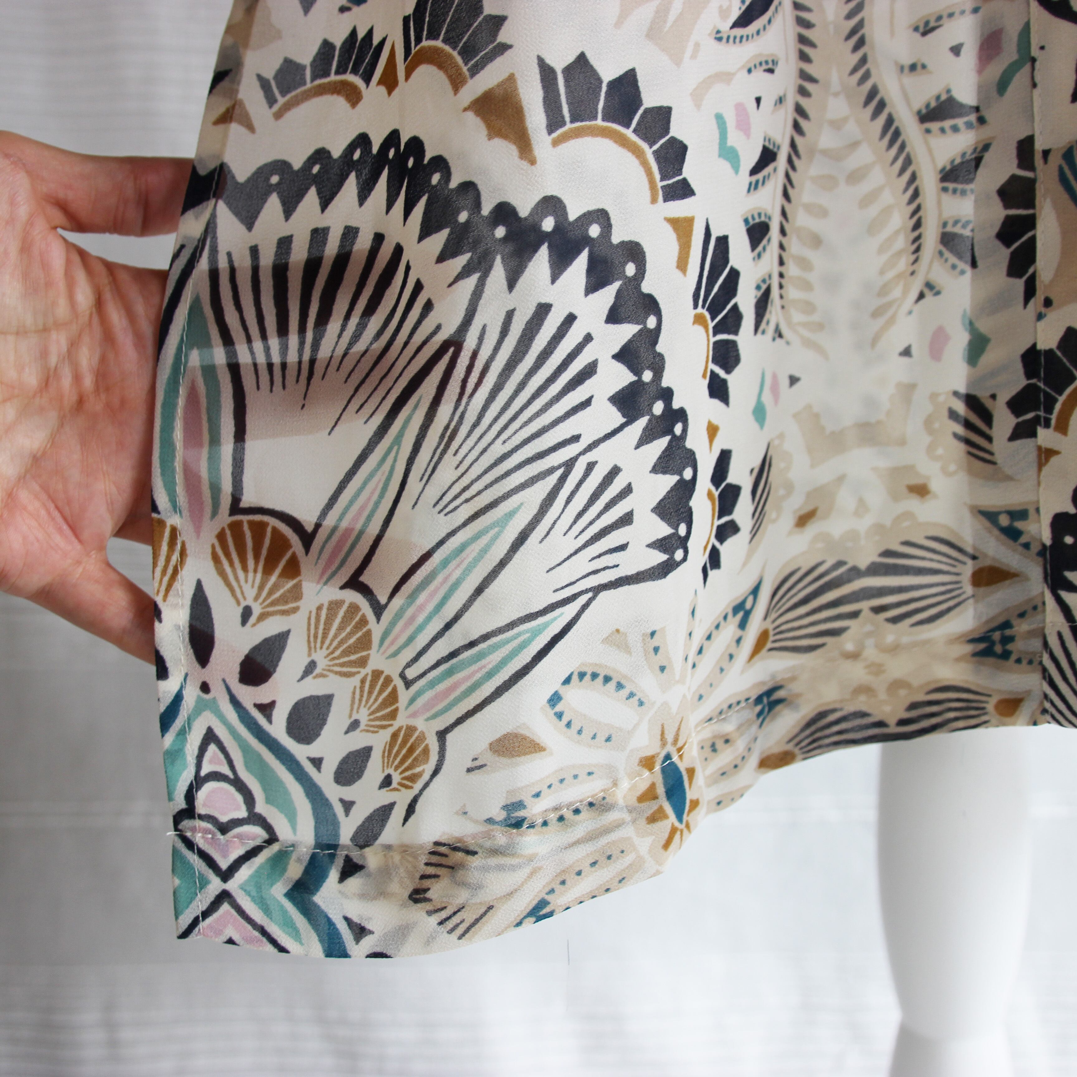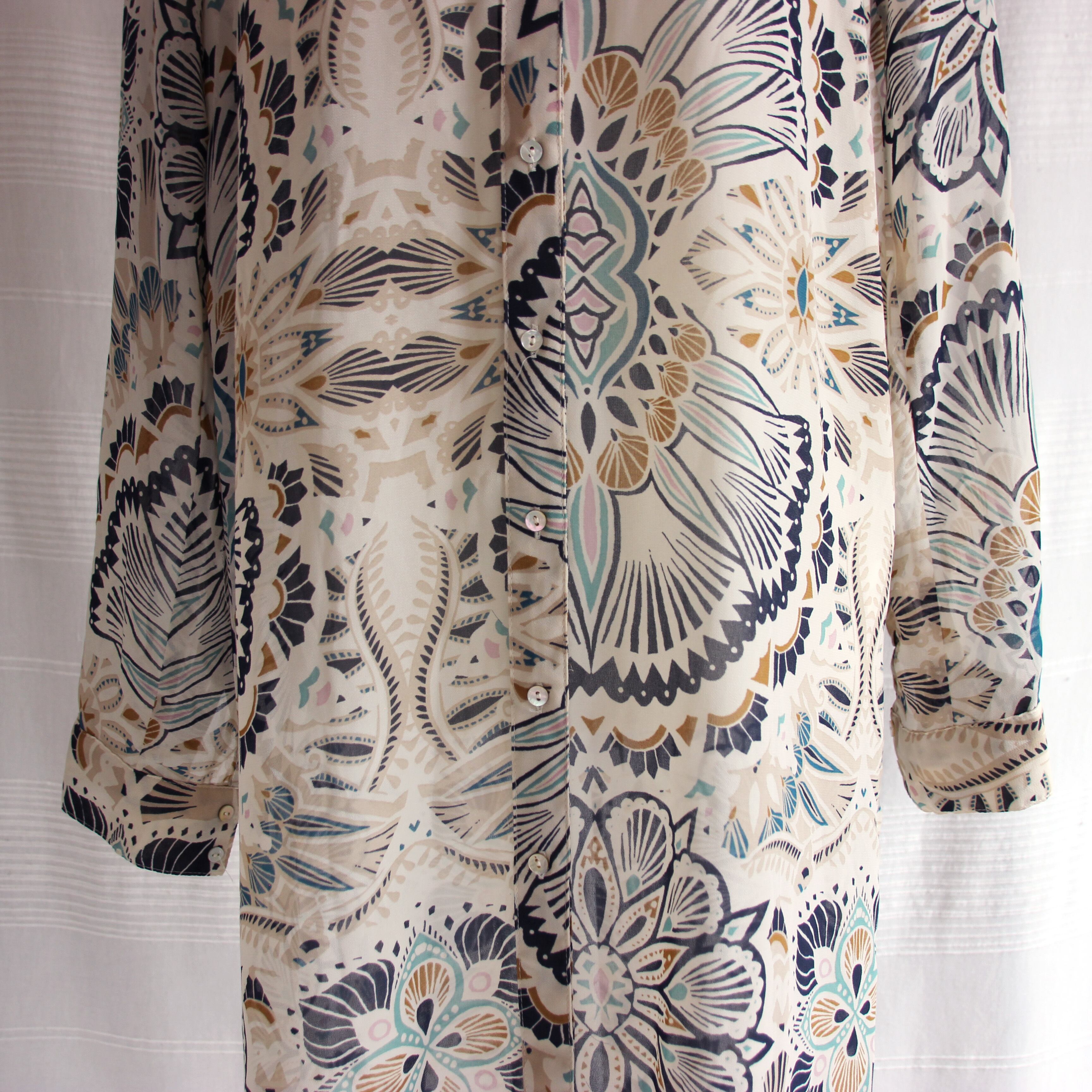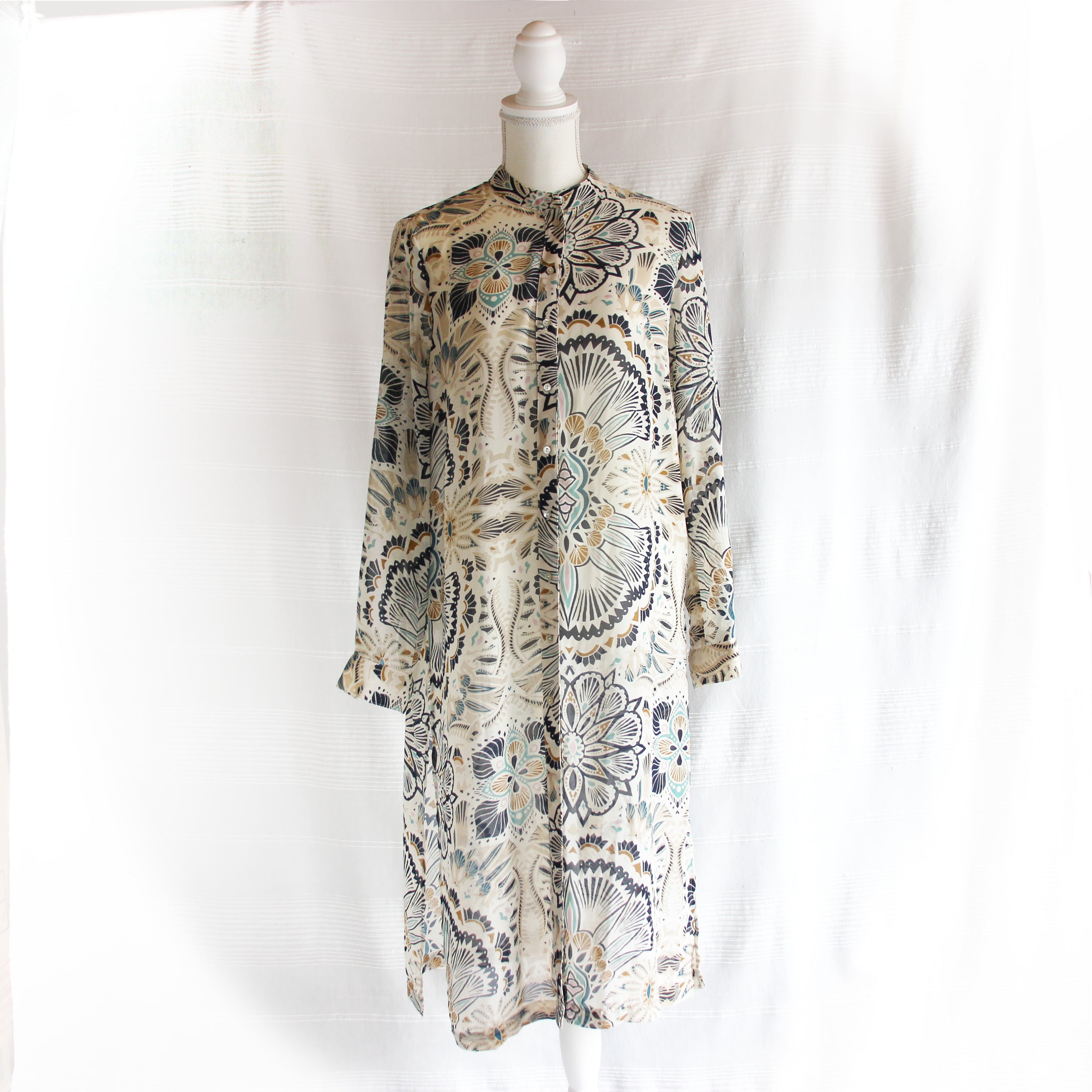 シアーな素材に、グリーンやネイビーで描いた、拡大したような大きさのアラベスク風の模様が目をひくシャツワンピース。
