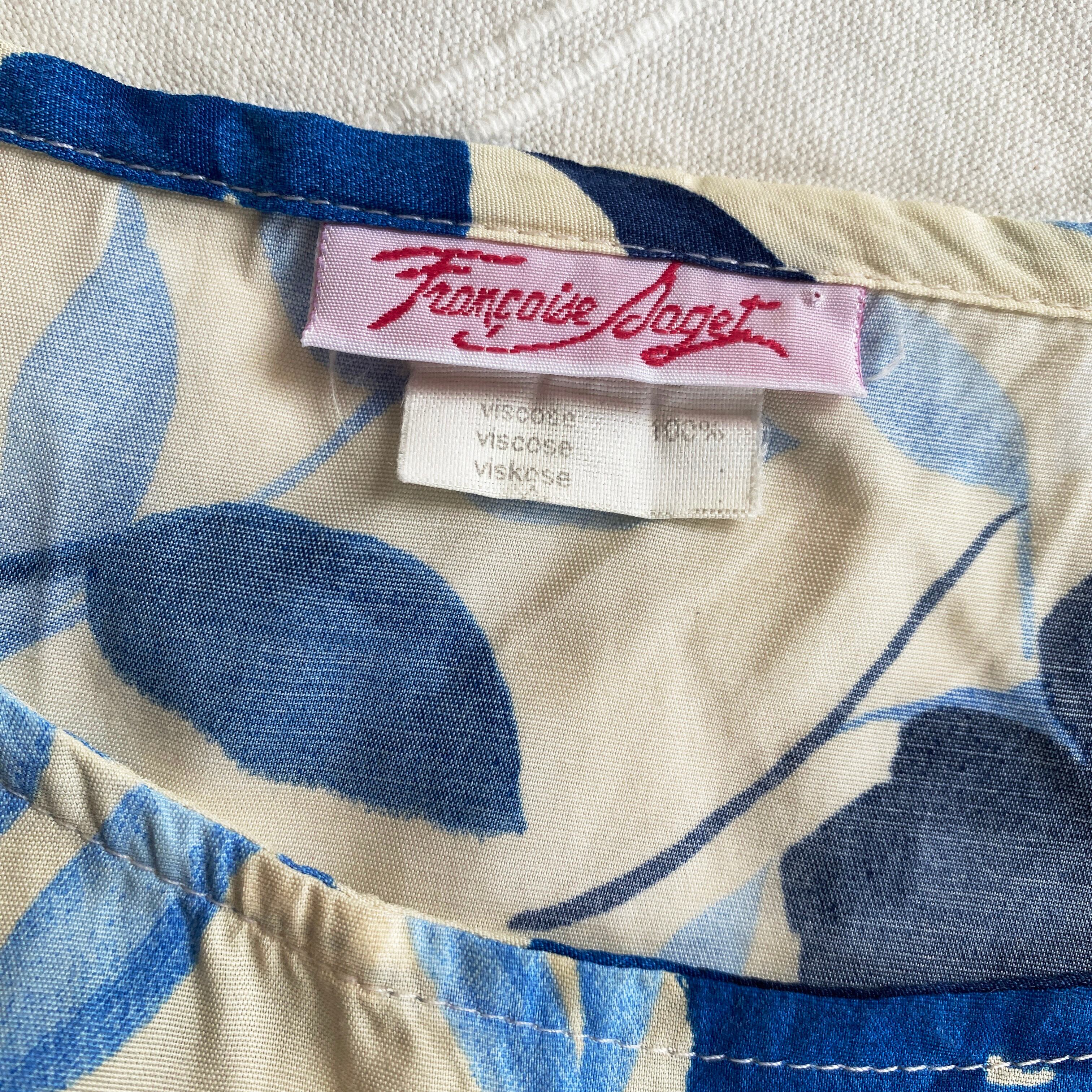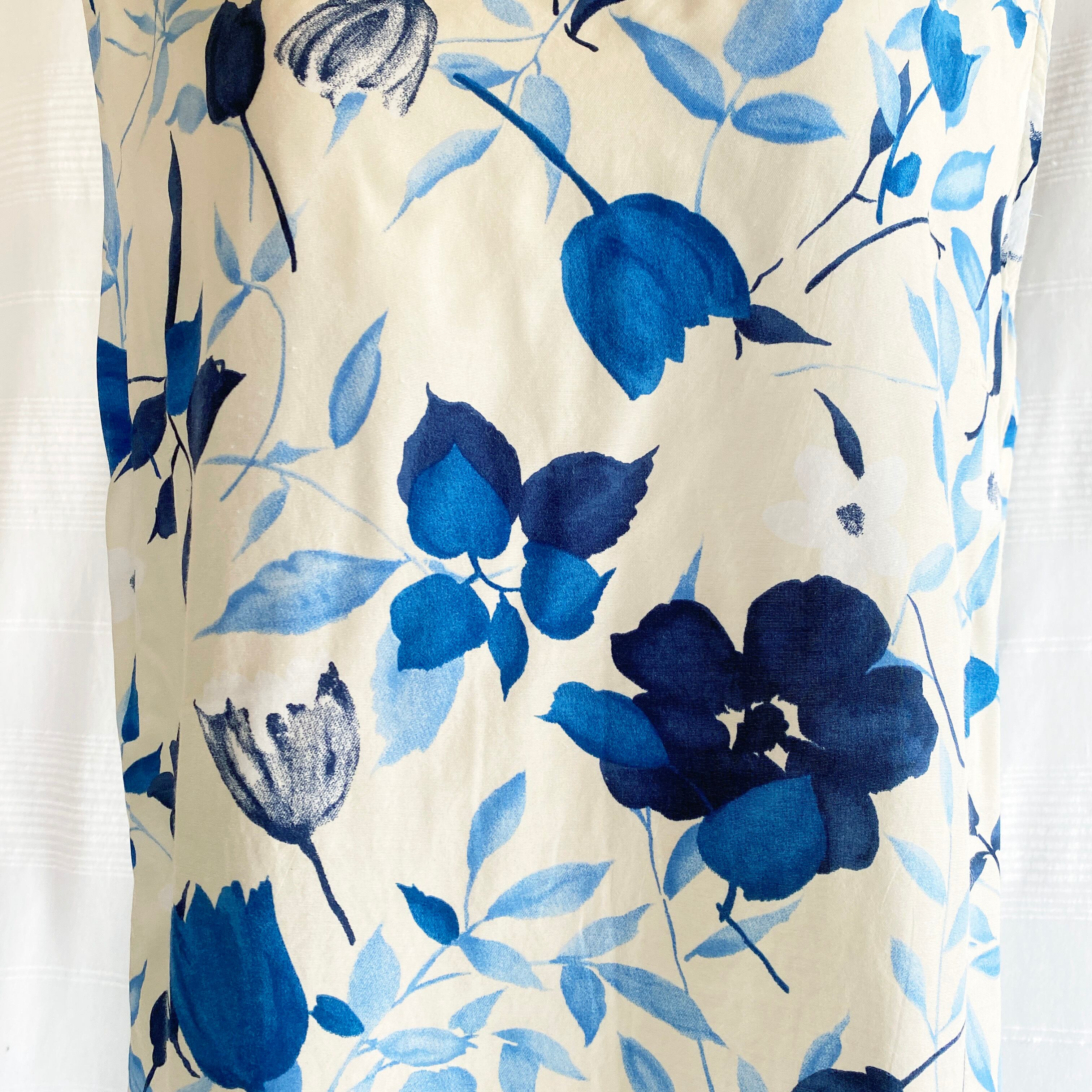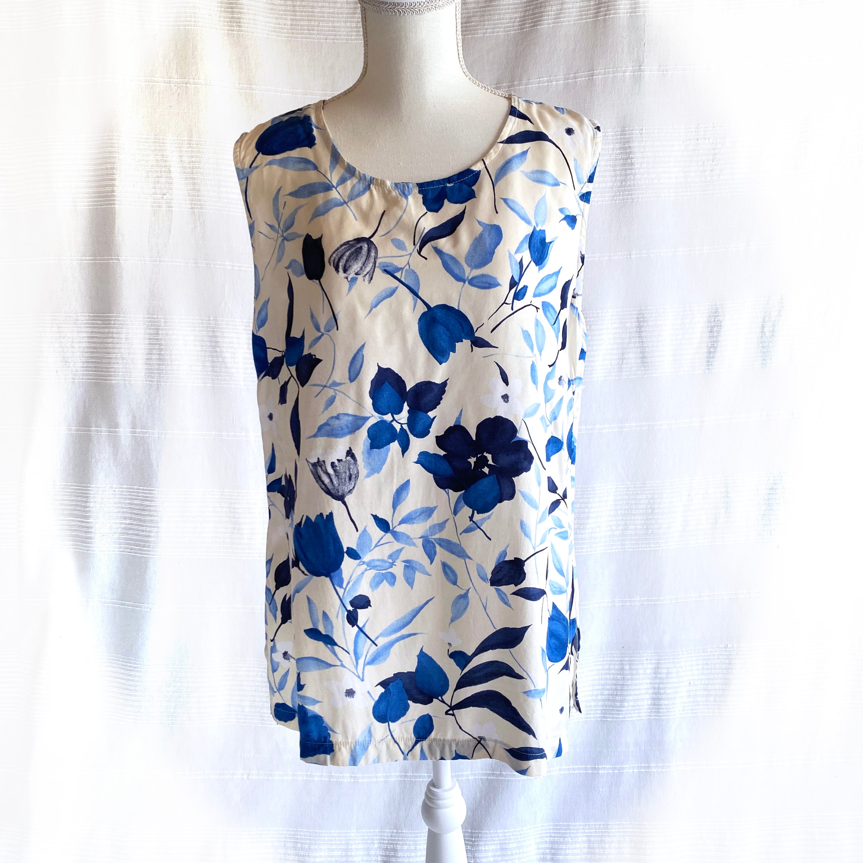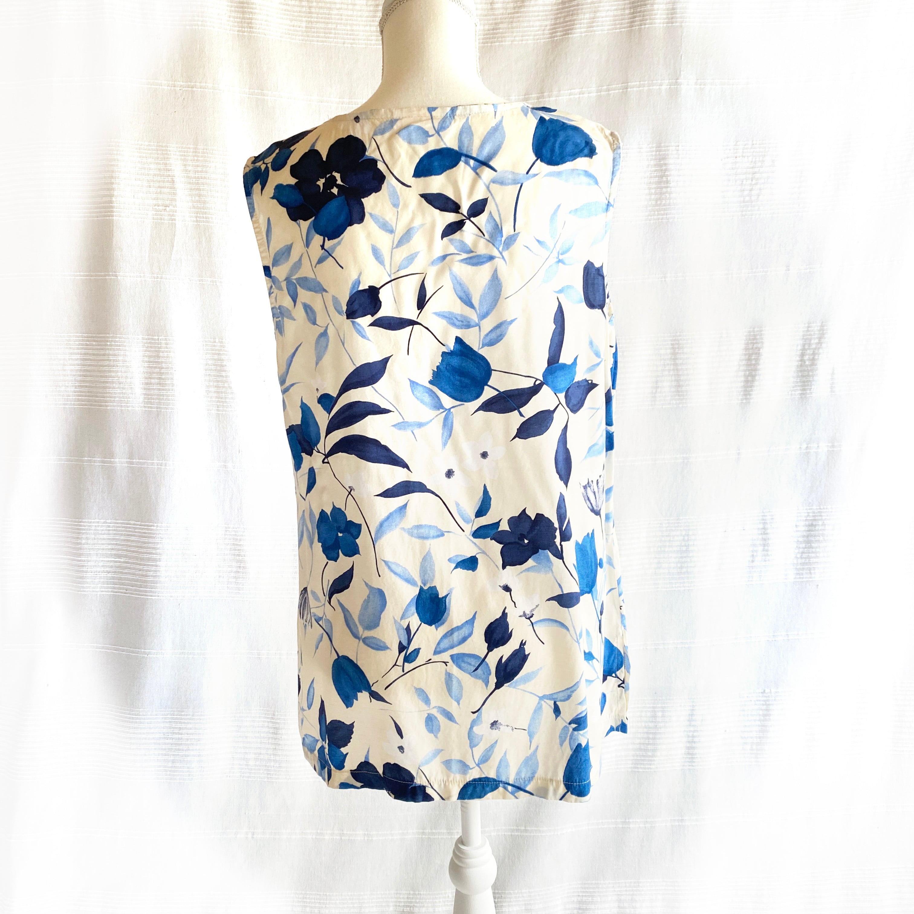 やわらかいクリーム地に白とブルーで描かれたレトロな花の模様のタンクトップ。