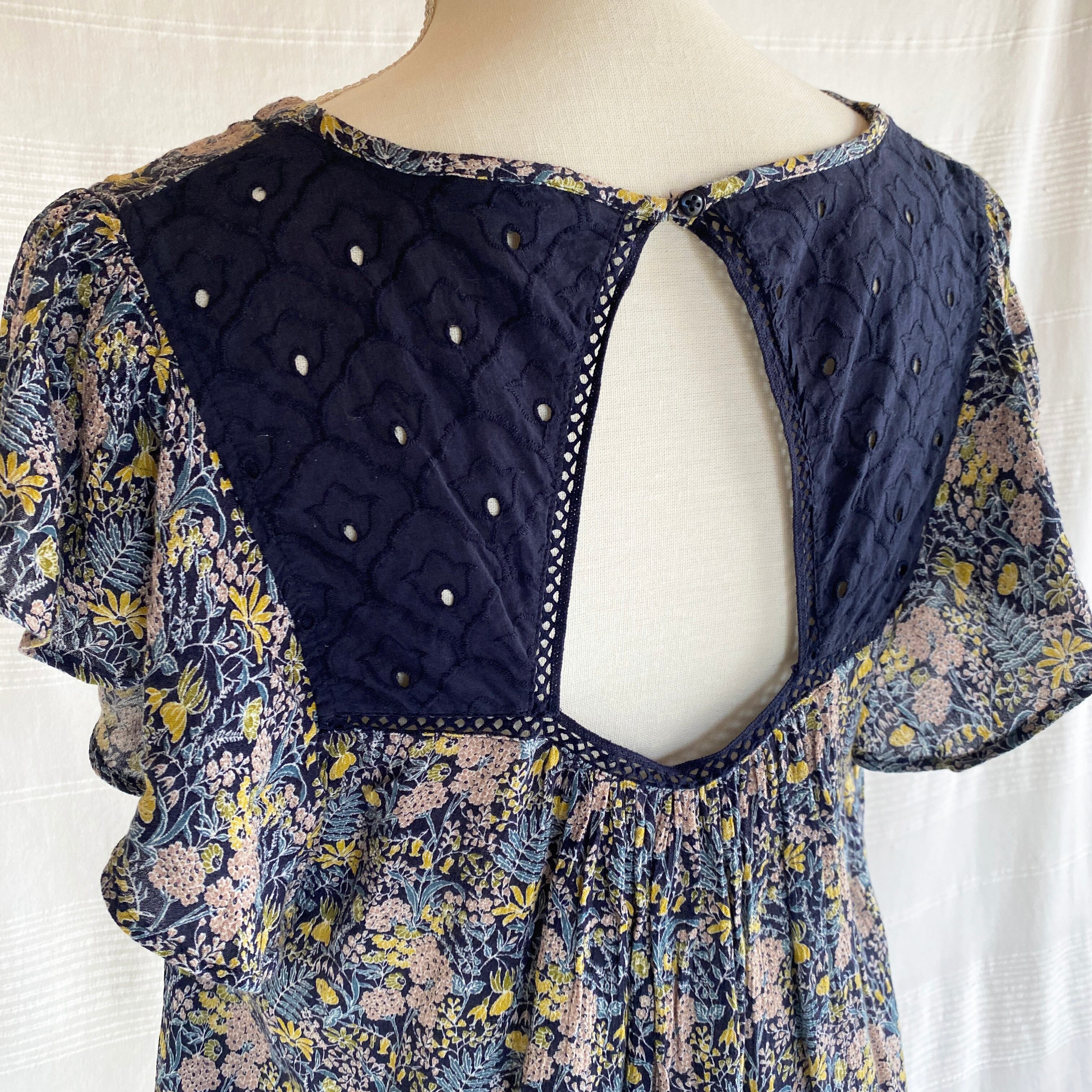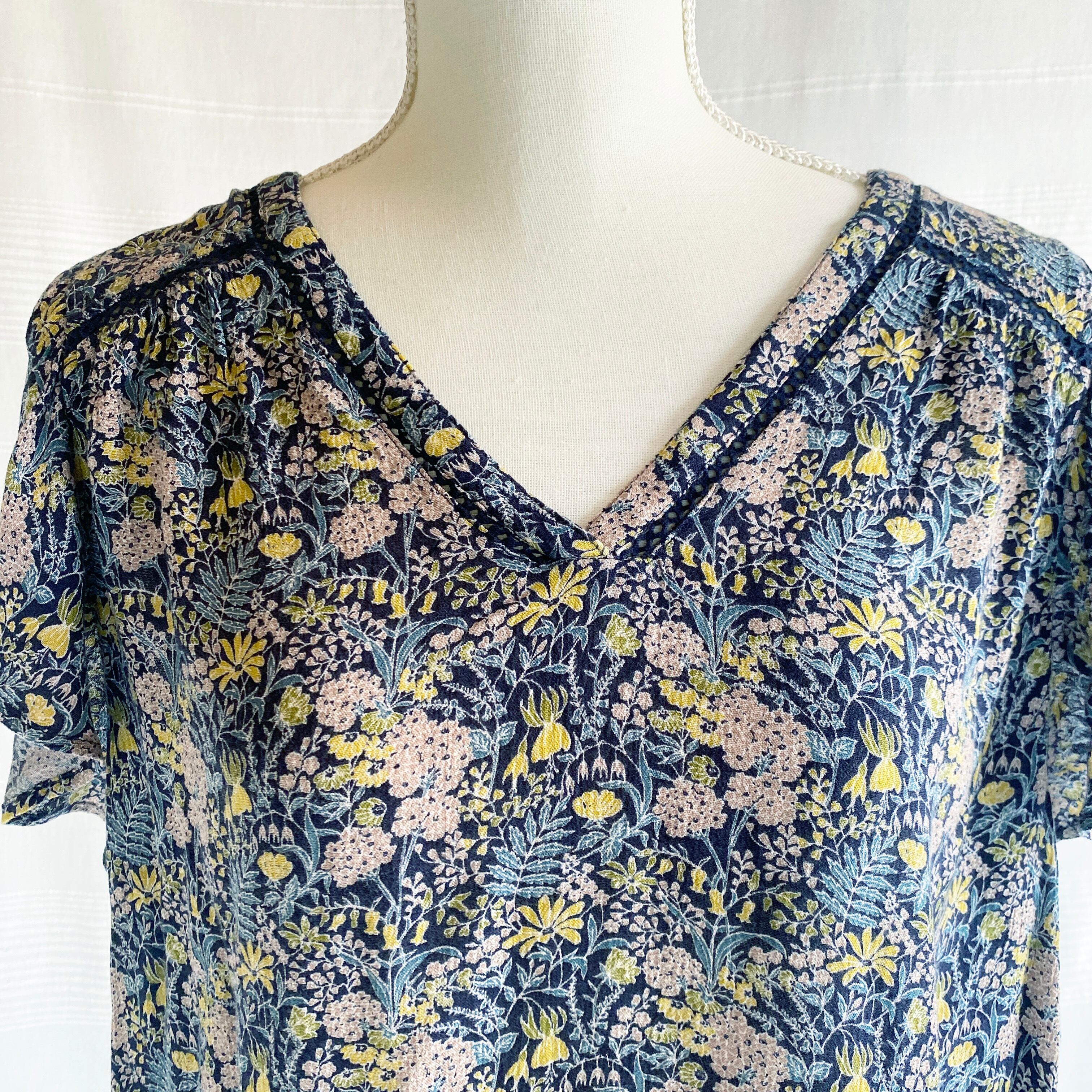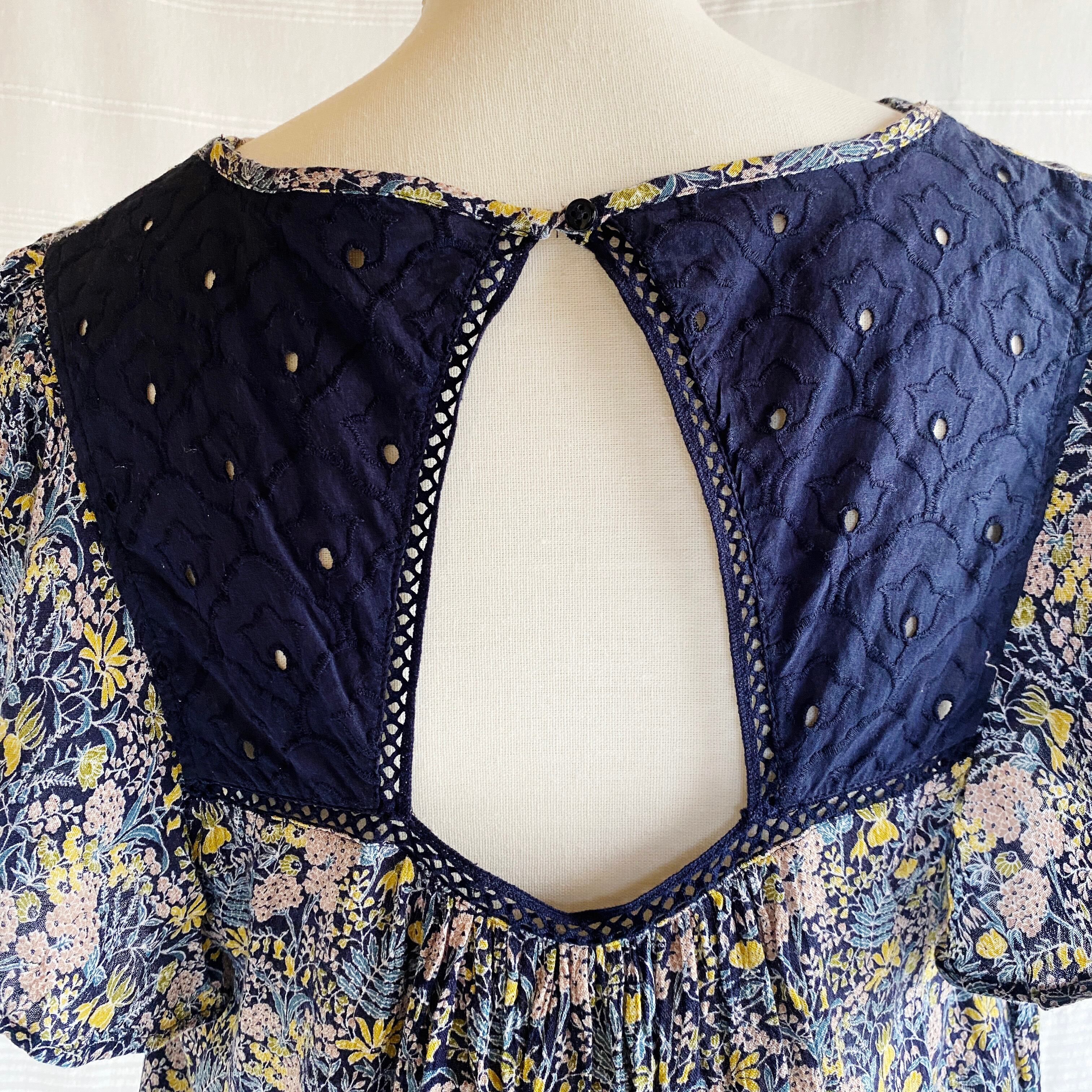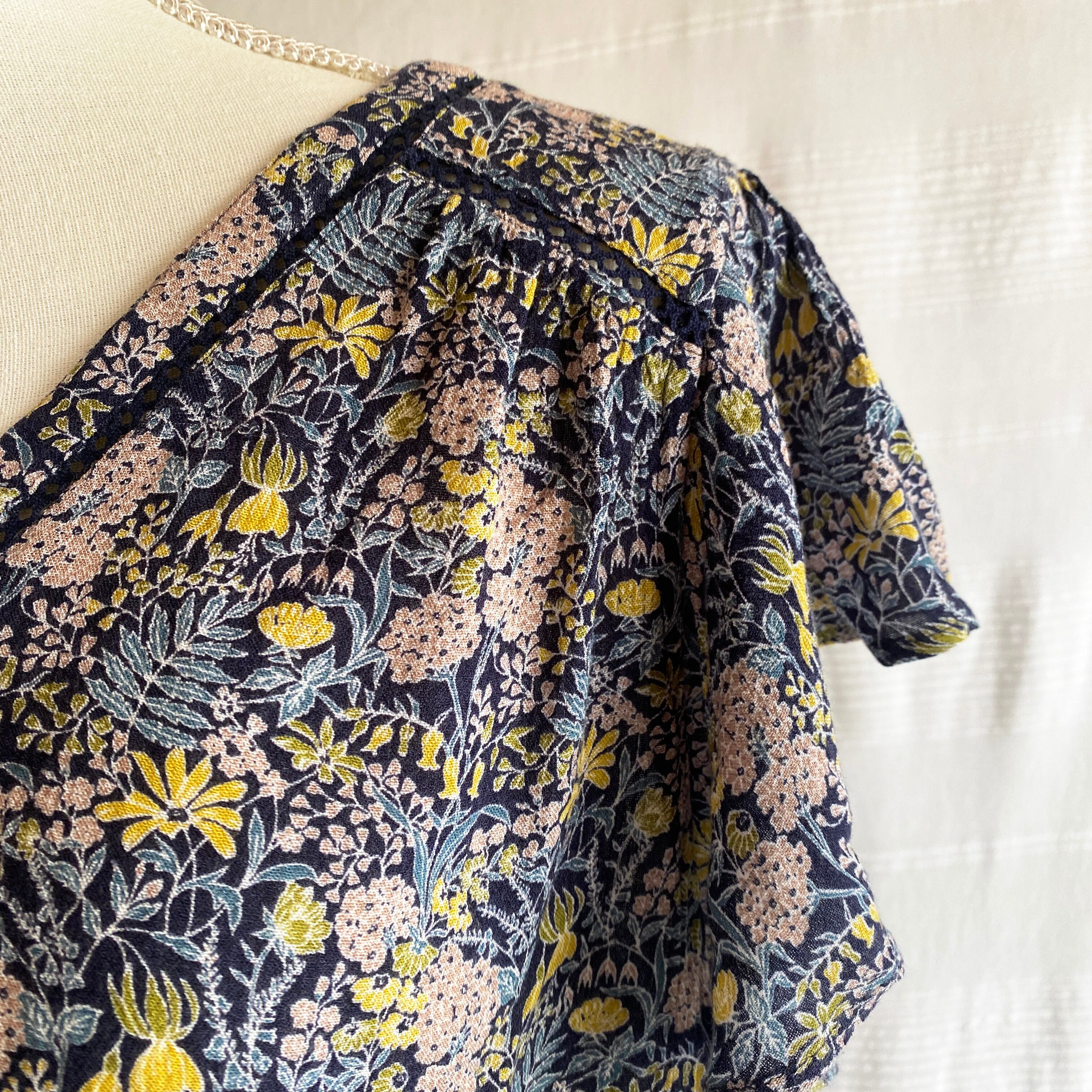 イエローとネイビーをベースに、細かいボタニカルプリントの切り替え、レースのパイピングや袖のフリルもかわいいトップスです。