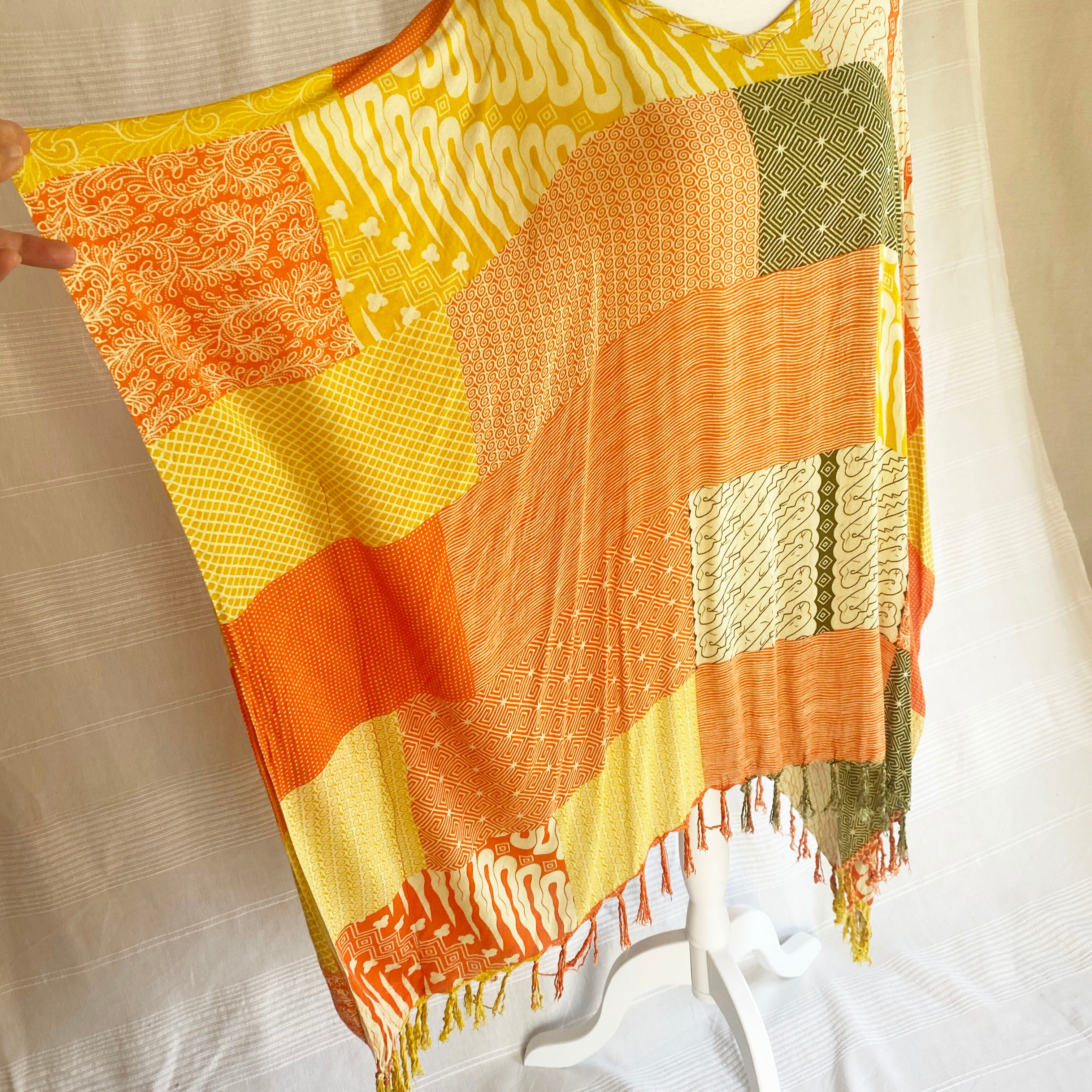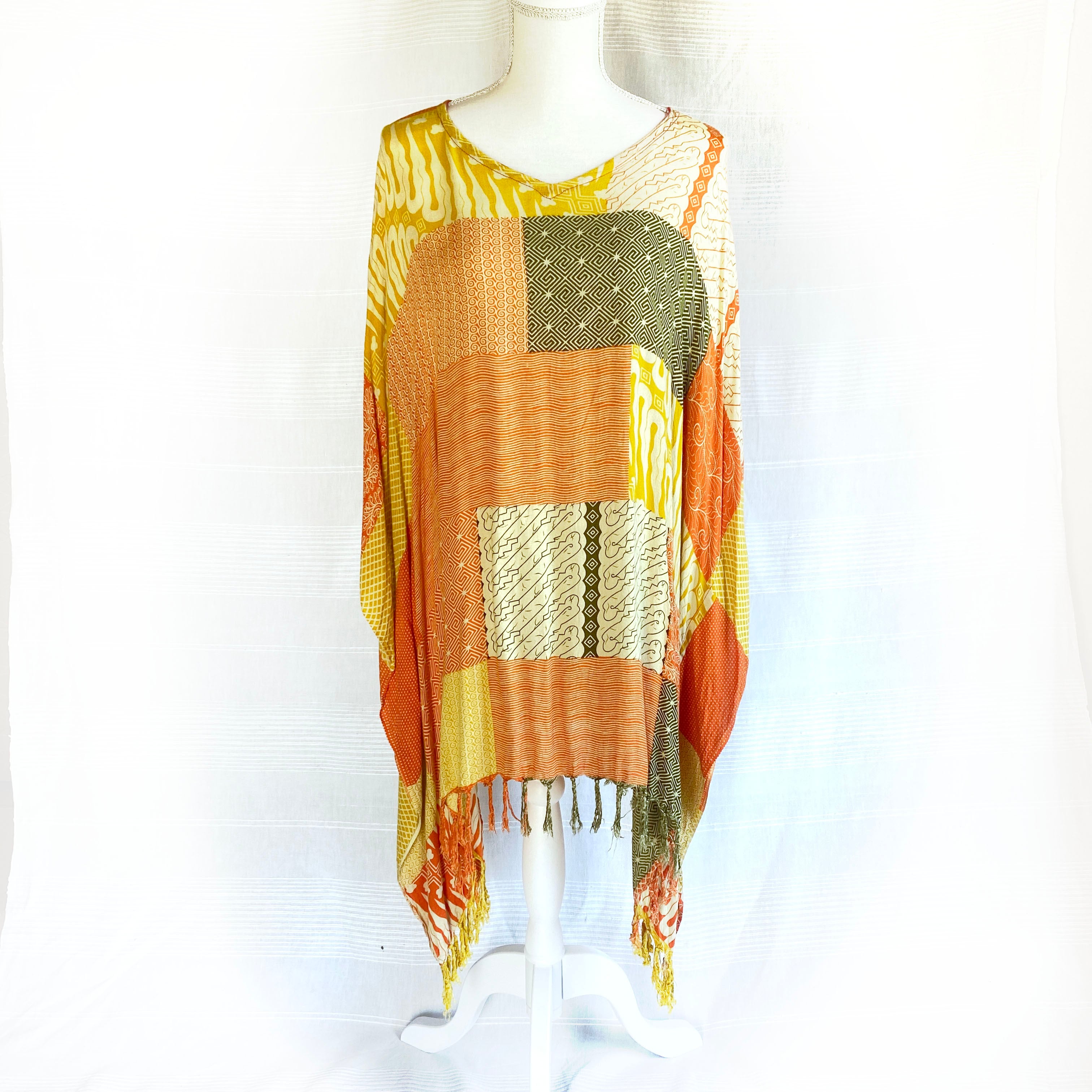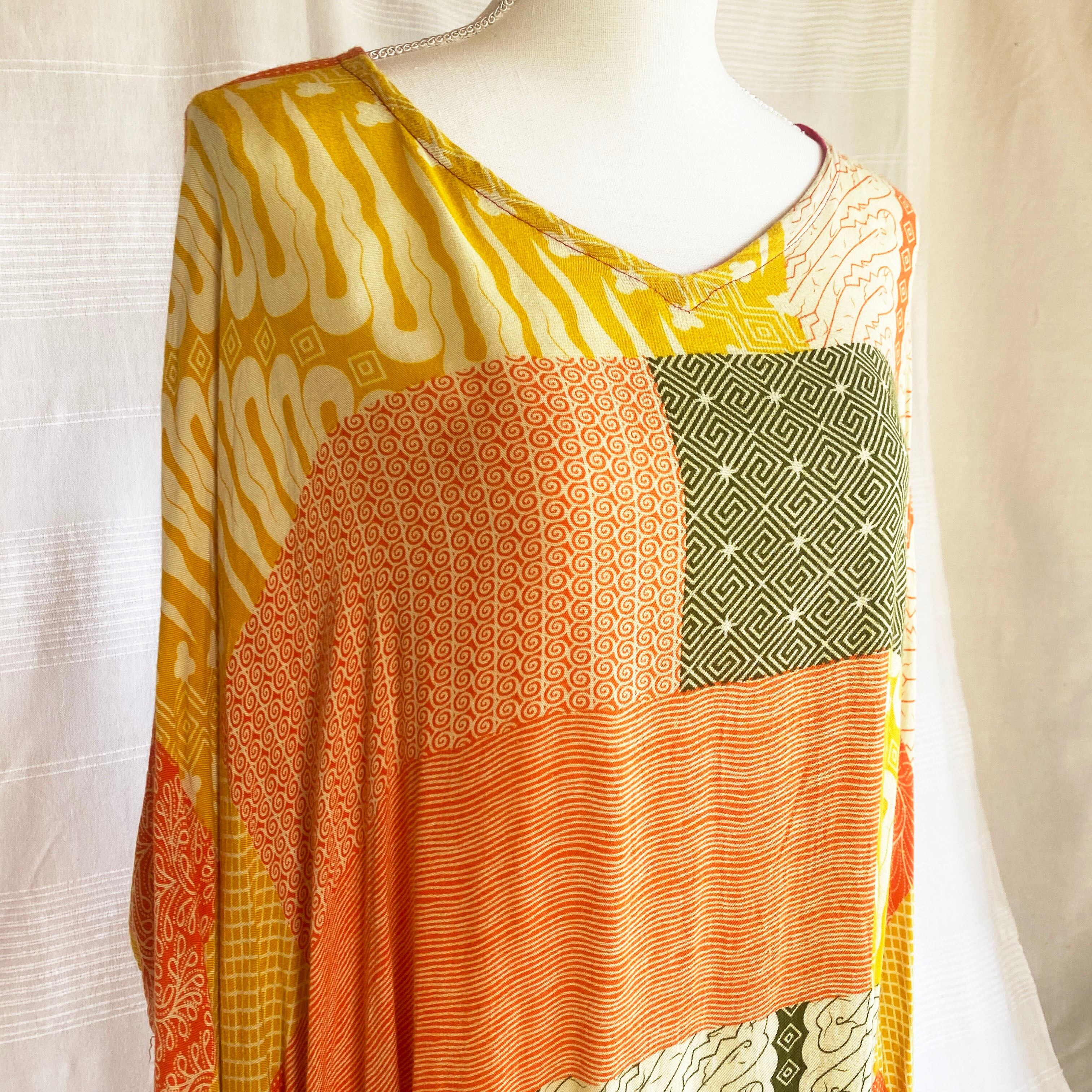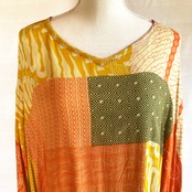 イエロー×オレンジ×カーキのパターンがプリントされたやわらかなスクエア生地の脇を縫い合わせたチュニック。