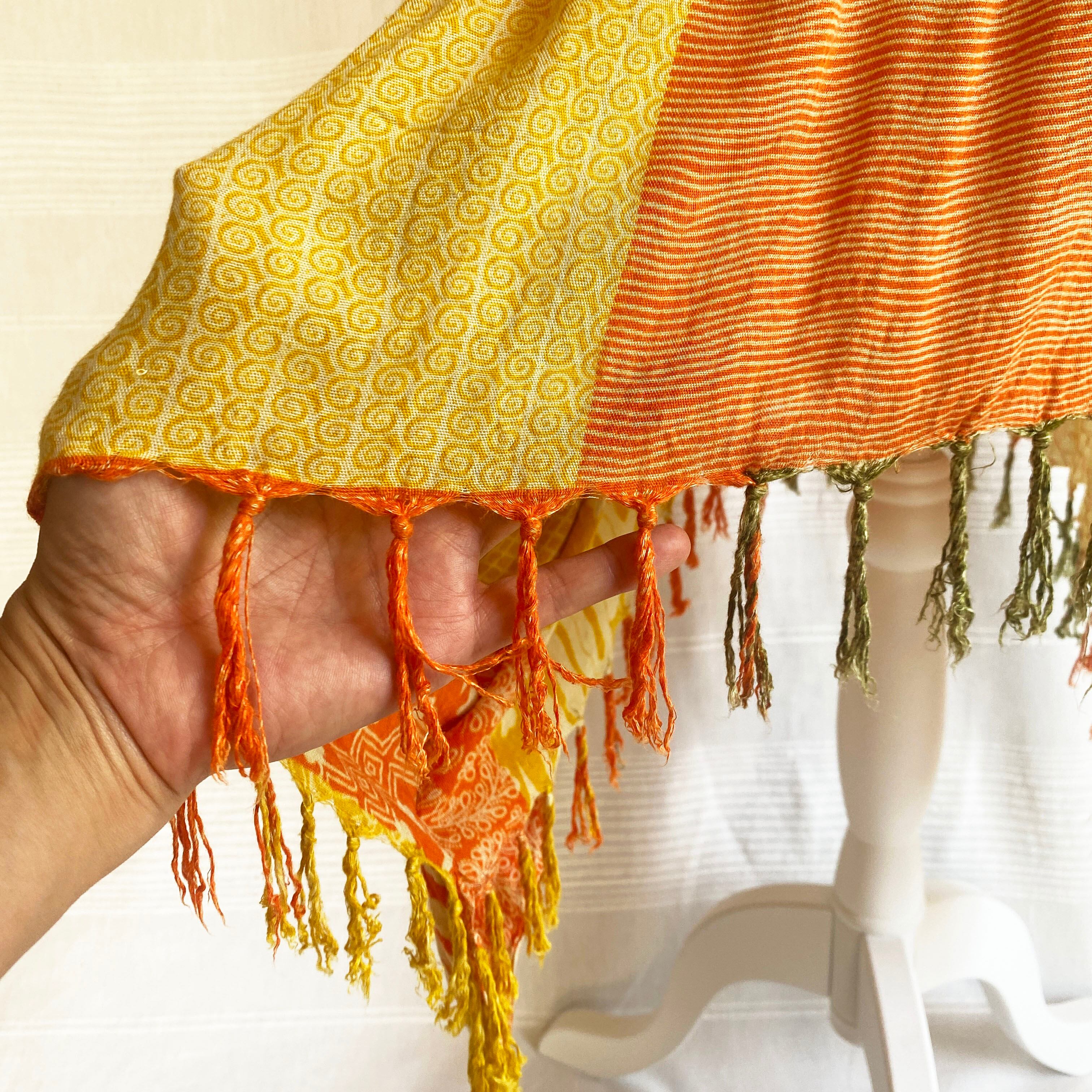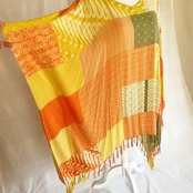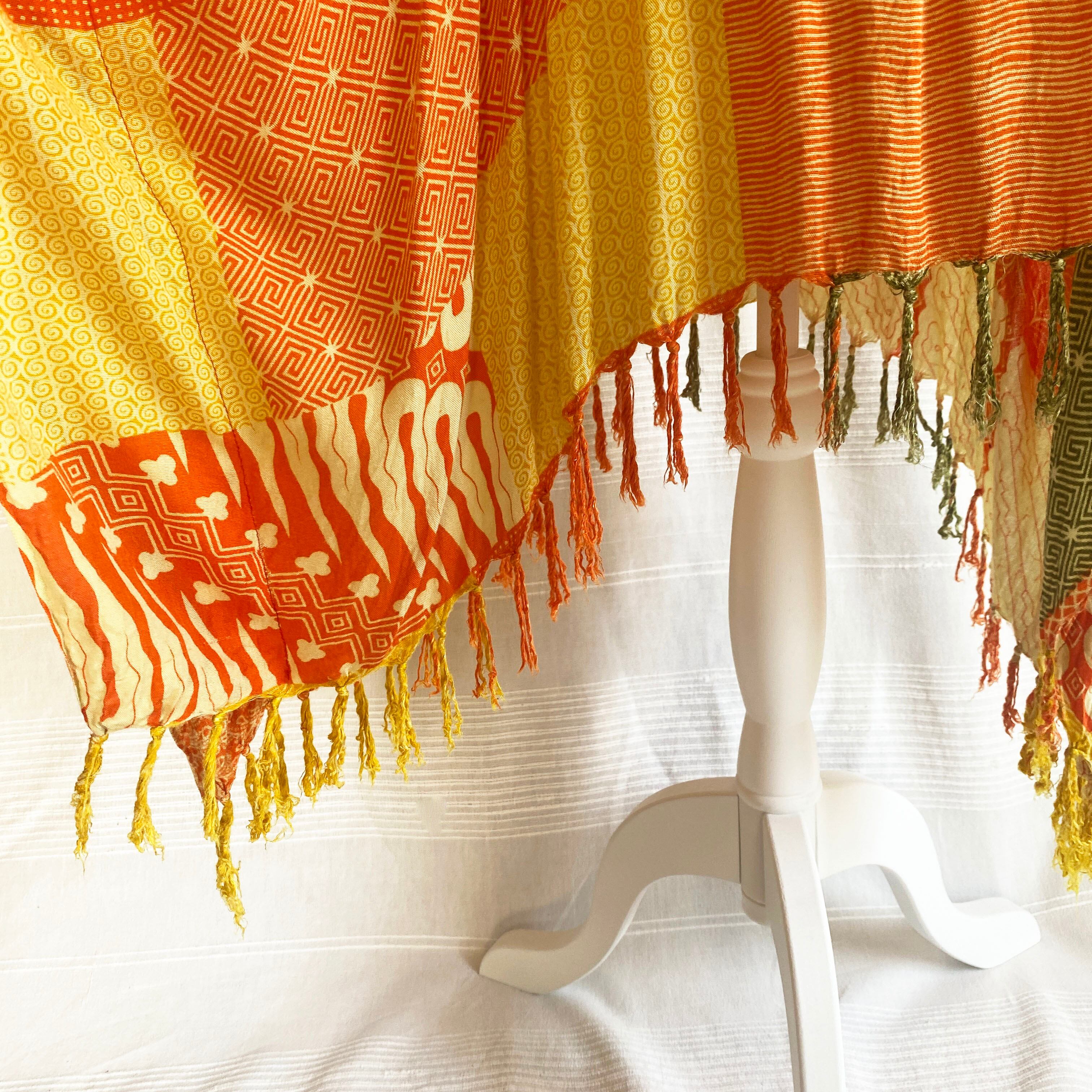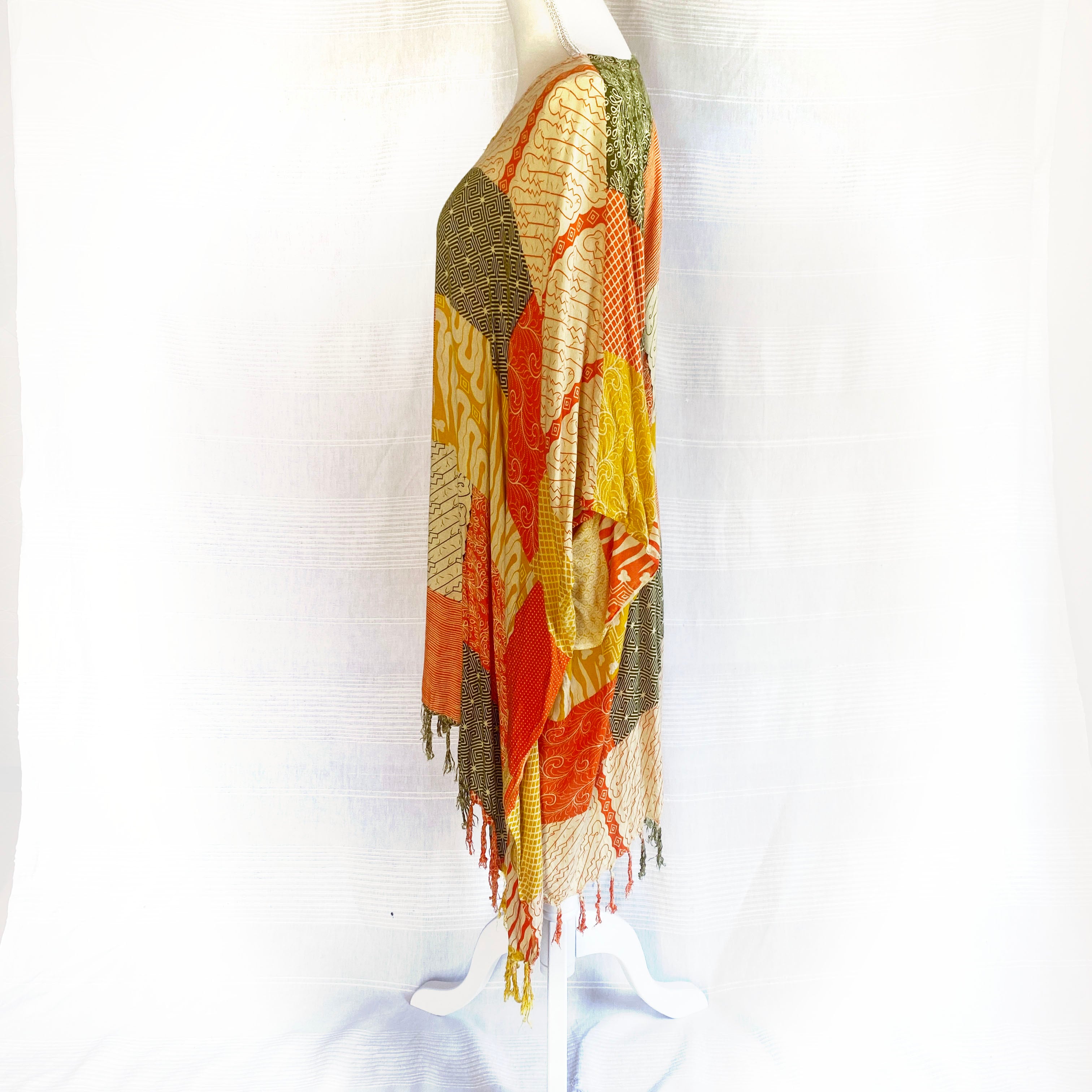 イエロー×オレンジ×カーキのパターンがプリントされたやわらかなスクエア生地の脇を縫い合わせたチュニック。