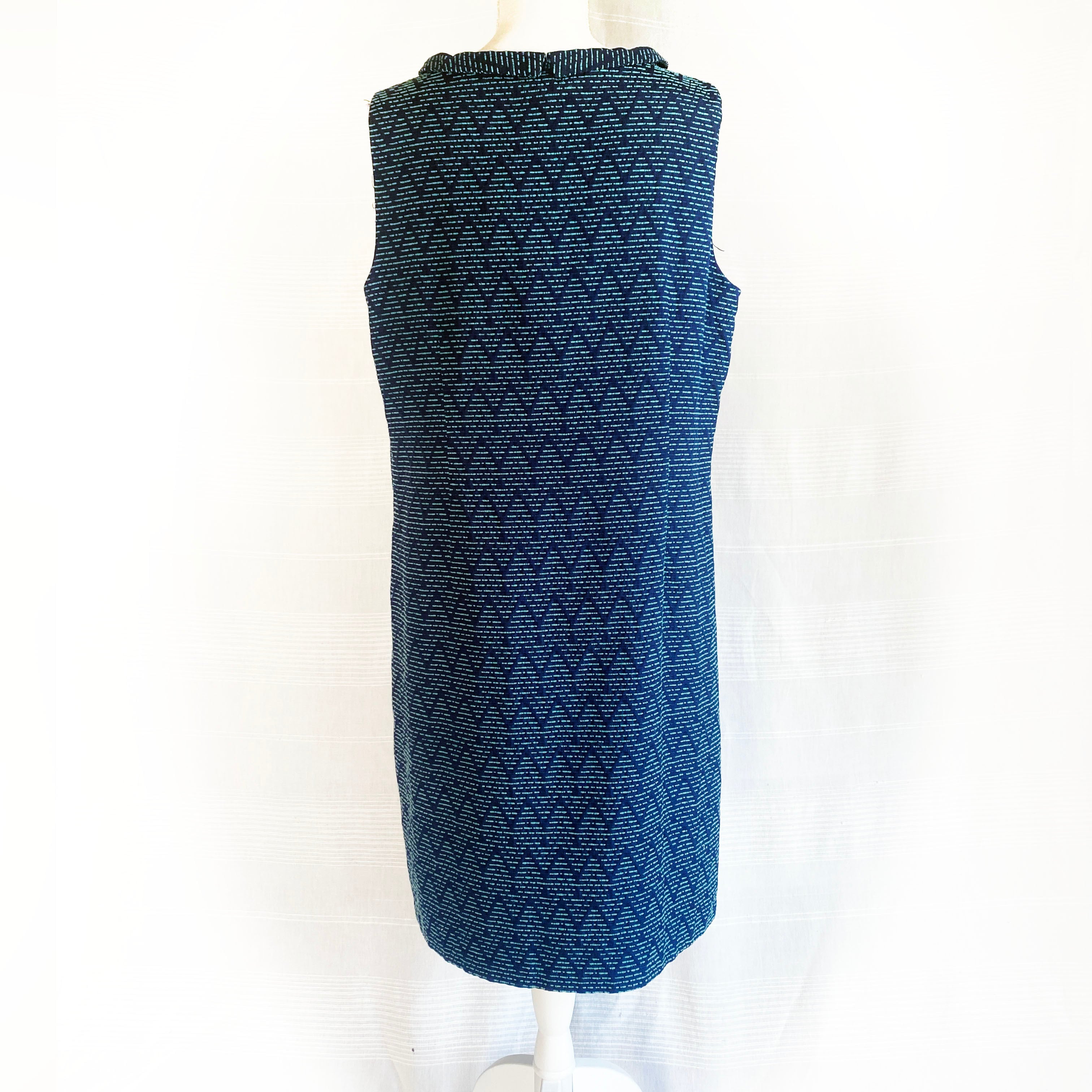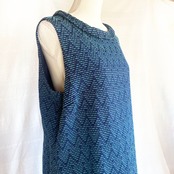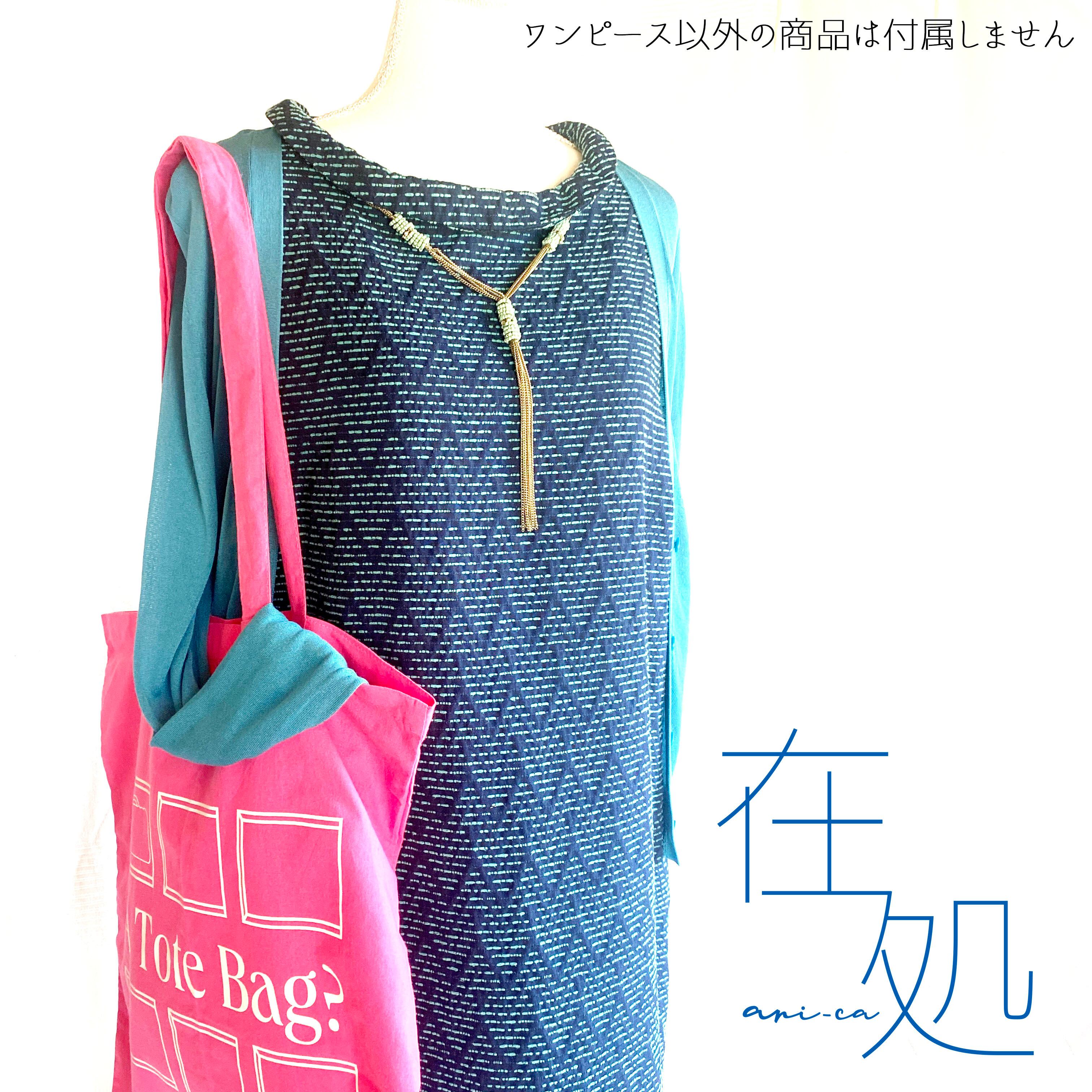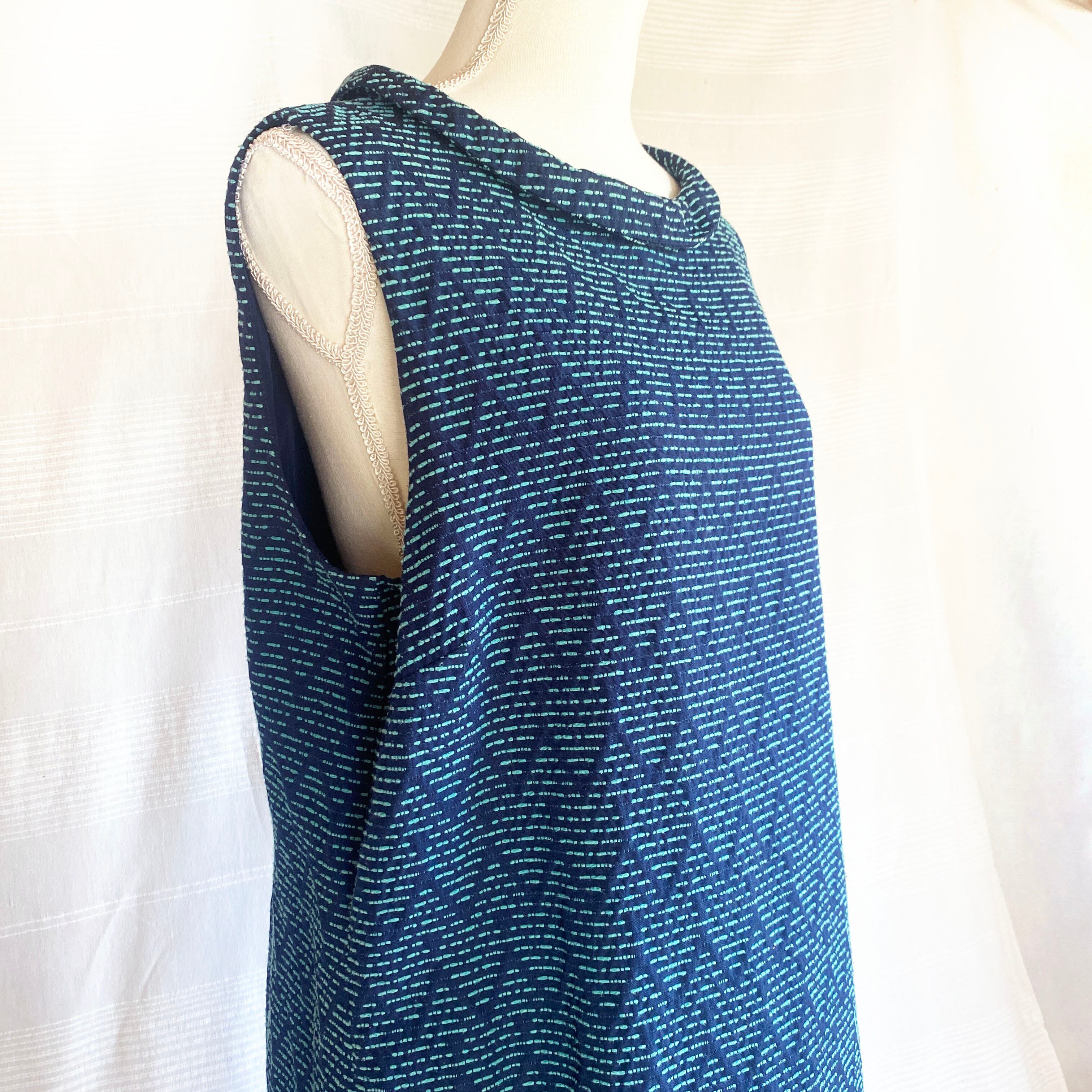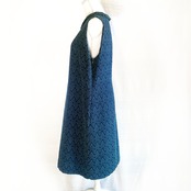 ネイビーにブルーグリーンの糸でランダムボーダーの刺繍が離れてみるとジグザグとドットの模様に見えるノースリーブドレス。