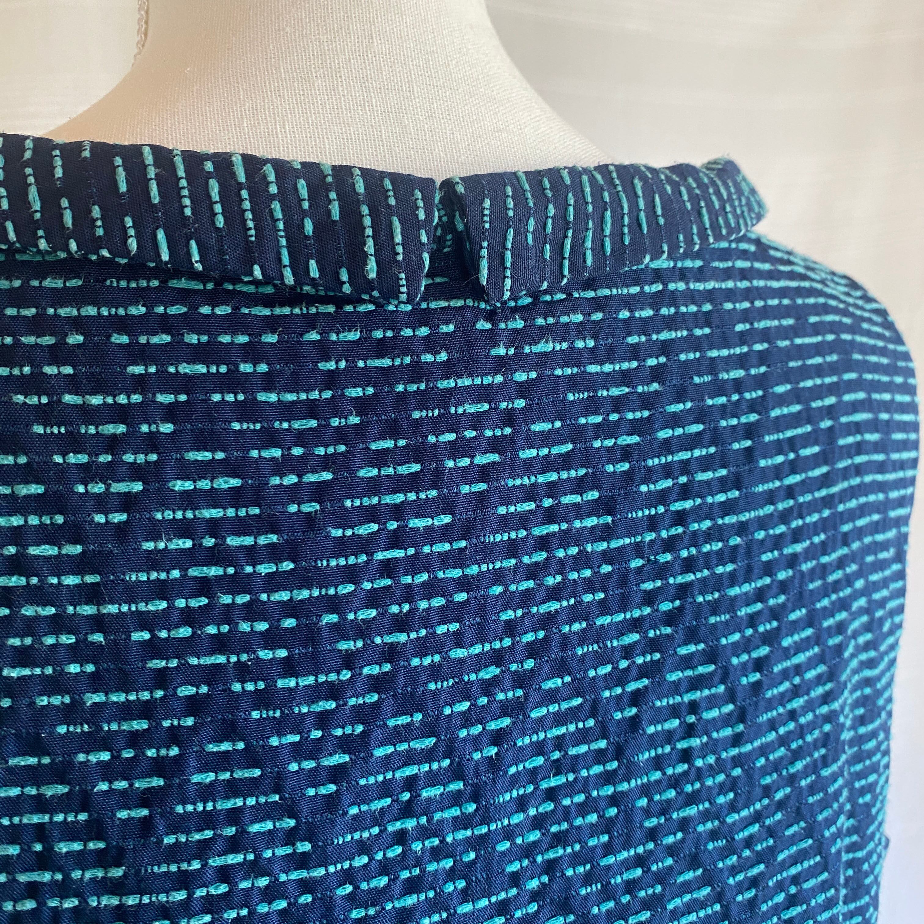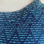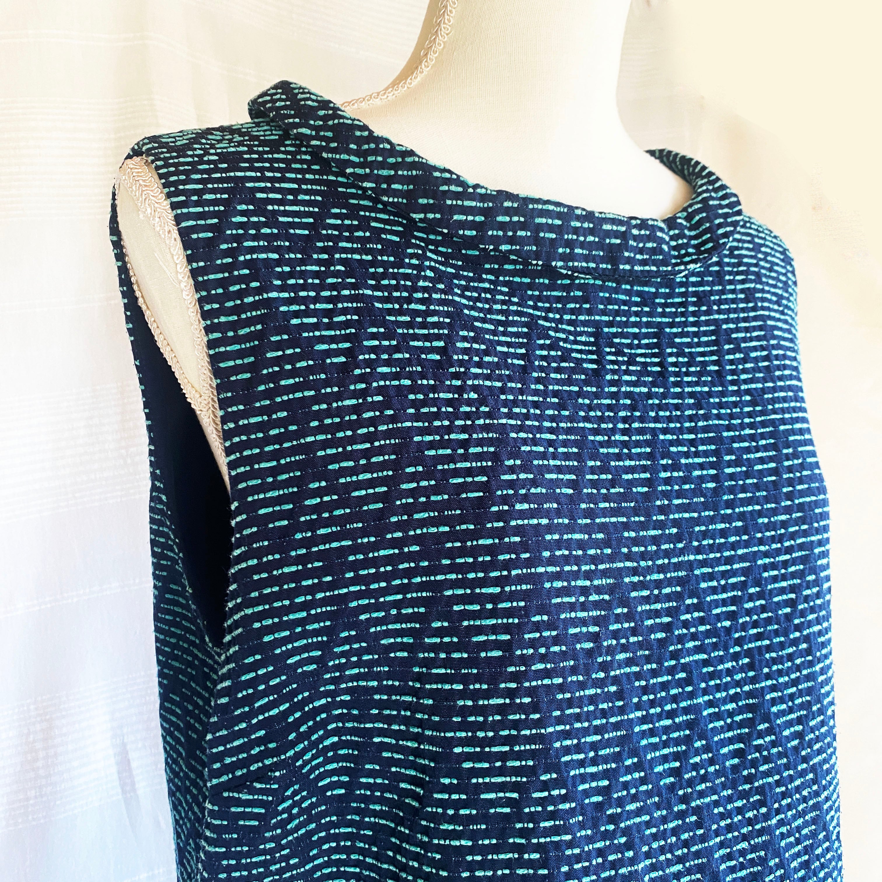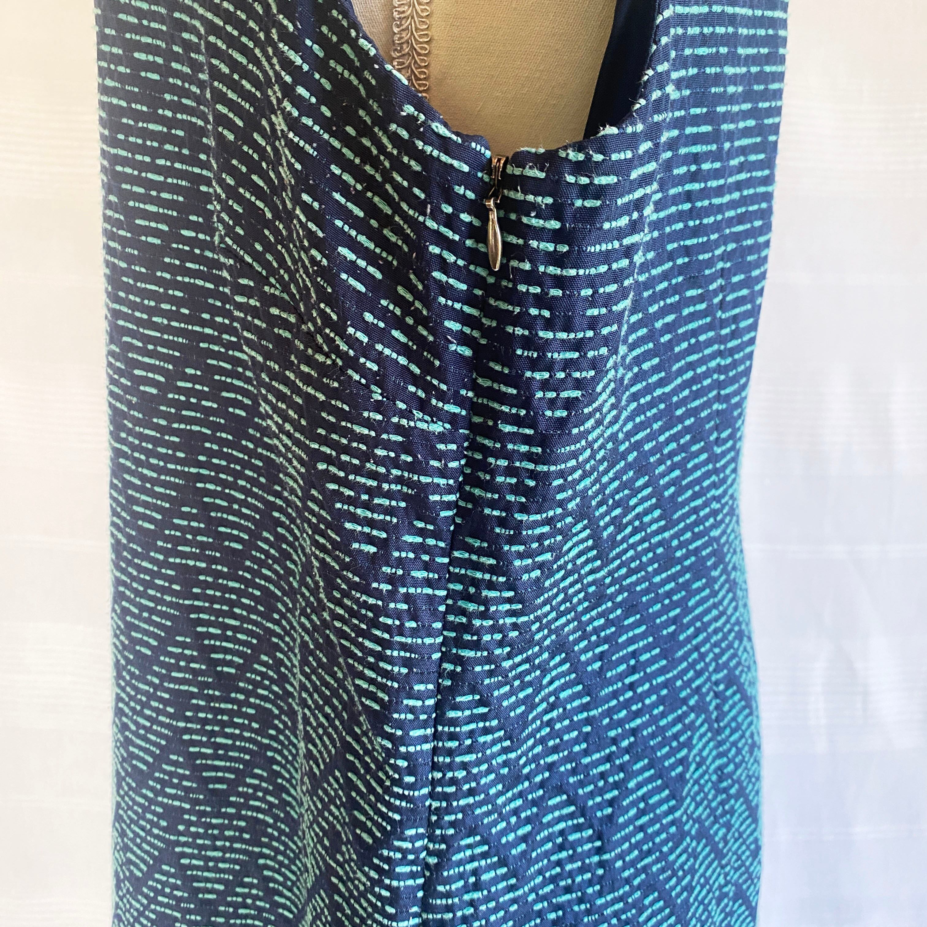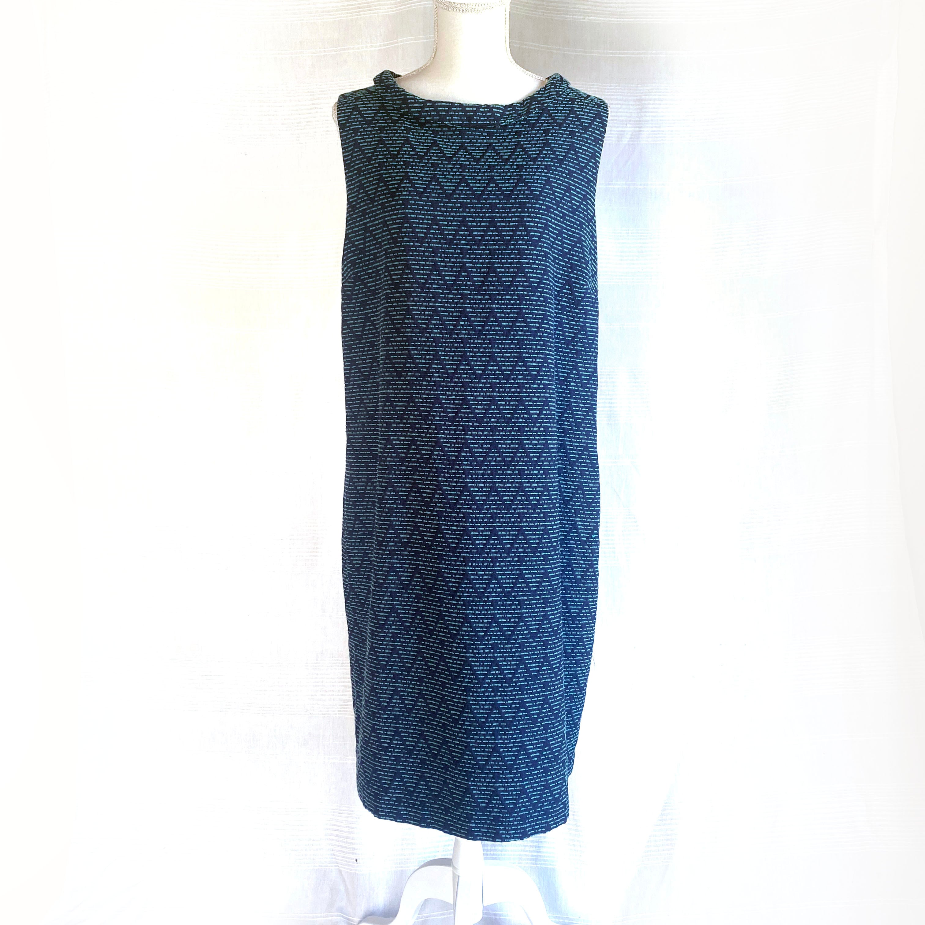 ネイビーにブルーグリーンの糸でランダムボーダーの刺繍が離れてみるとジグザグとドットの模様に見えるノースリーブドレス。