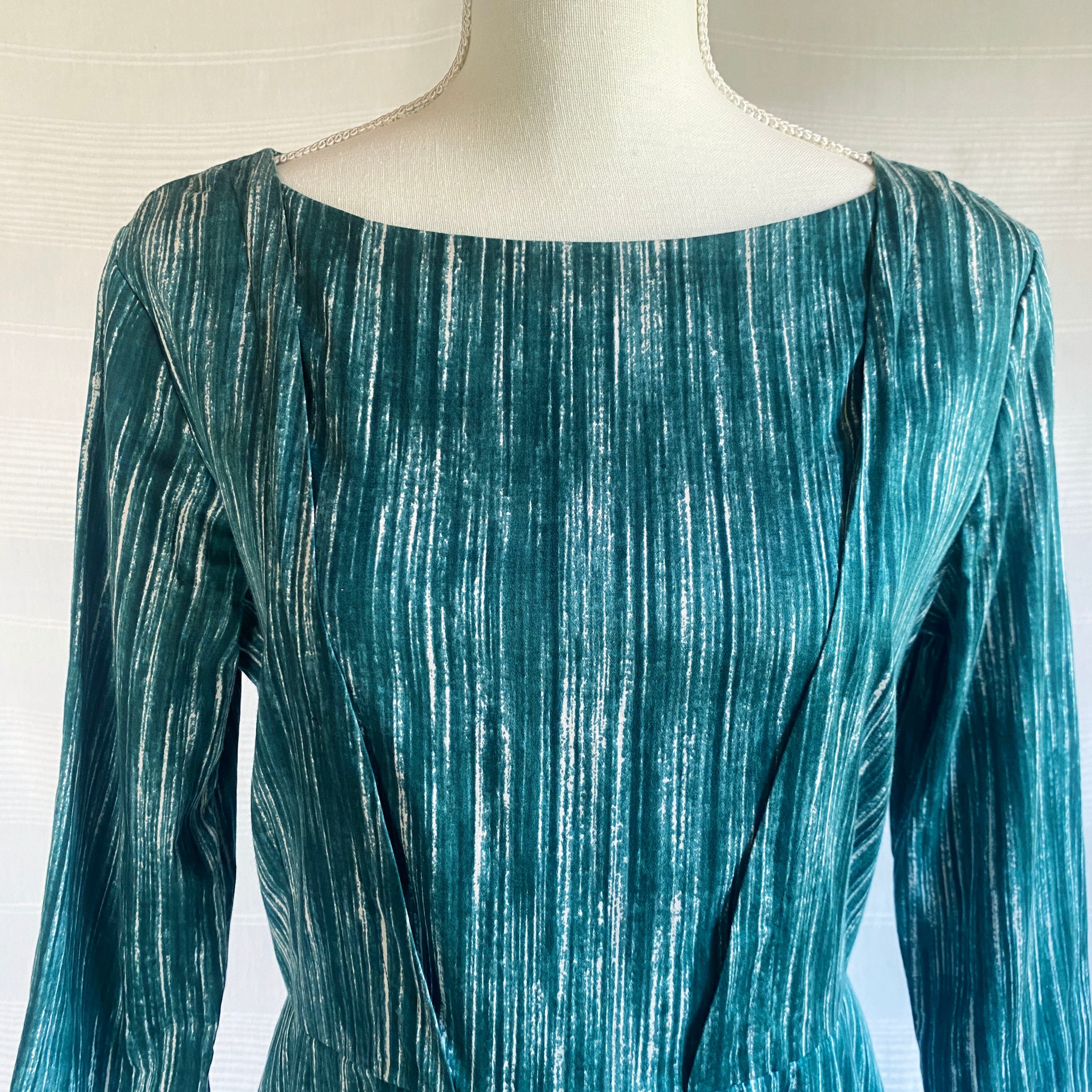 上半身の斜めの切り替えや、ウエスト下のギャザーが体にフィットしてくれるスマートな一枚です。