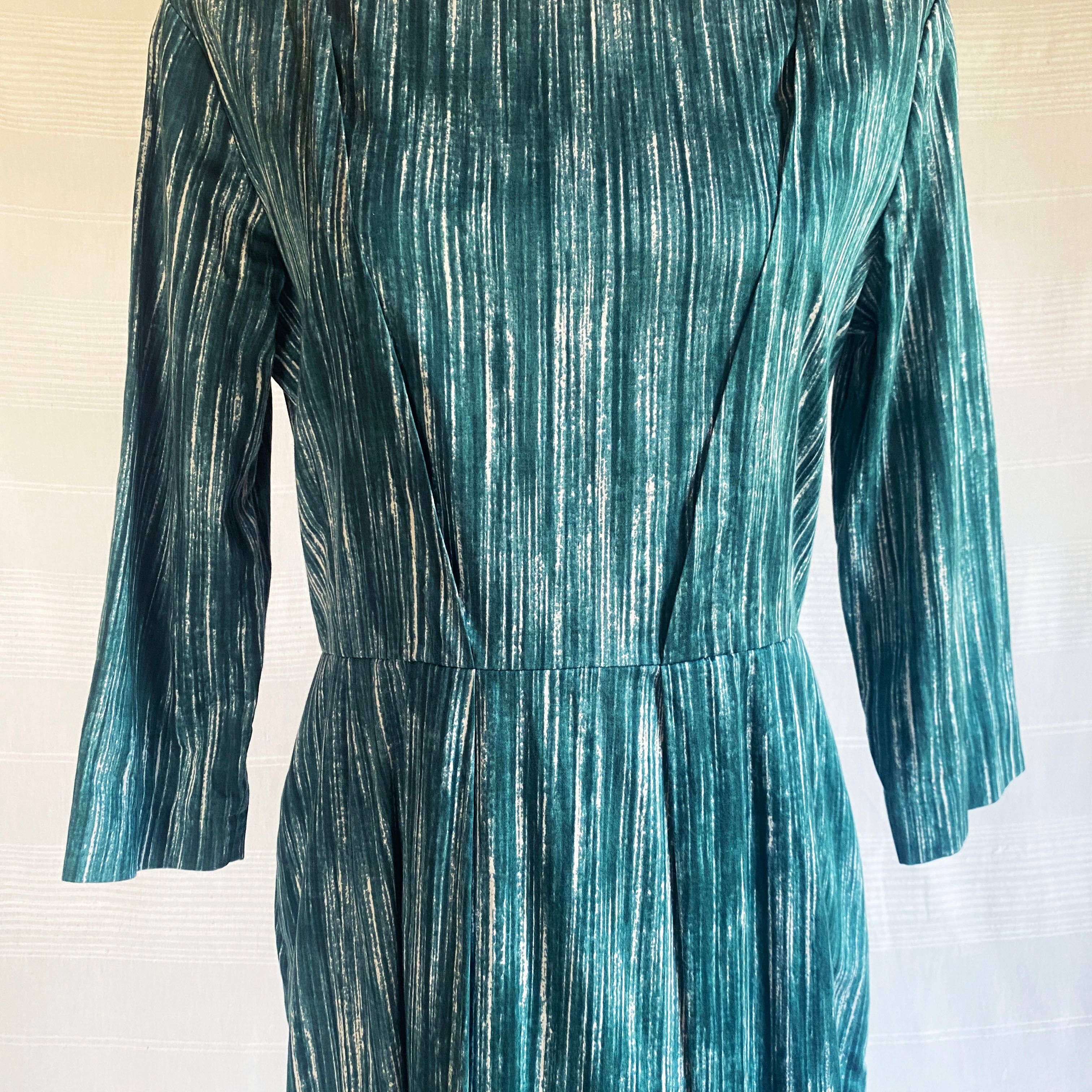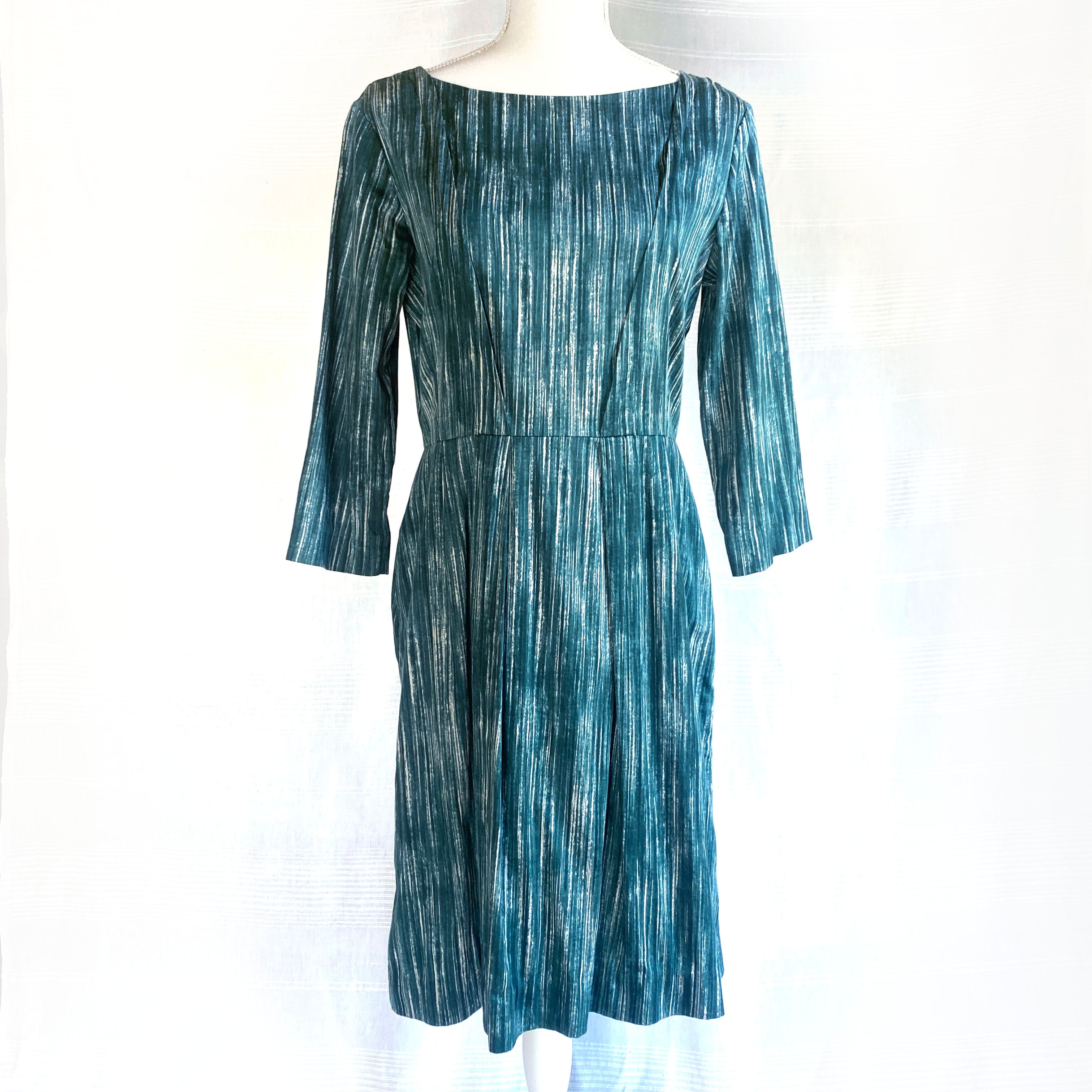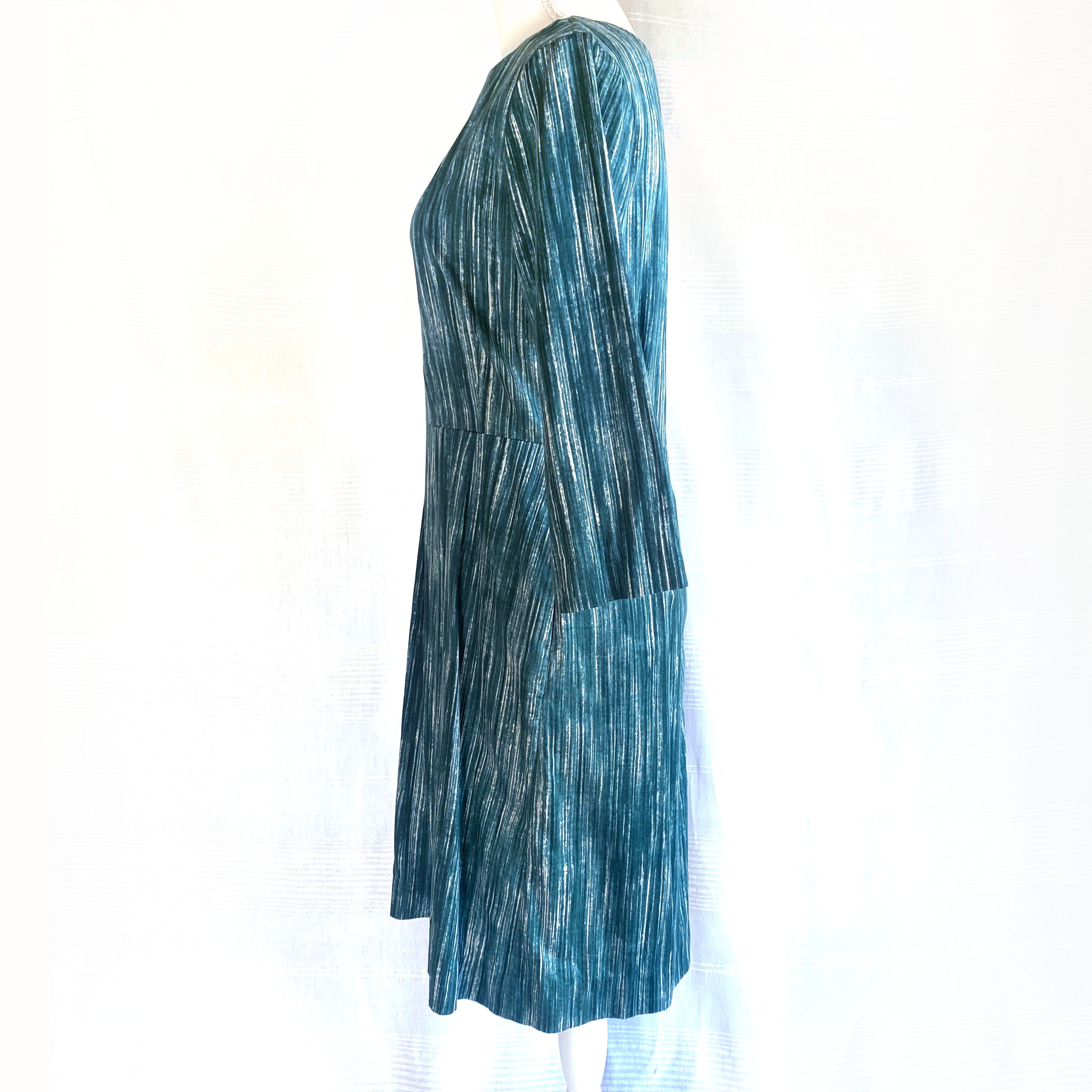 刷毛で塗ったようなランダムな縦ストライプがシャープな印象のドレス。