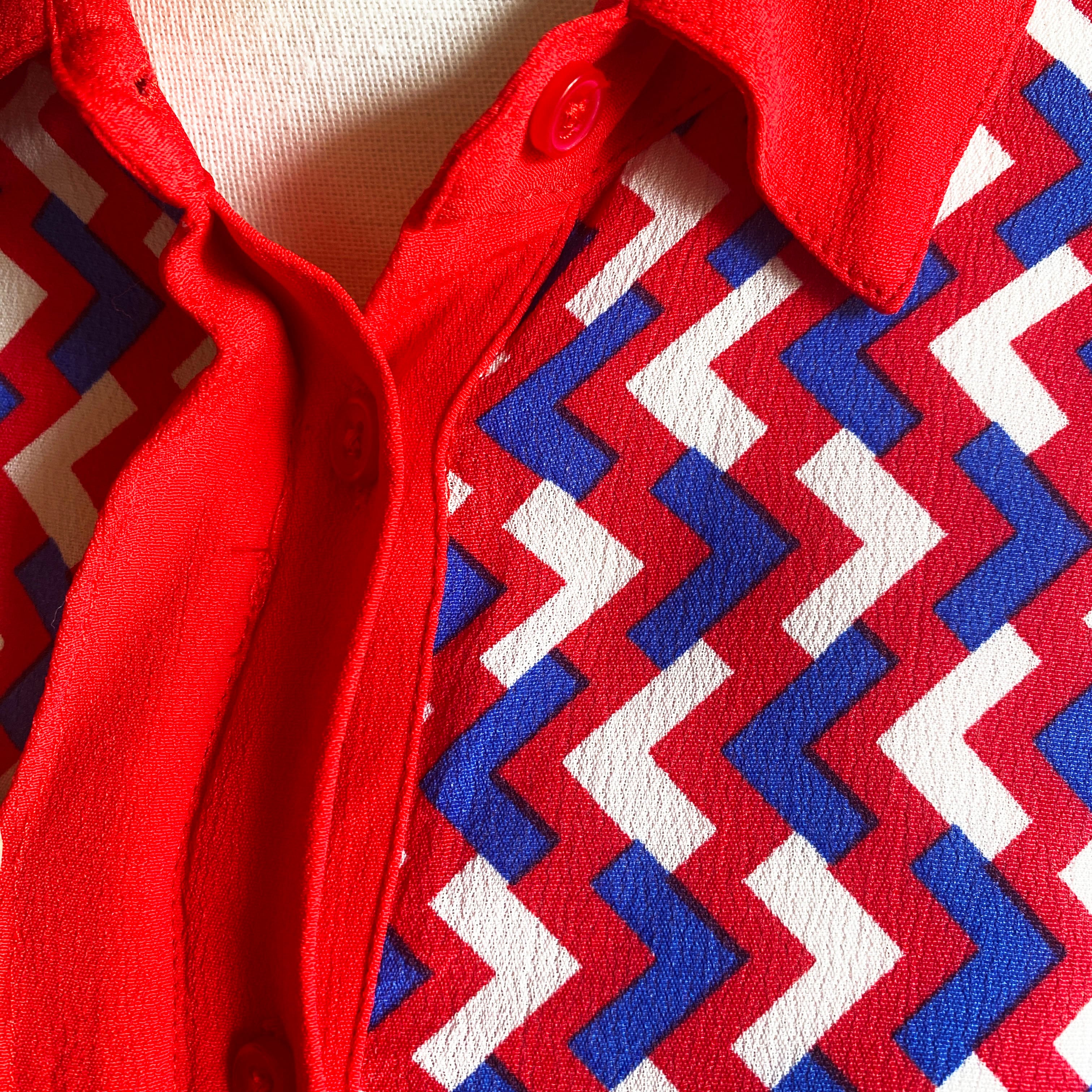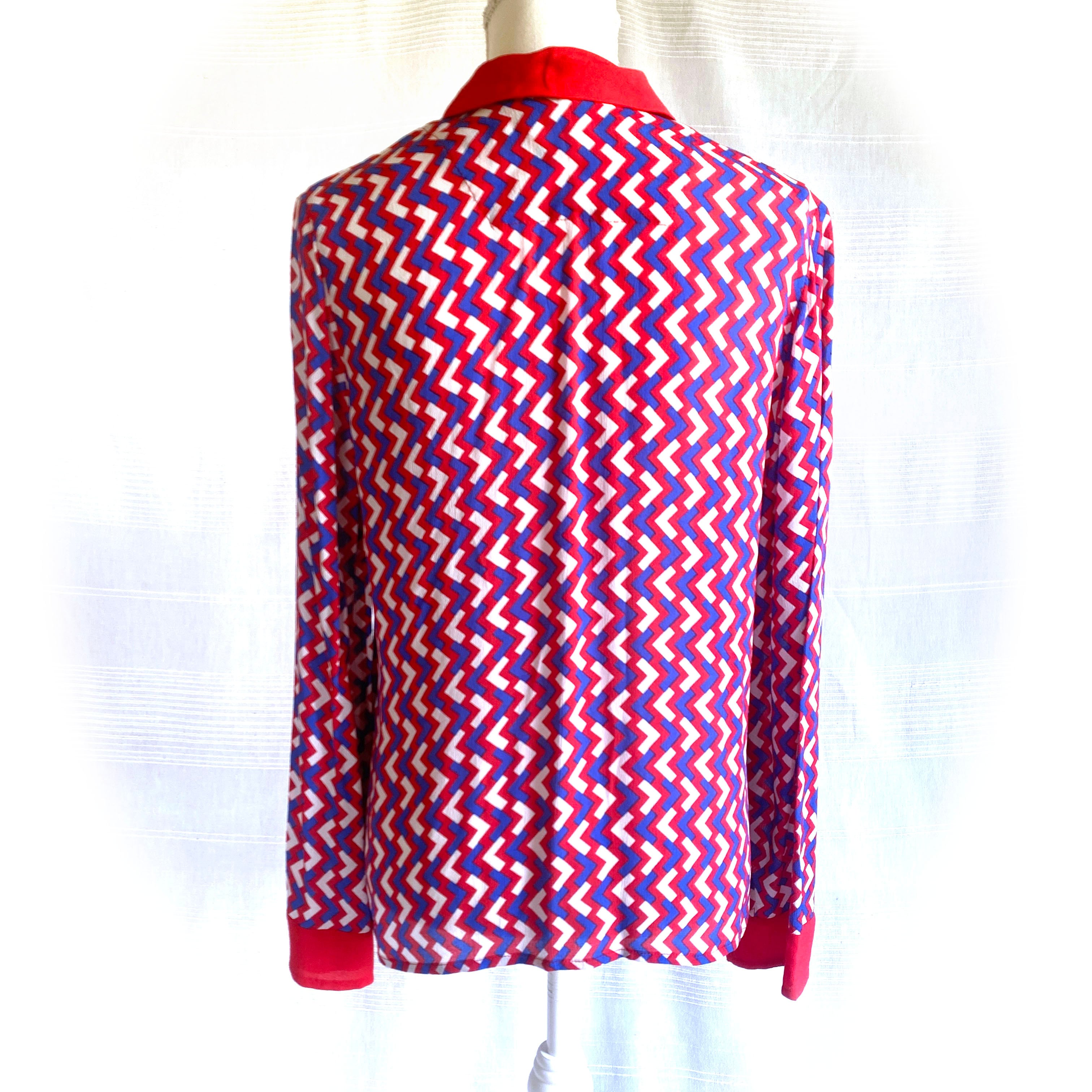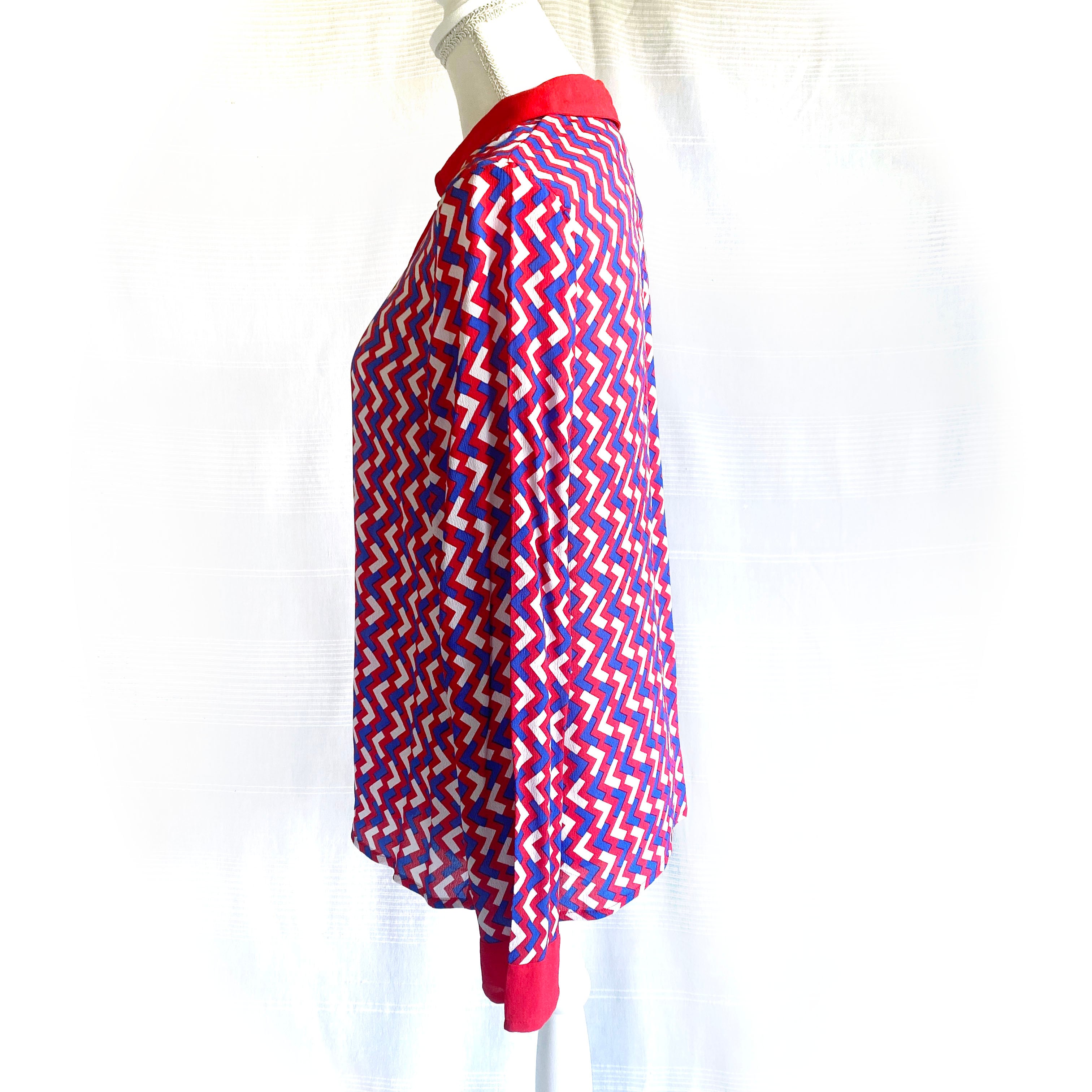 真っ赤にホワイト×ブルーのあざやかな三角模様がプリントされたヴィヴィッドな長袖シャツ。