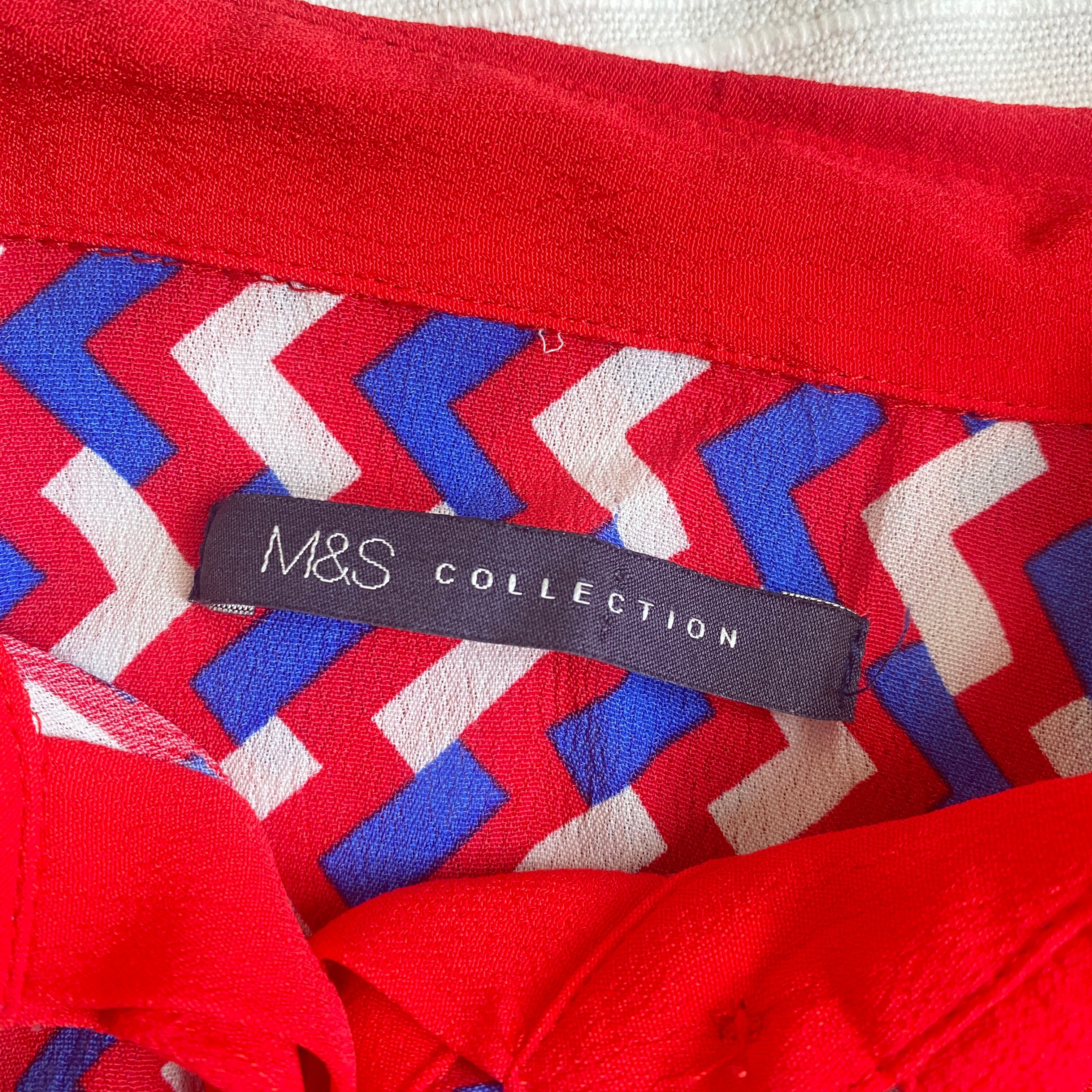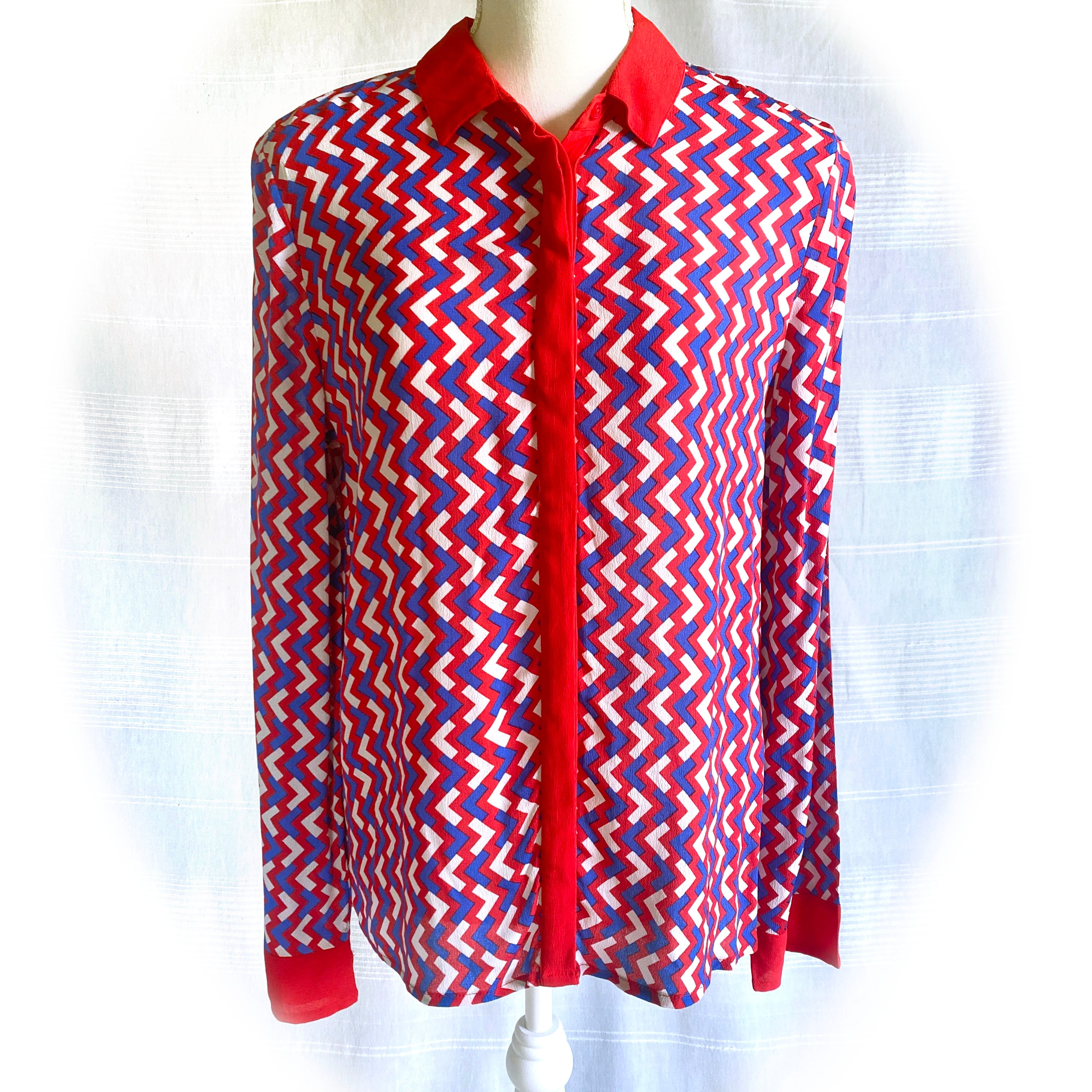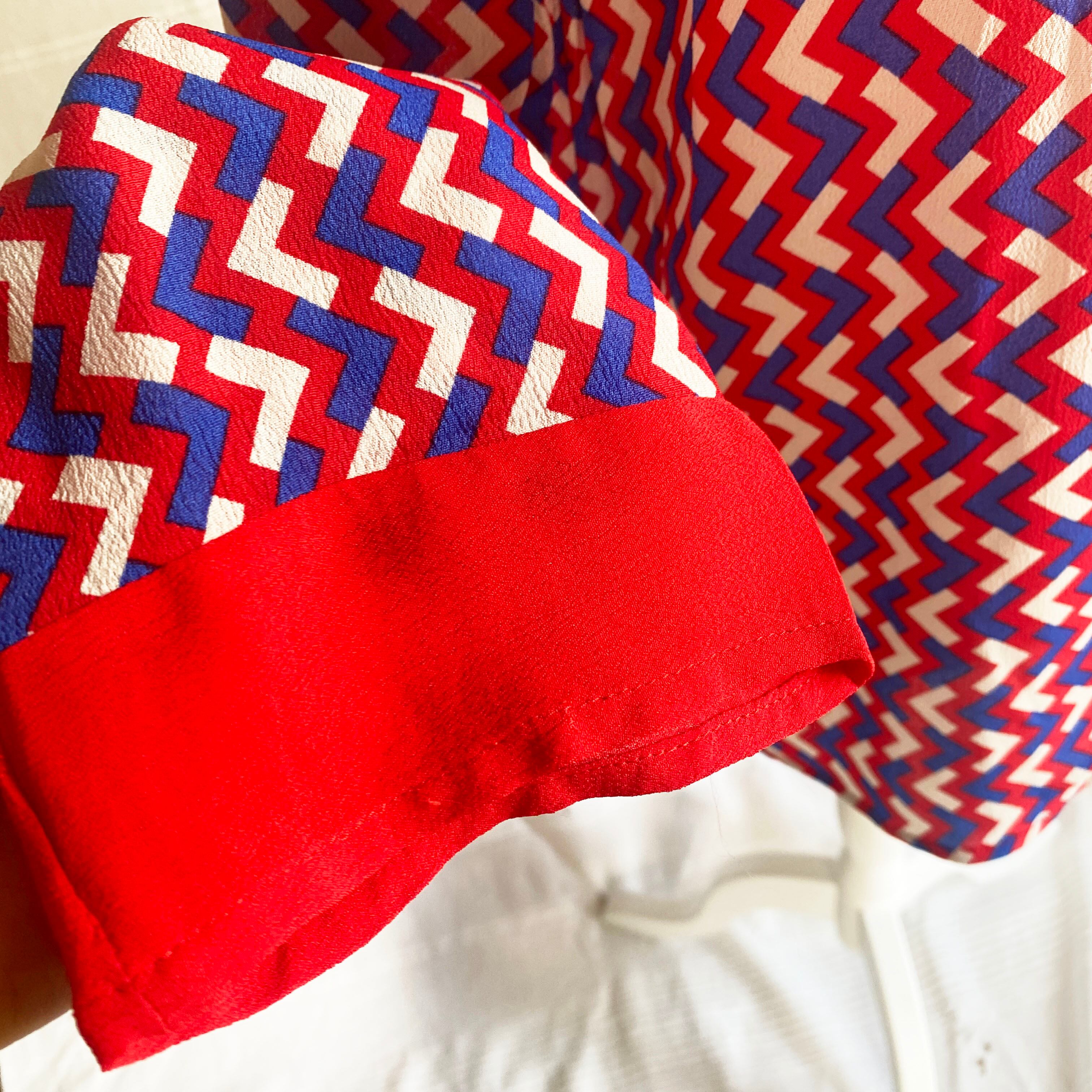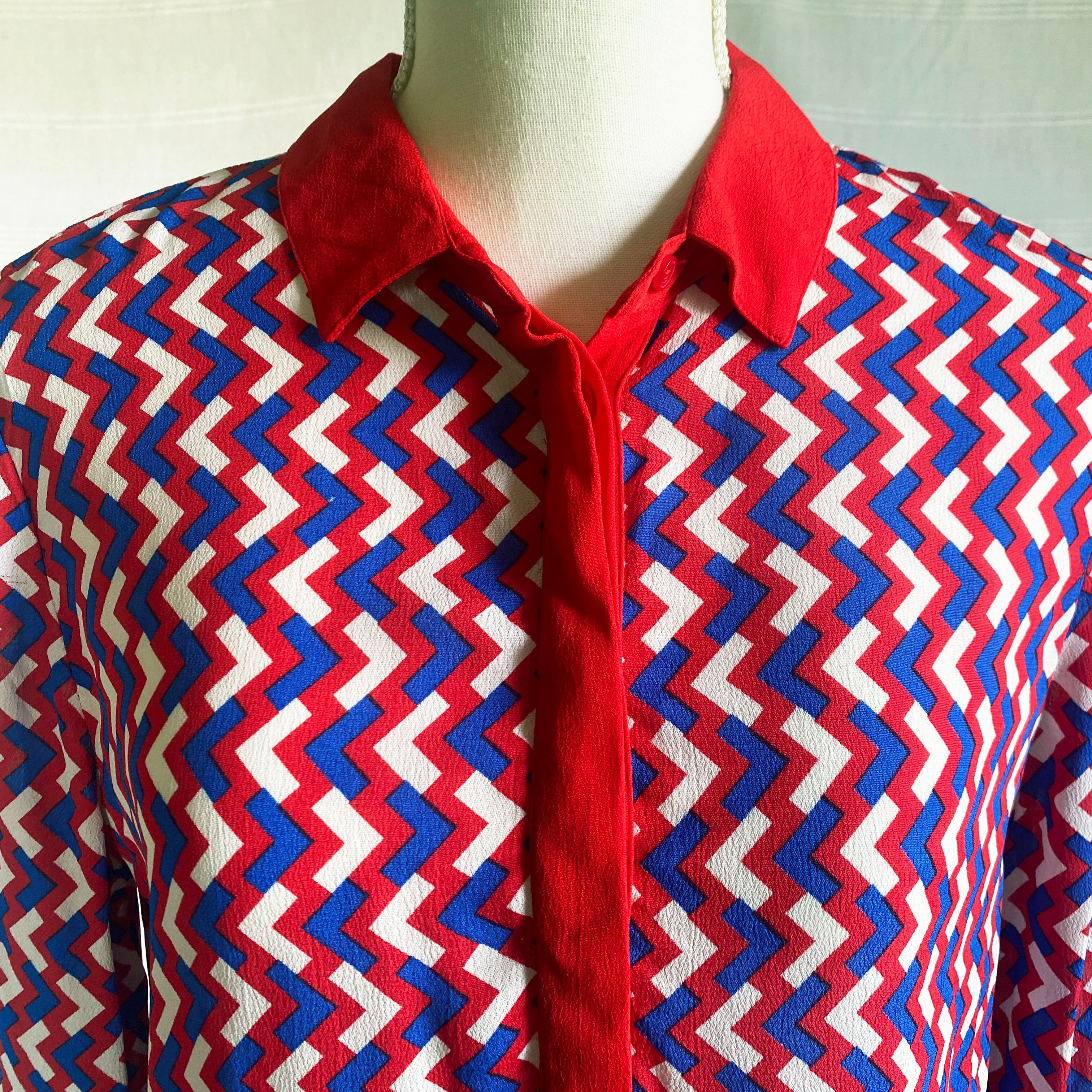 真っ赤にホワイト×ブルーのあざやかな三角模様がプリントされたヴィヴィッドな長袖シャツ。