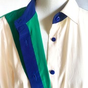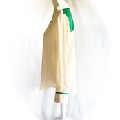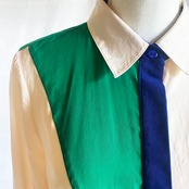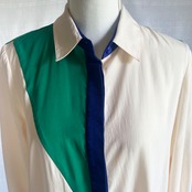 てろんとした落ち感のあるクリームよりのホワイトをベースに、あざやかなグリーンとブルーの切り替えが効いた長袖シャツ。