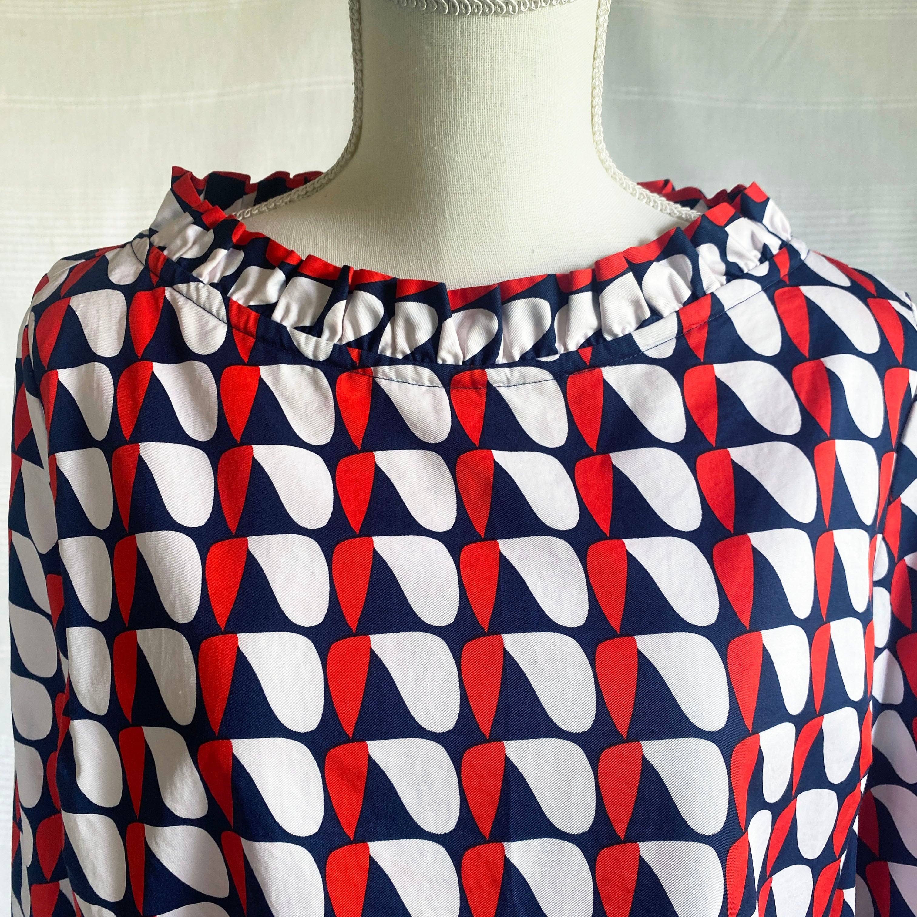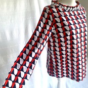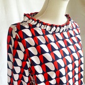 ネイビーにくっきりしたホワイト×レッドの模様がプリントされたトップス。