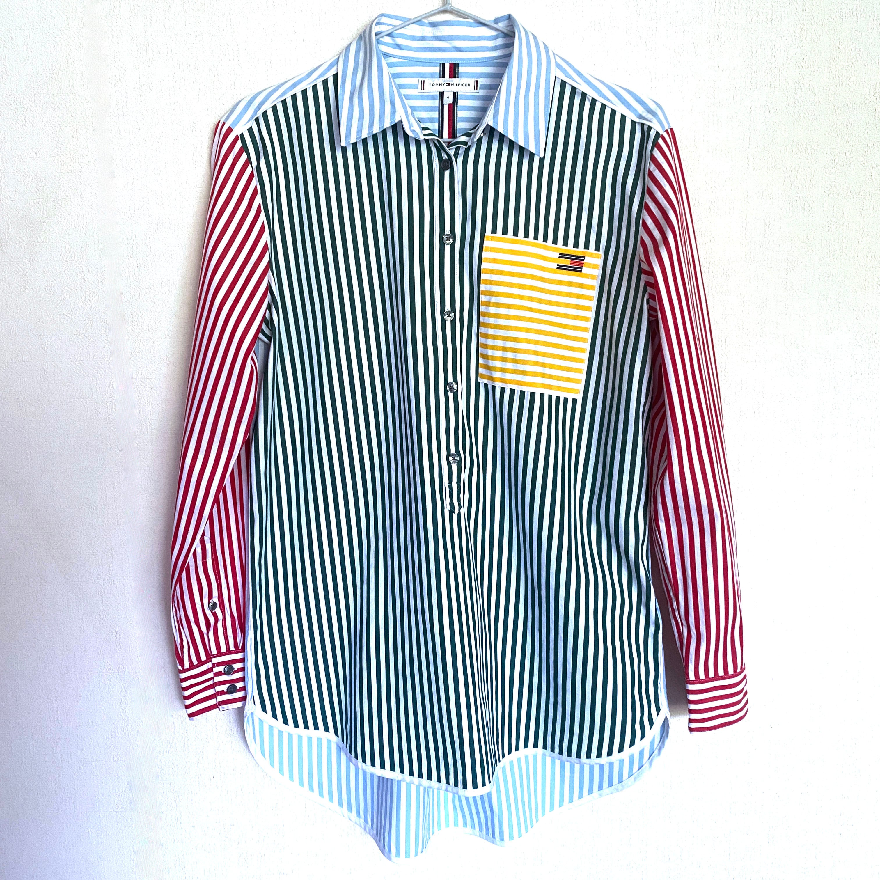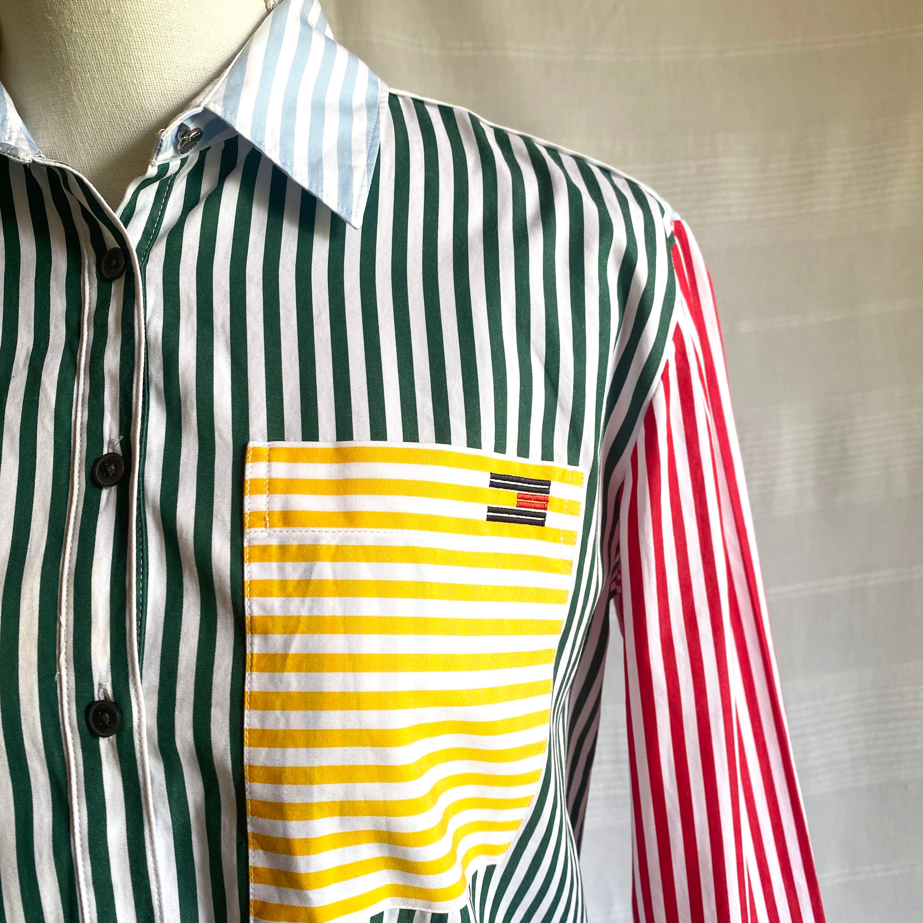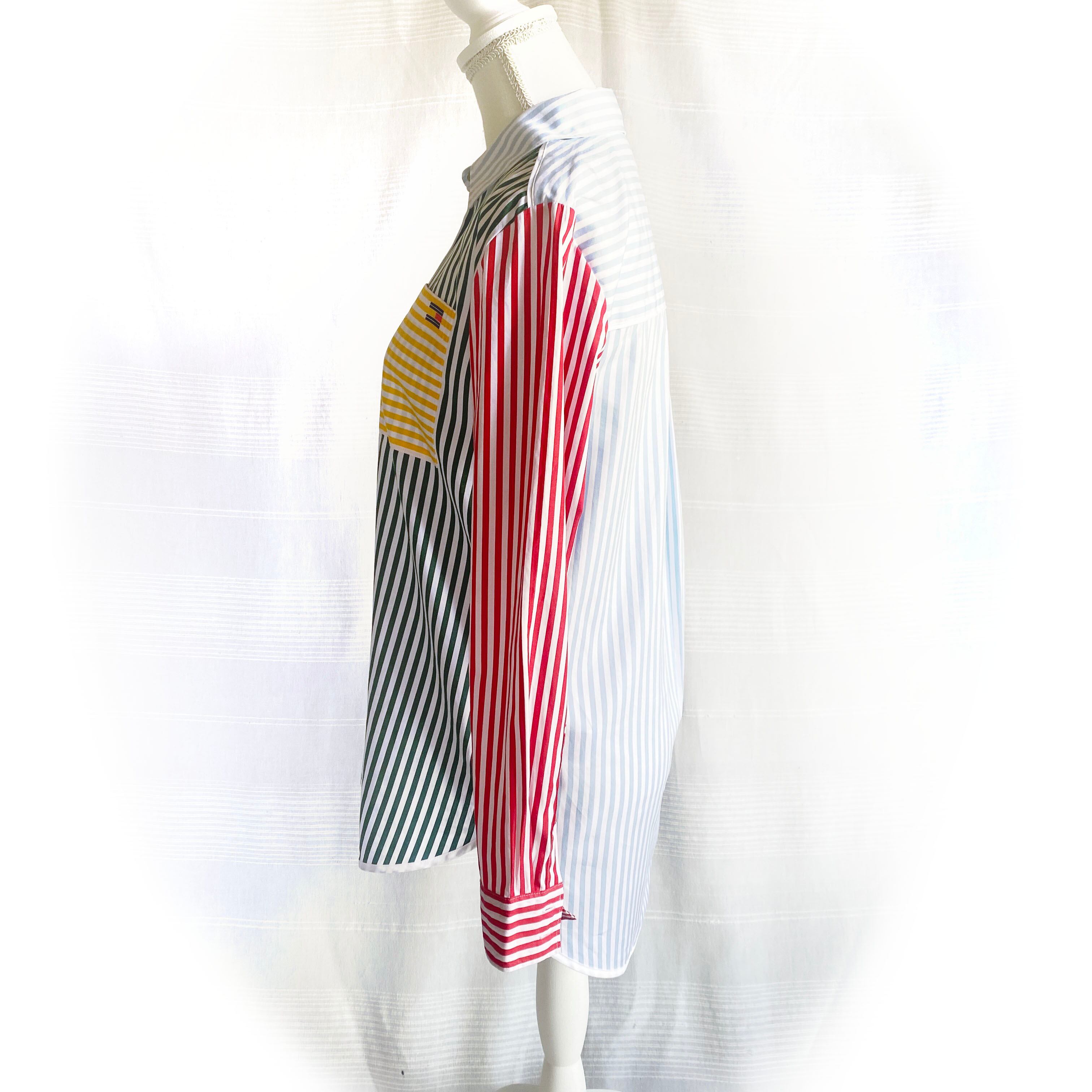 グリーン、イエロー、レッドとブルー×ホワイトのストライプの切り替えがカラフルなプルオーバーシャツ。