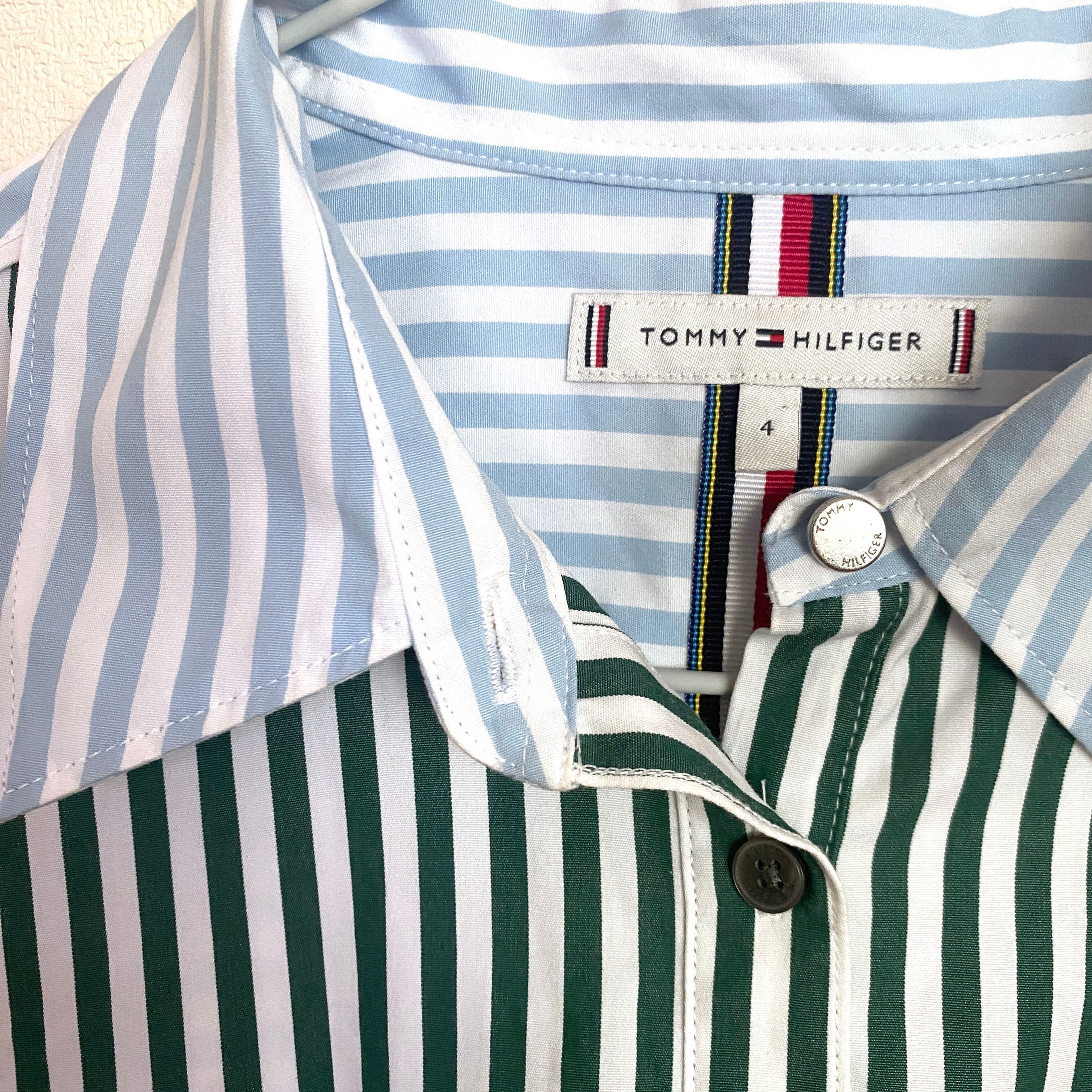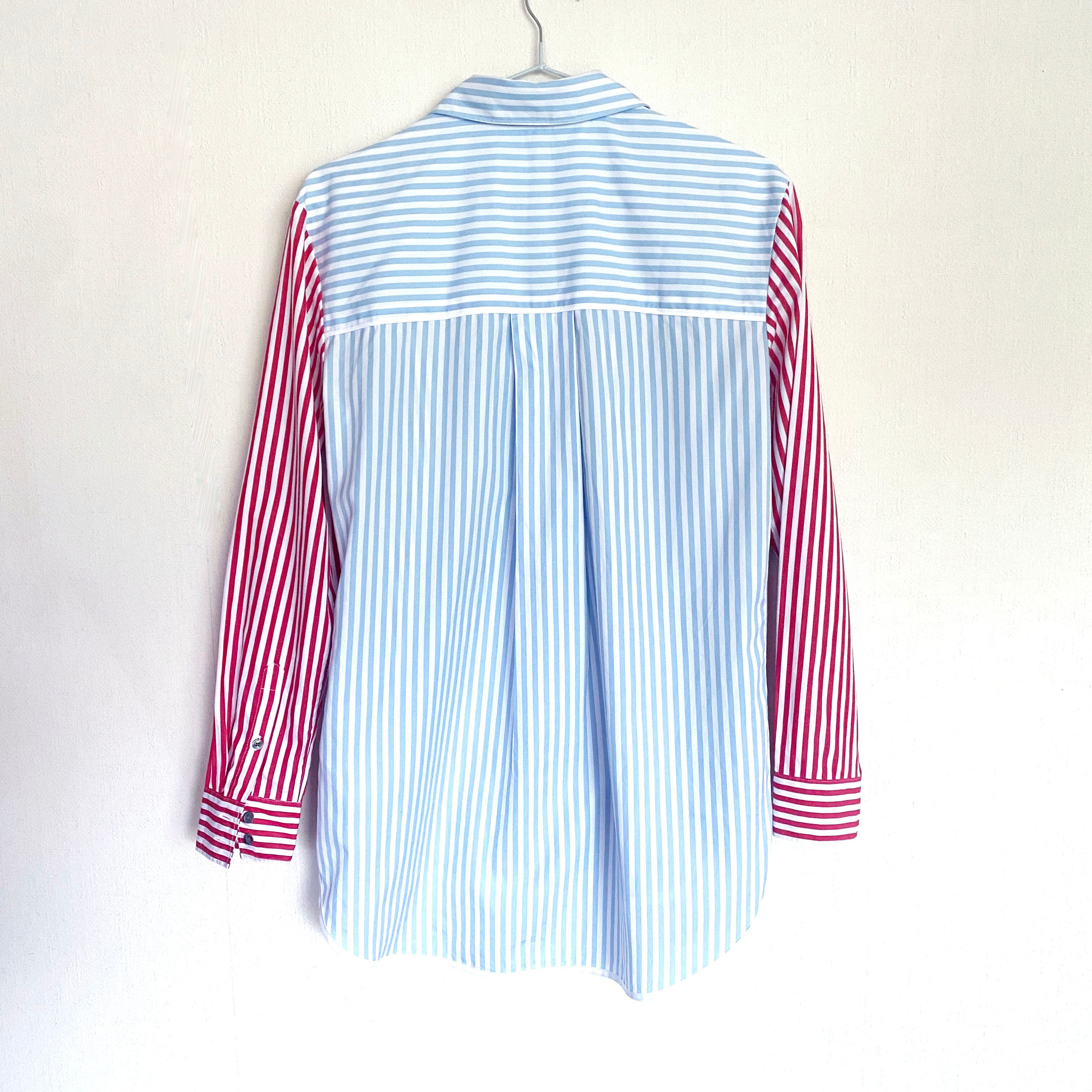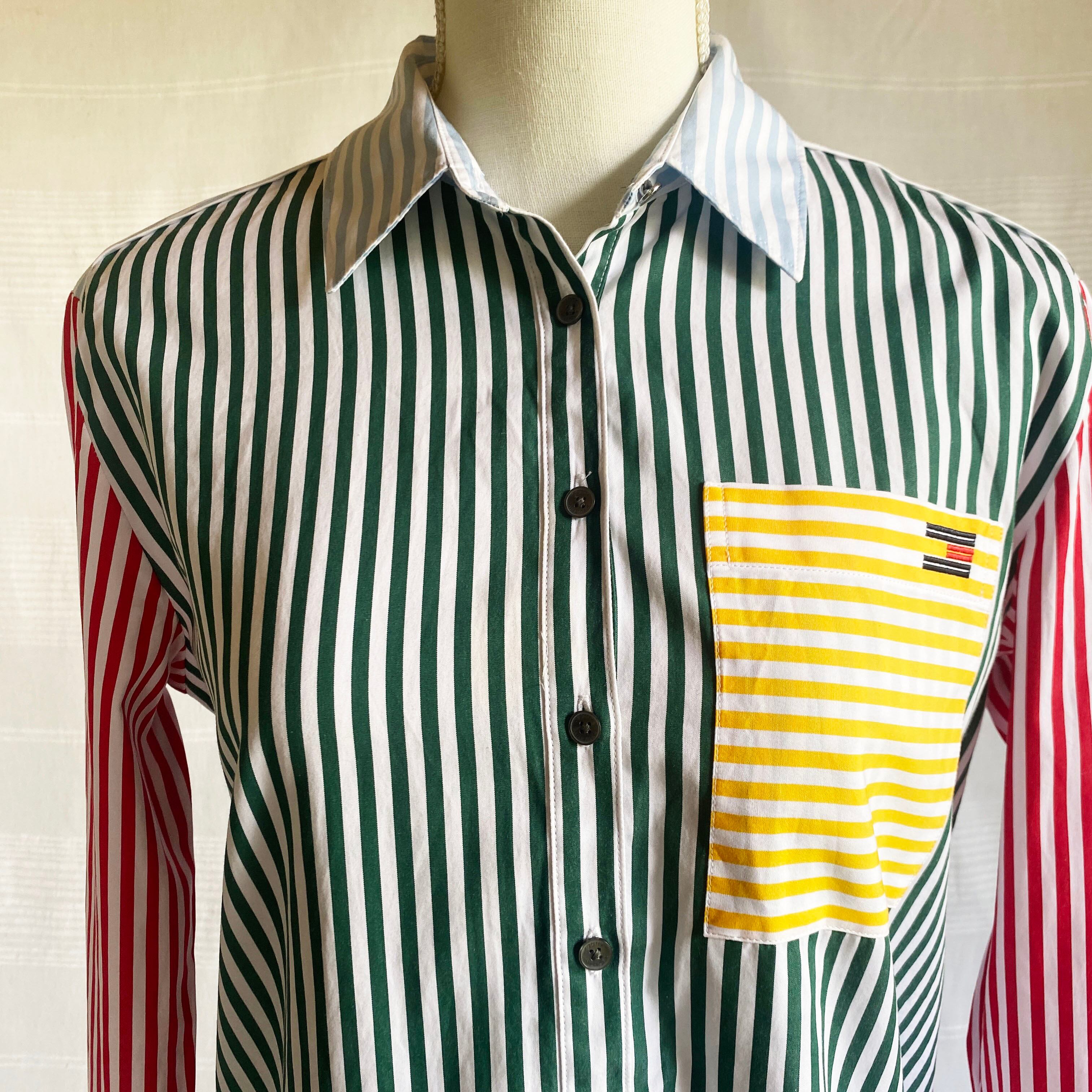 グリーン、イエロー、レッドとブルー×ホワイトのストライプの切り替えがカラフルなプルオーバーシャツ。