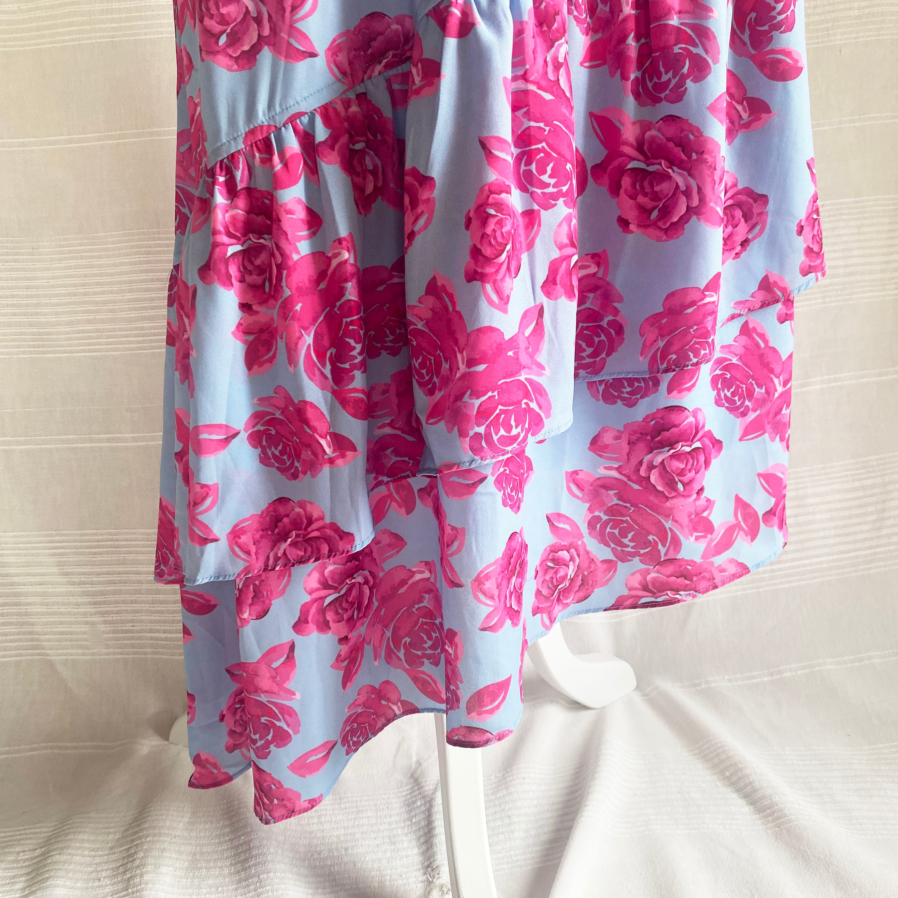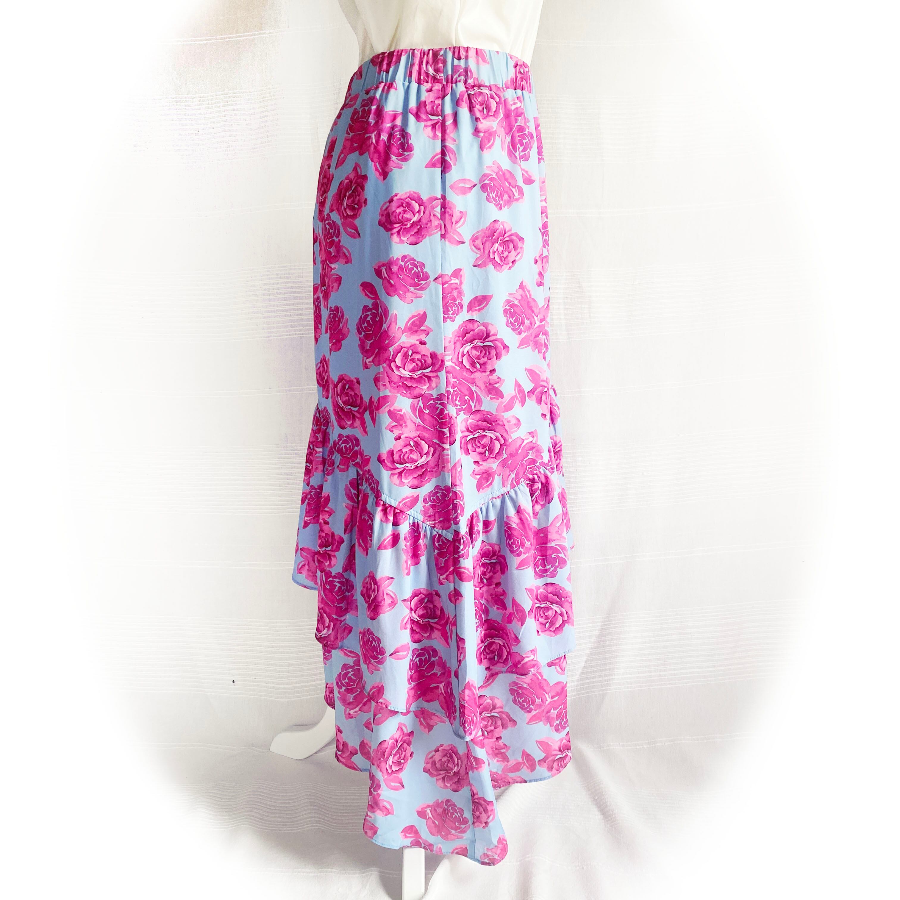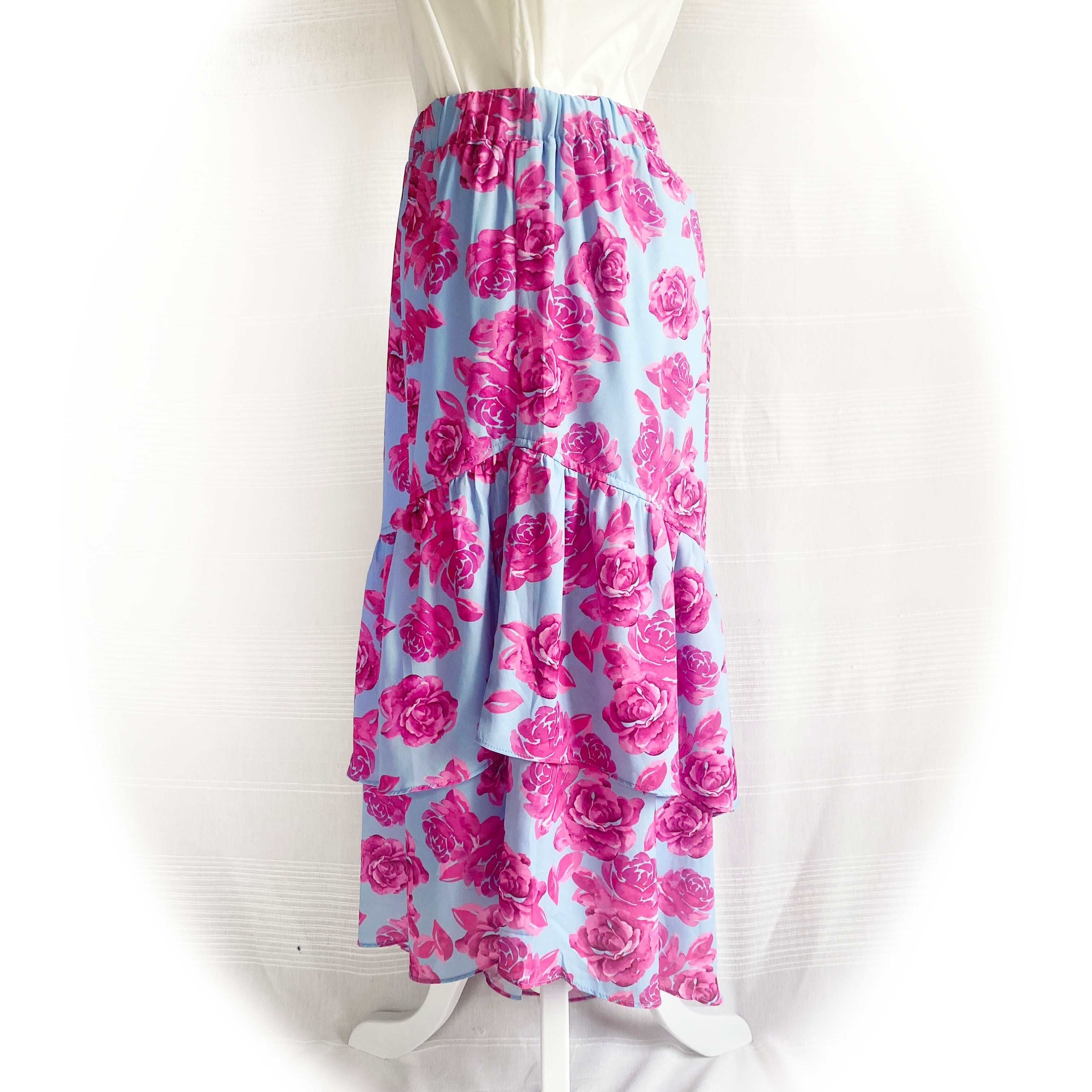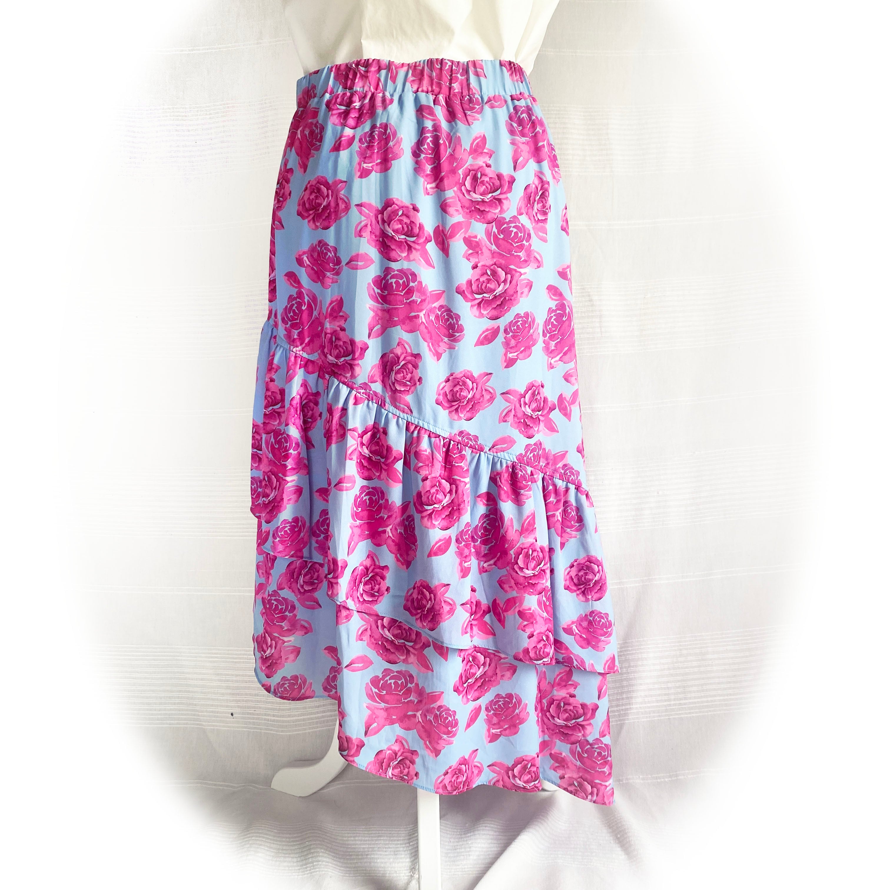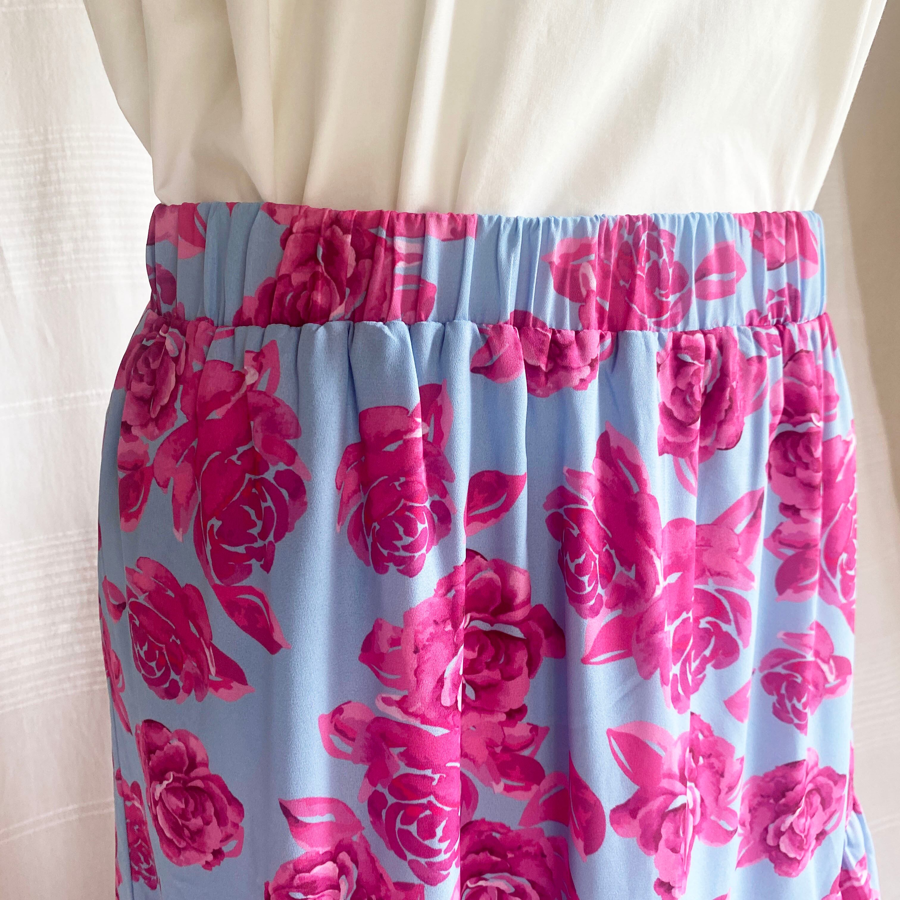 ペールブルーにローズ一色で描かれた薔薇のスカート。