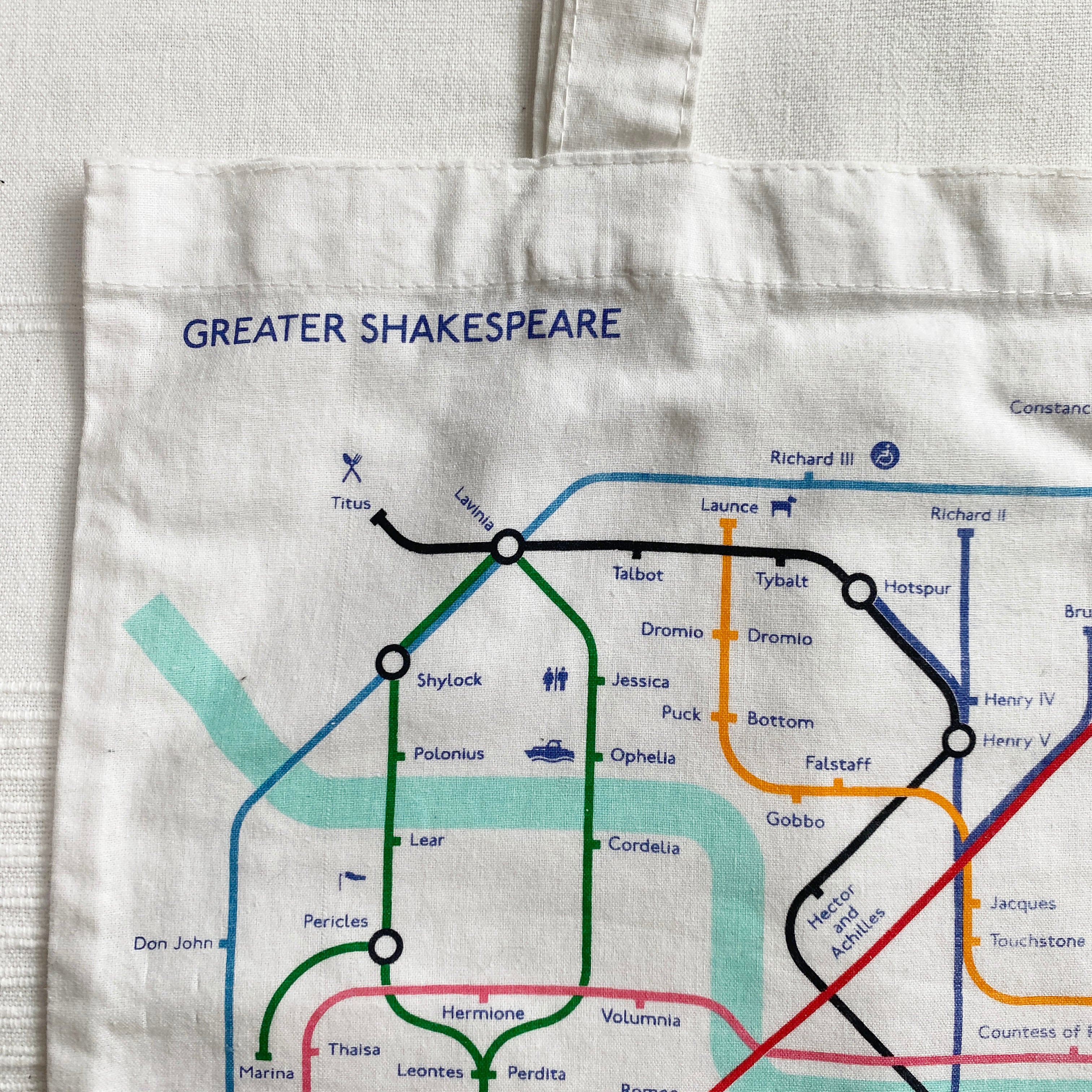 ロイヤル・シェイクスピア・カンパニーの、シェイクスピアに出てくるキャラクターたちを、それぞれの役割別の線に配置した、ロンドンチューブの路線図を模したデザインのトートバッグ。