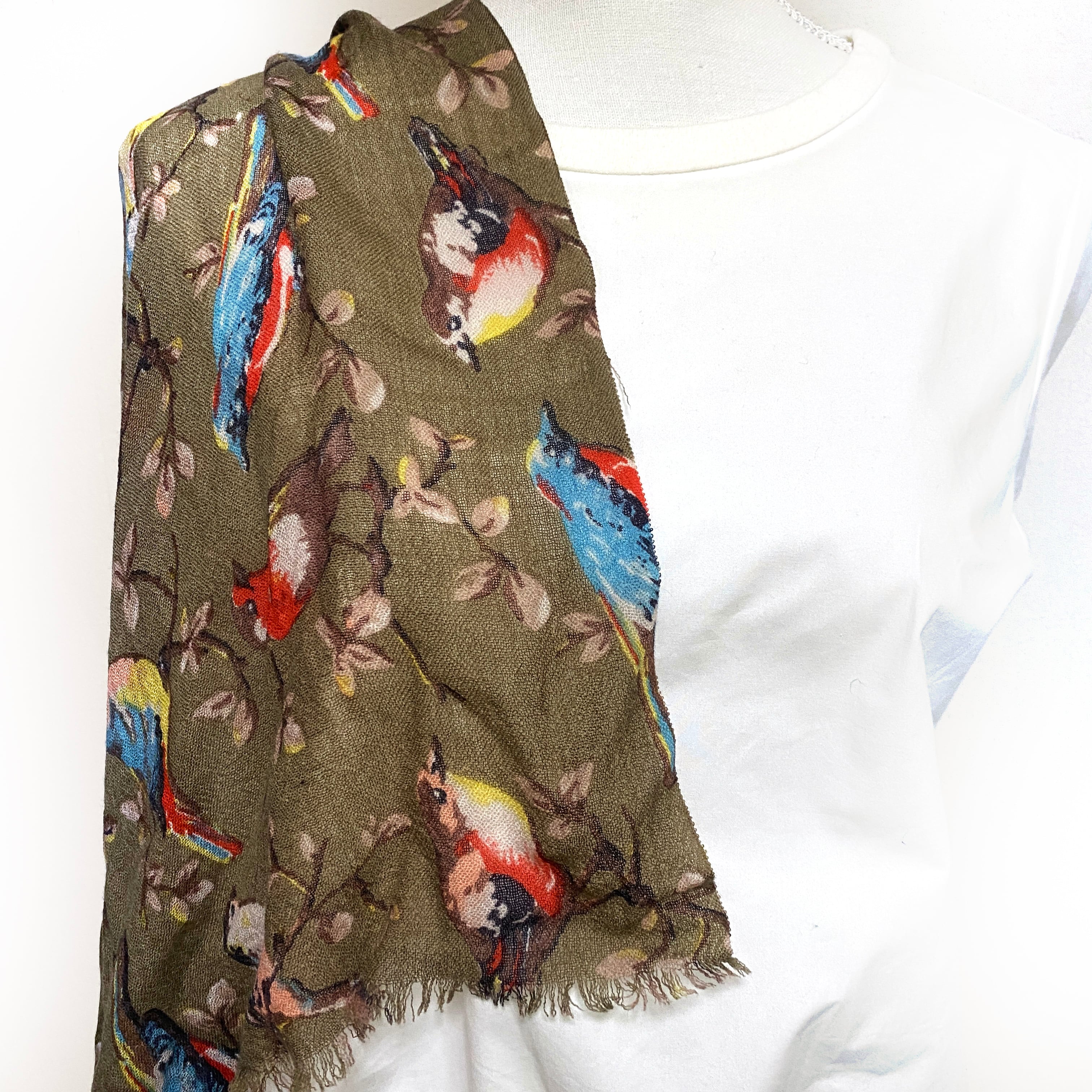 ブラウンにカラフルな小鳥がプリントされた、ラブリーなスカーフです。