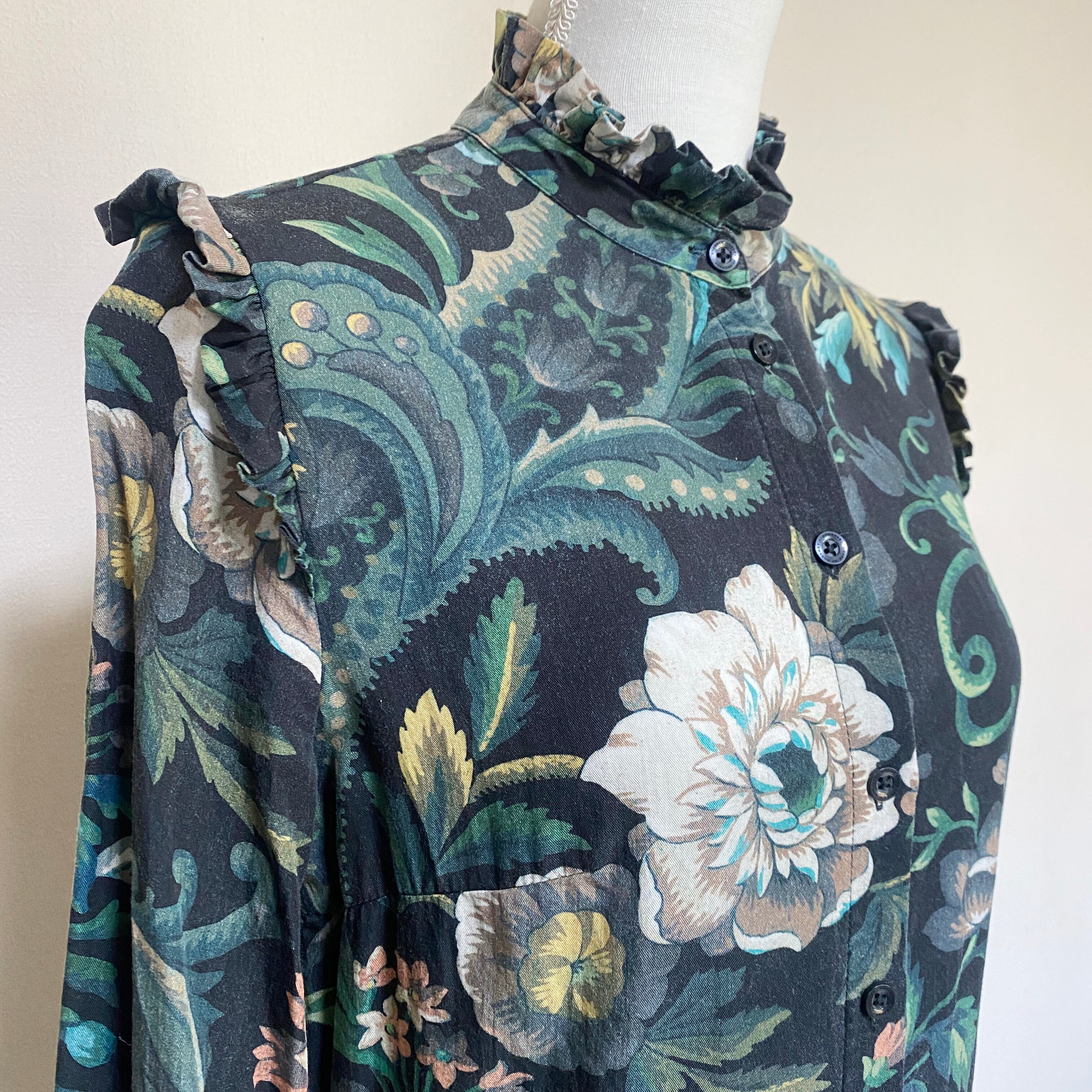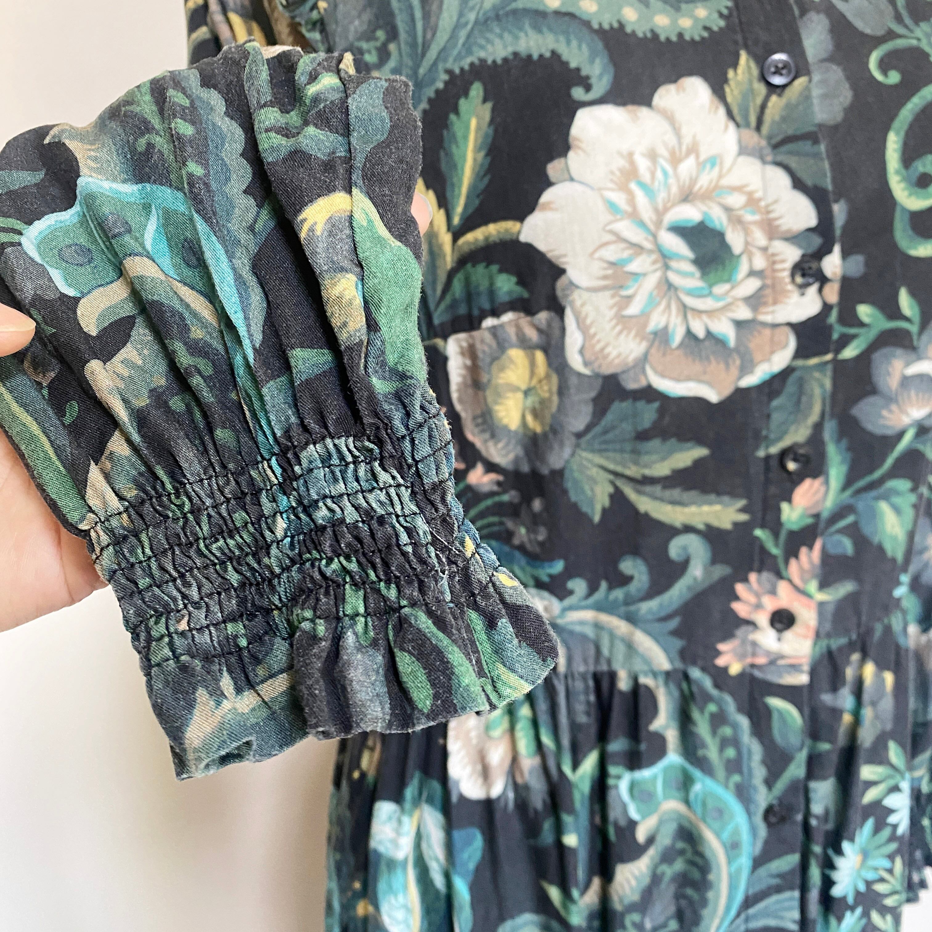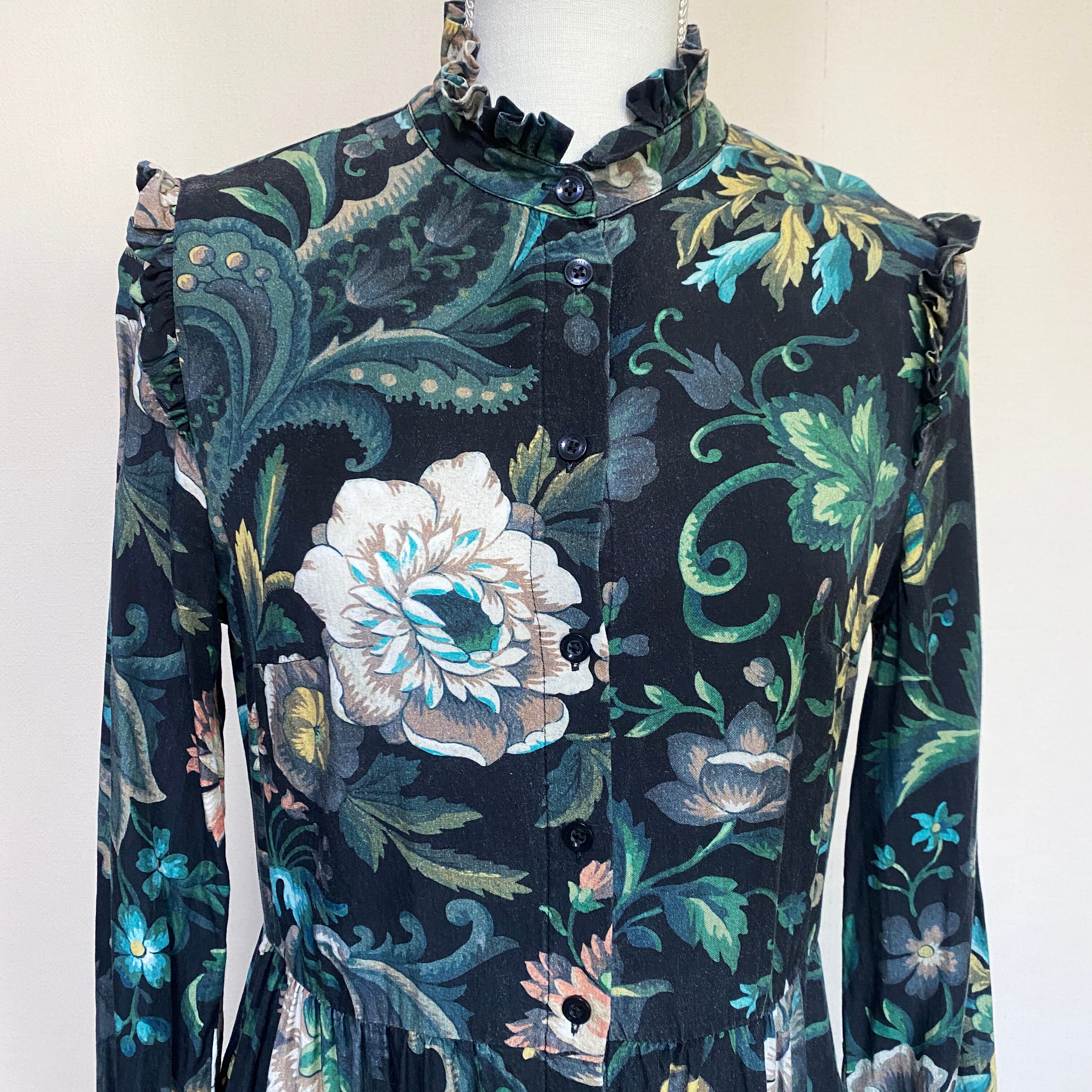 くすんだブラックに、緑を基調とした色味のボタニカルプリントのワンピース。