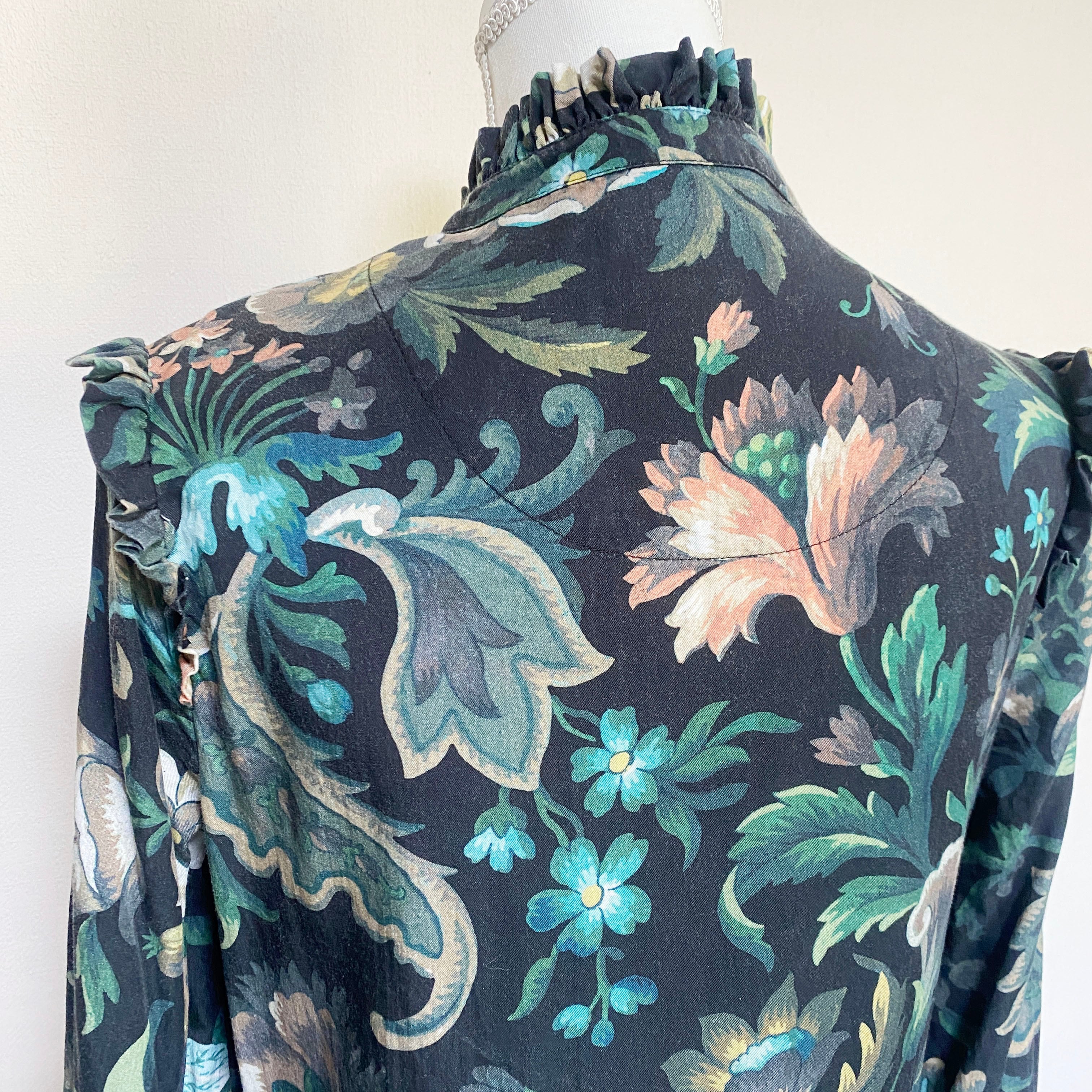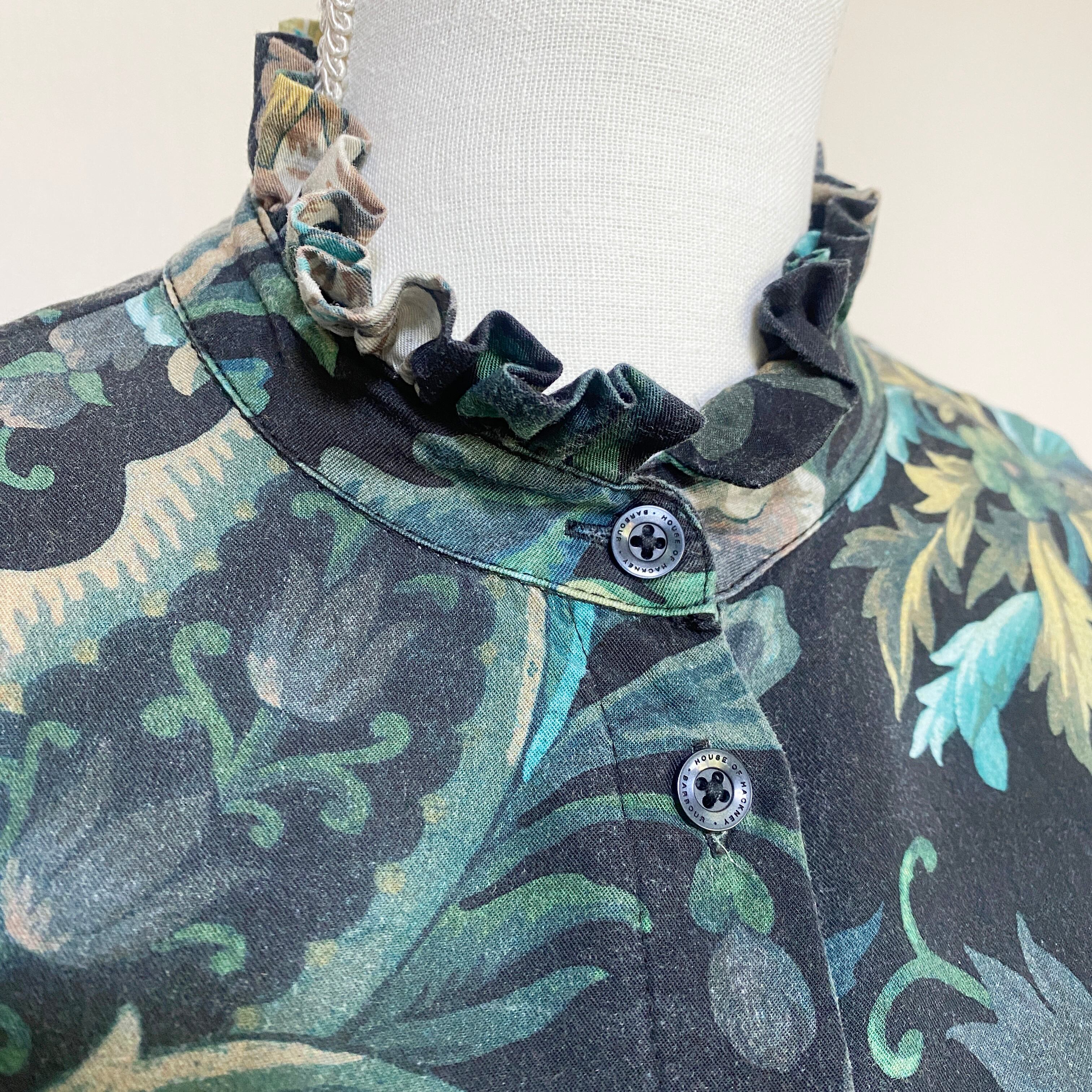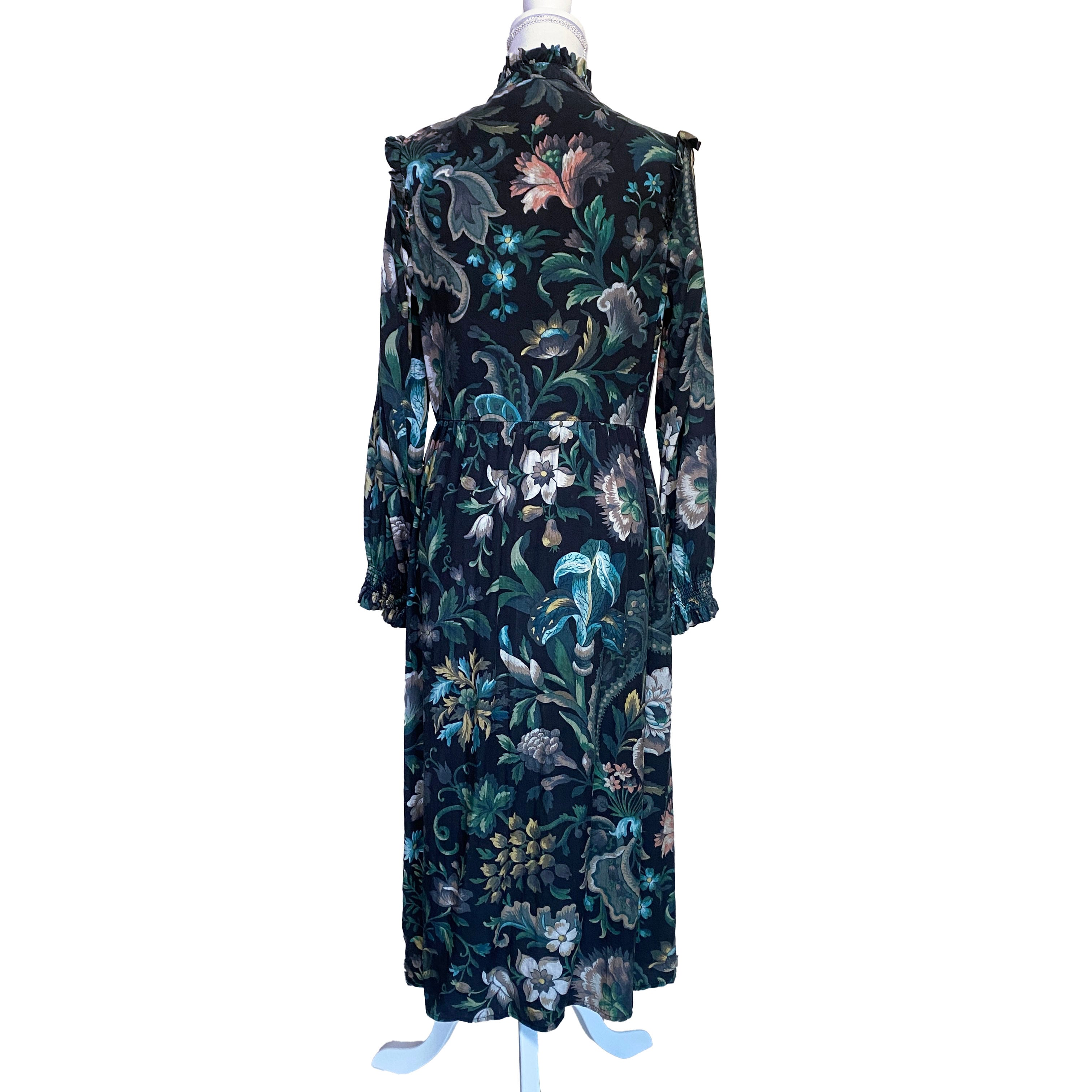 くすんだブラックに、緑を基調とした色味のボタニカルプリントのワンピース。