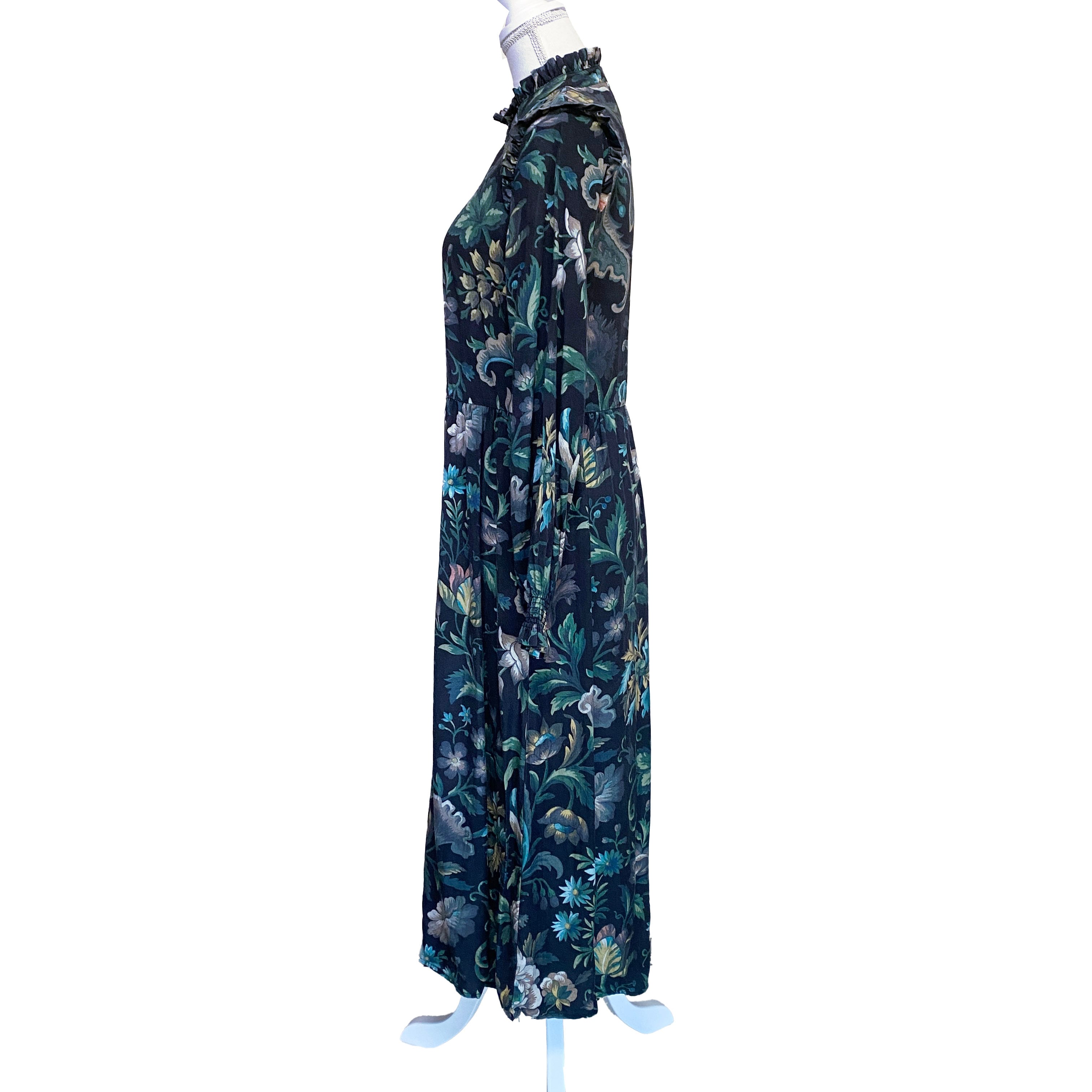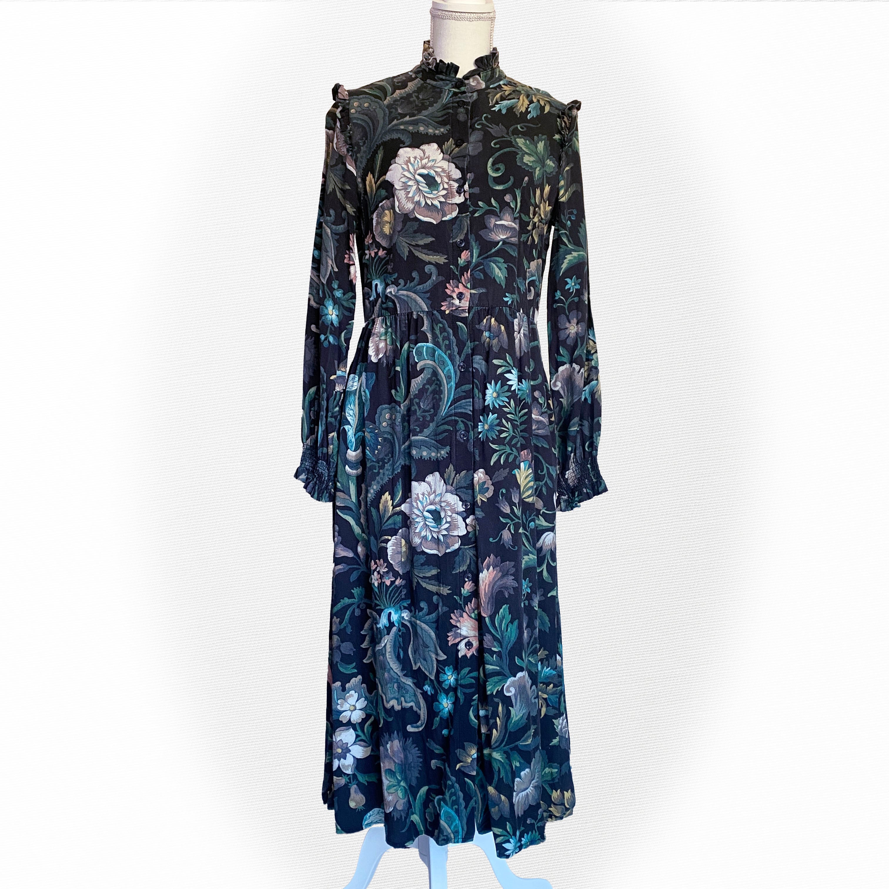 長袖のロングドレスで大き目の花の総柄ですが、色味のせいか落ち着いた印象の一枚です。