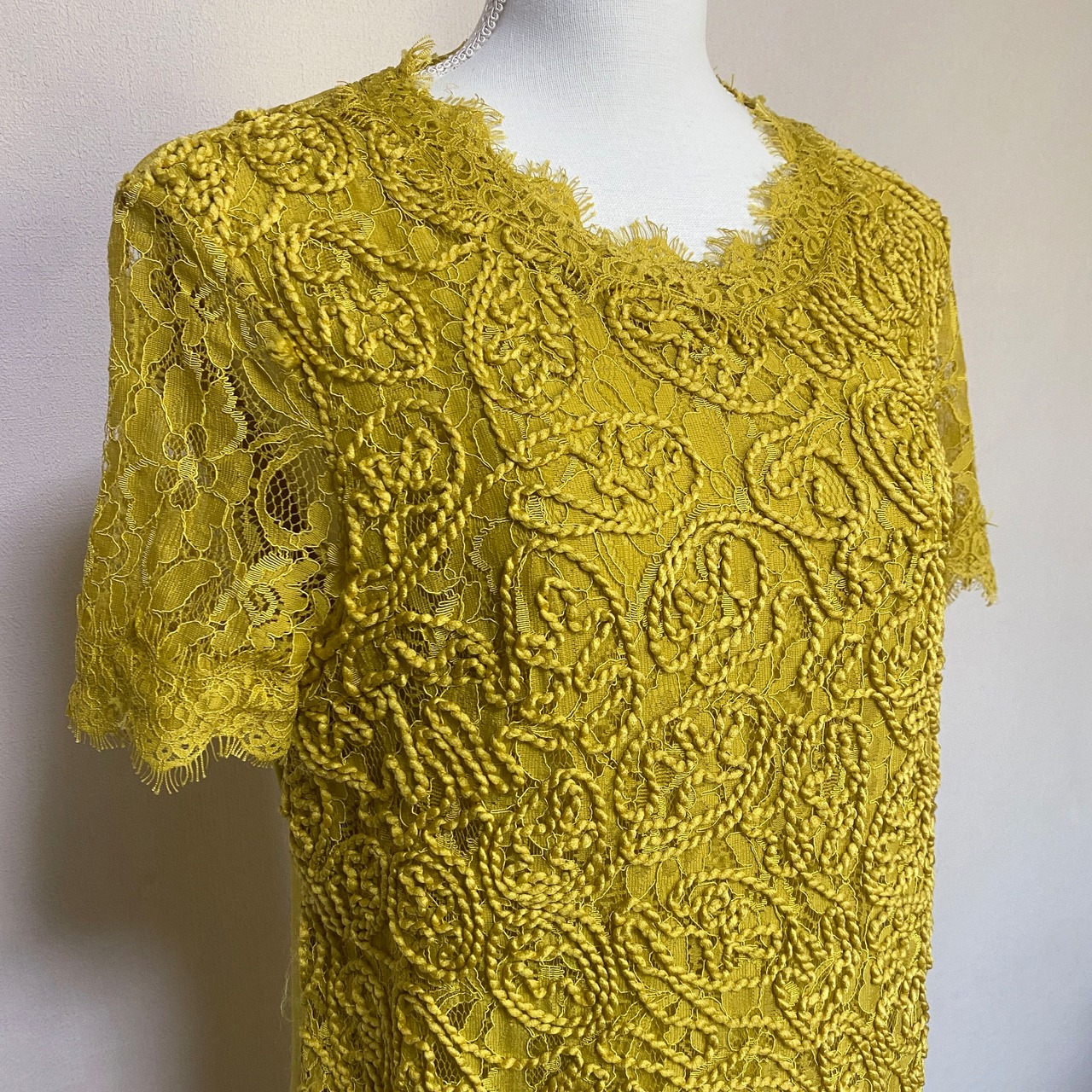 ジャージ生地に、毛糸が縫い付けられたレースが重ねられているユニークなワンピース。