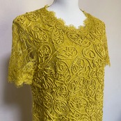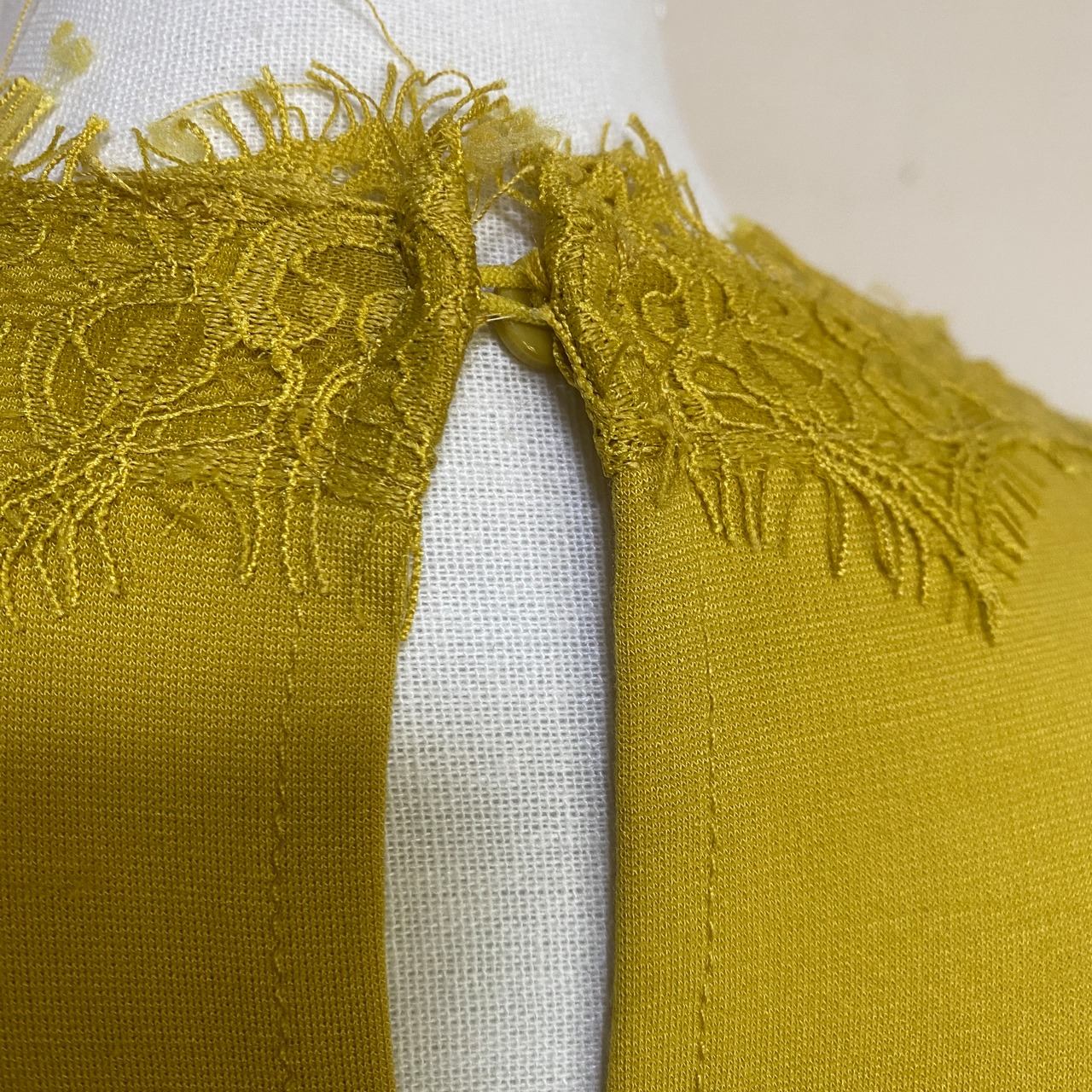襟元や袖はレースで、レース素材のつくる雰囲気と、ストンとしたジャージ素材のらくちんな着心地のアンマッチで面白い着こなしが出来そう。