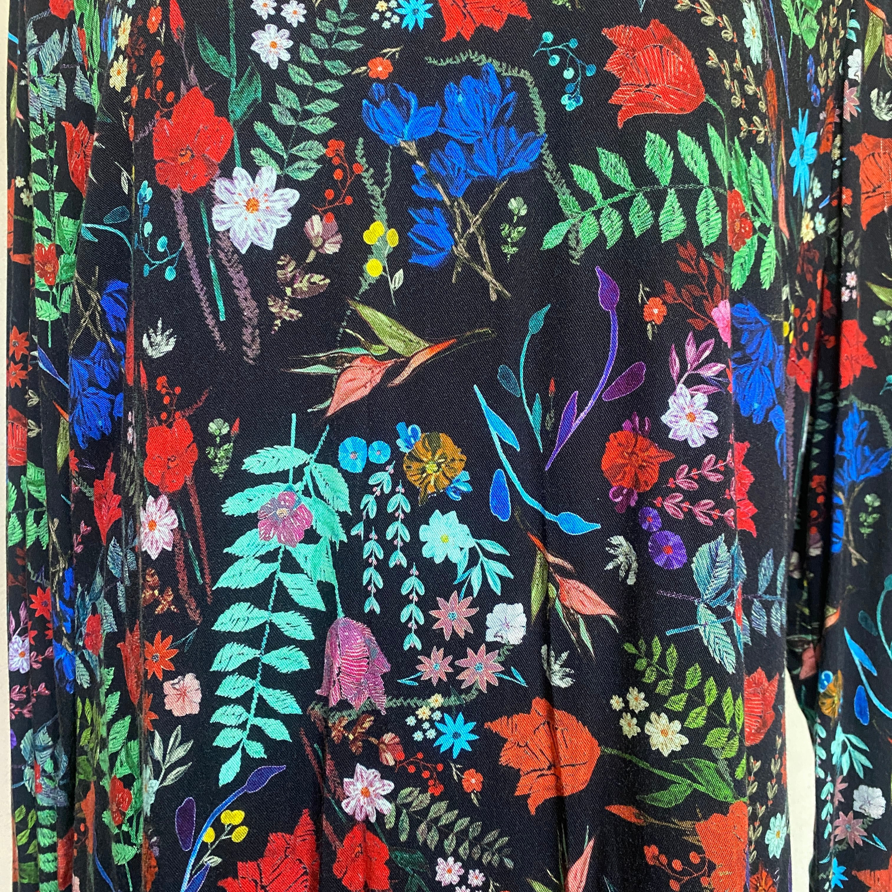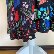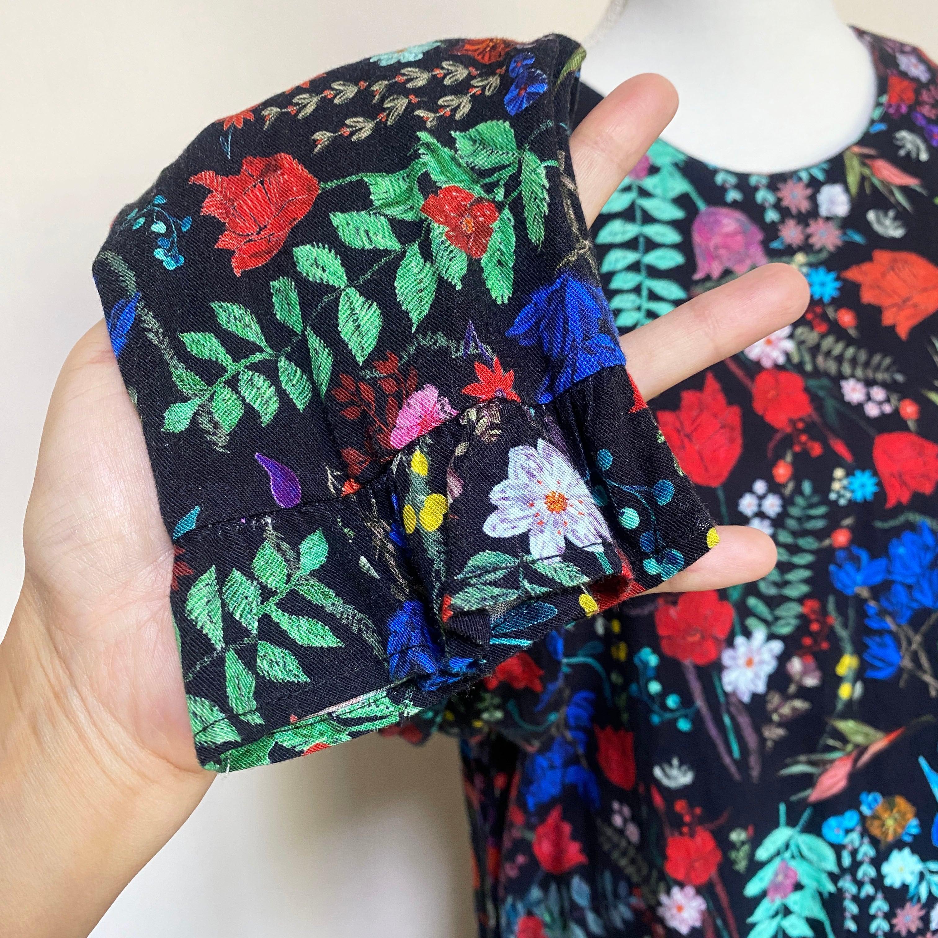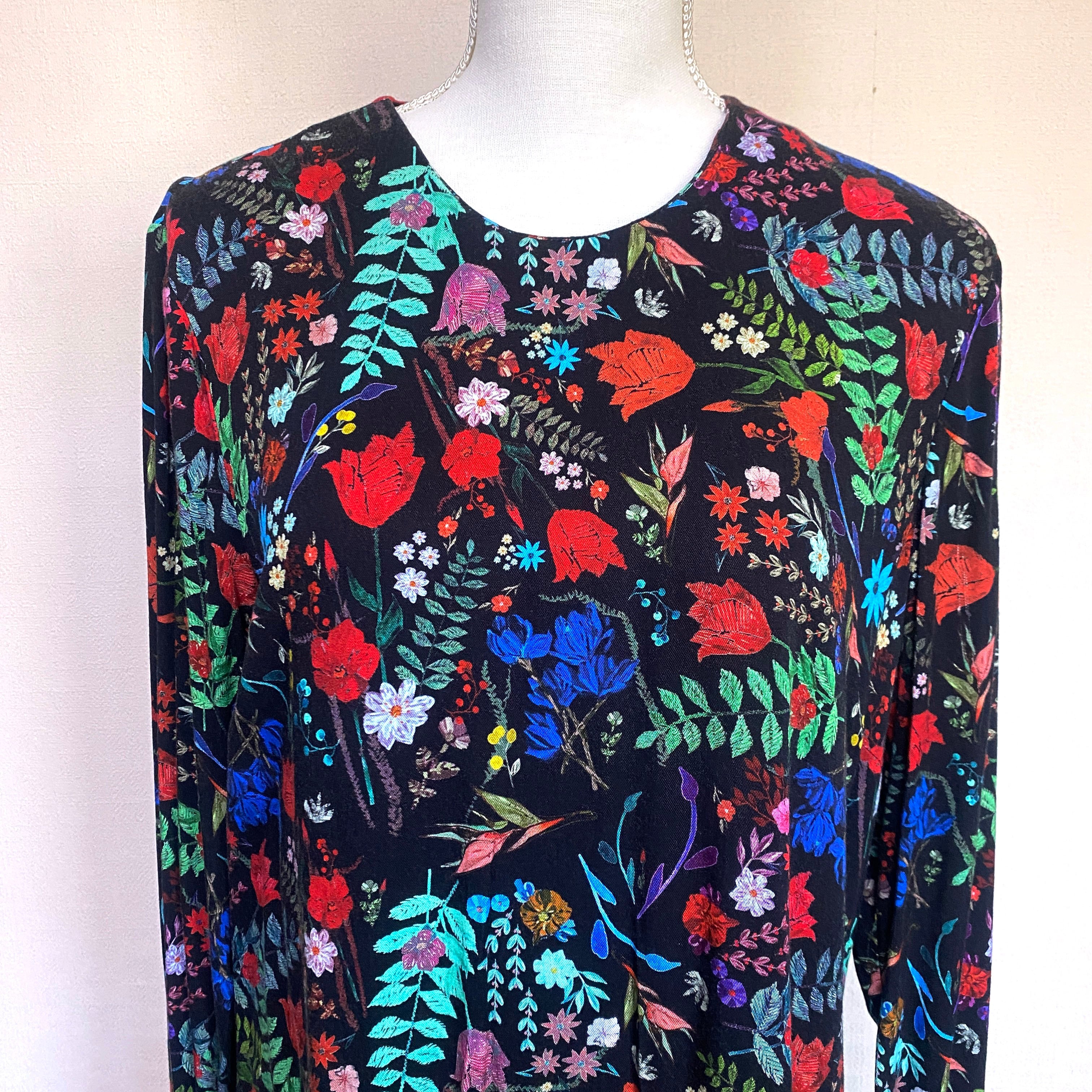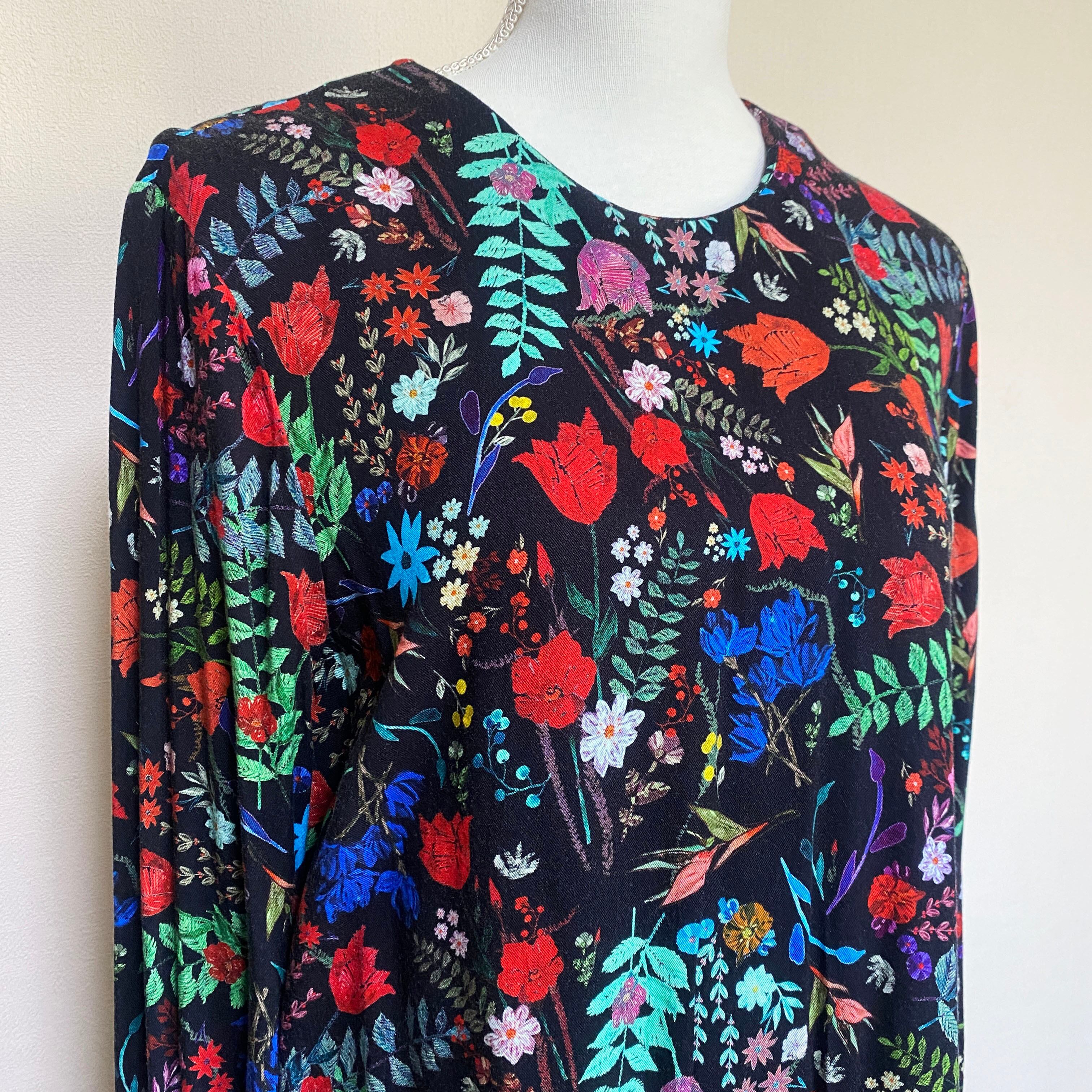 ブラックに、クレヨンで描いたような鮮やかな花々が咲き乱れるワンピース。