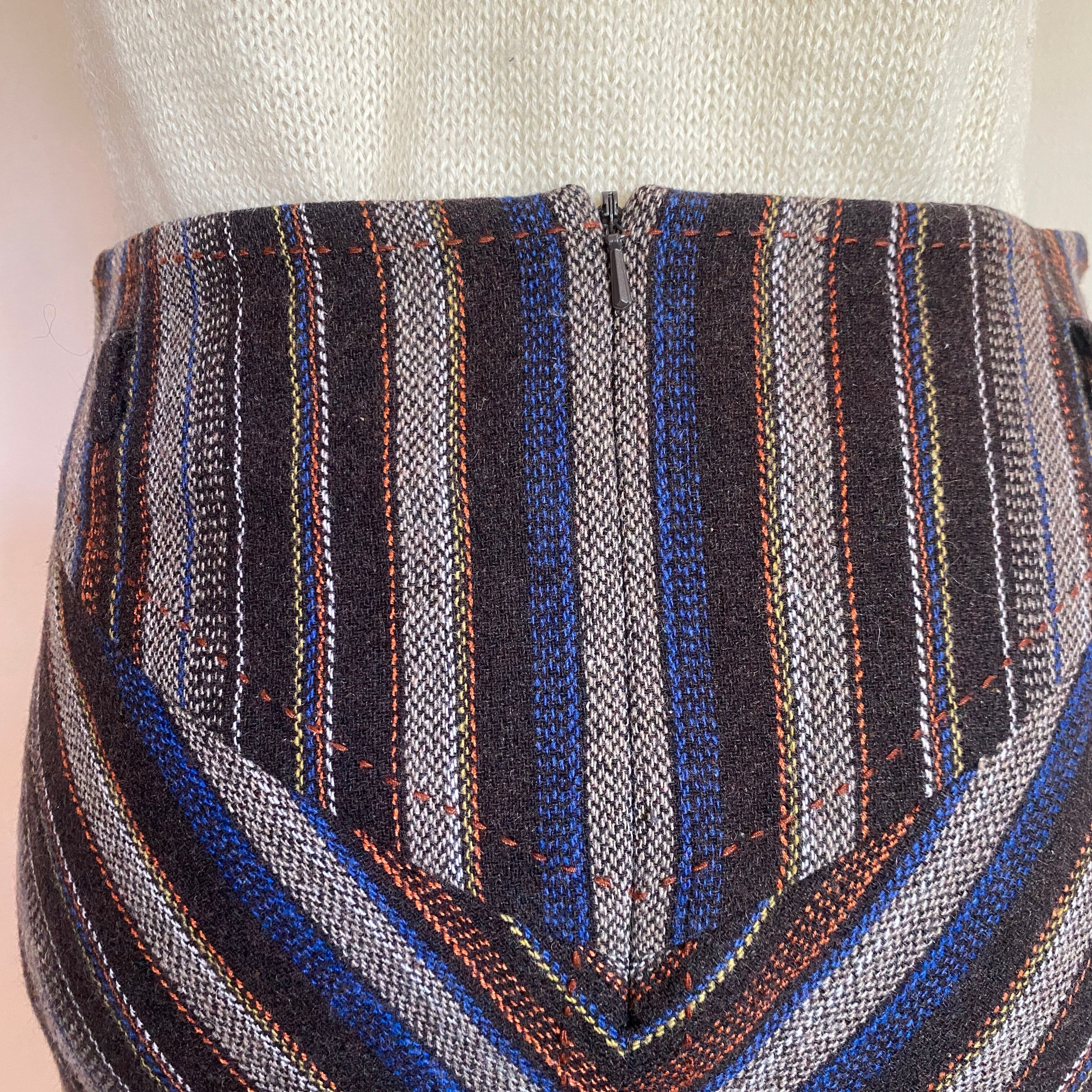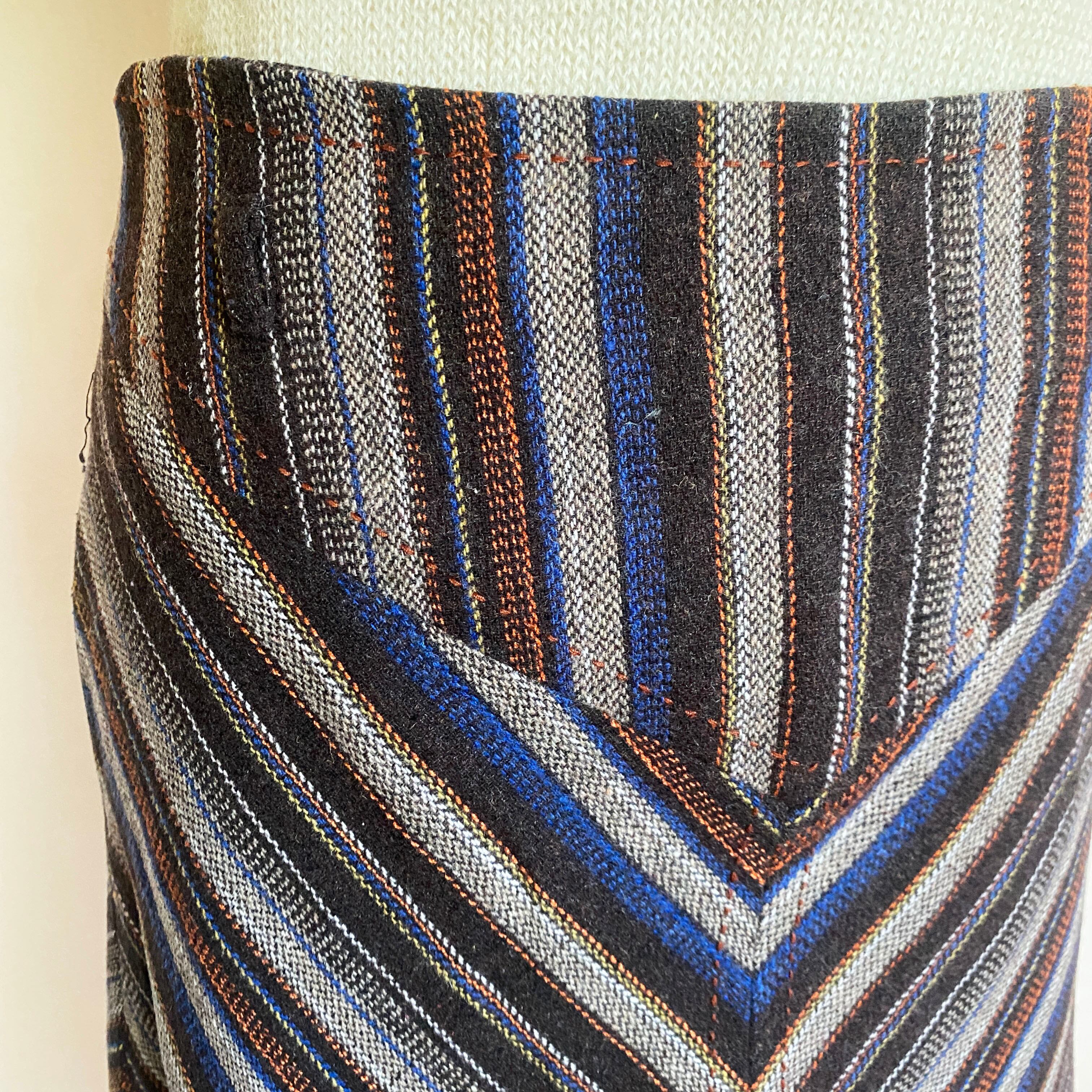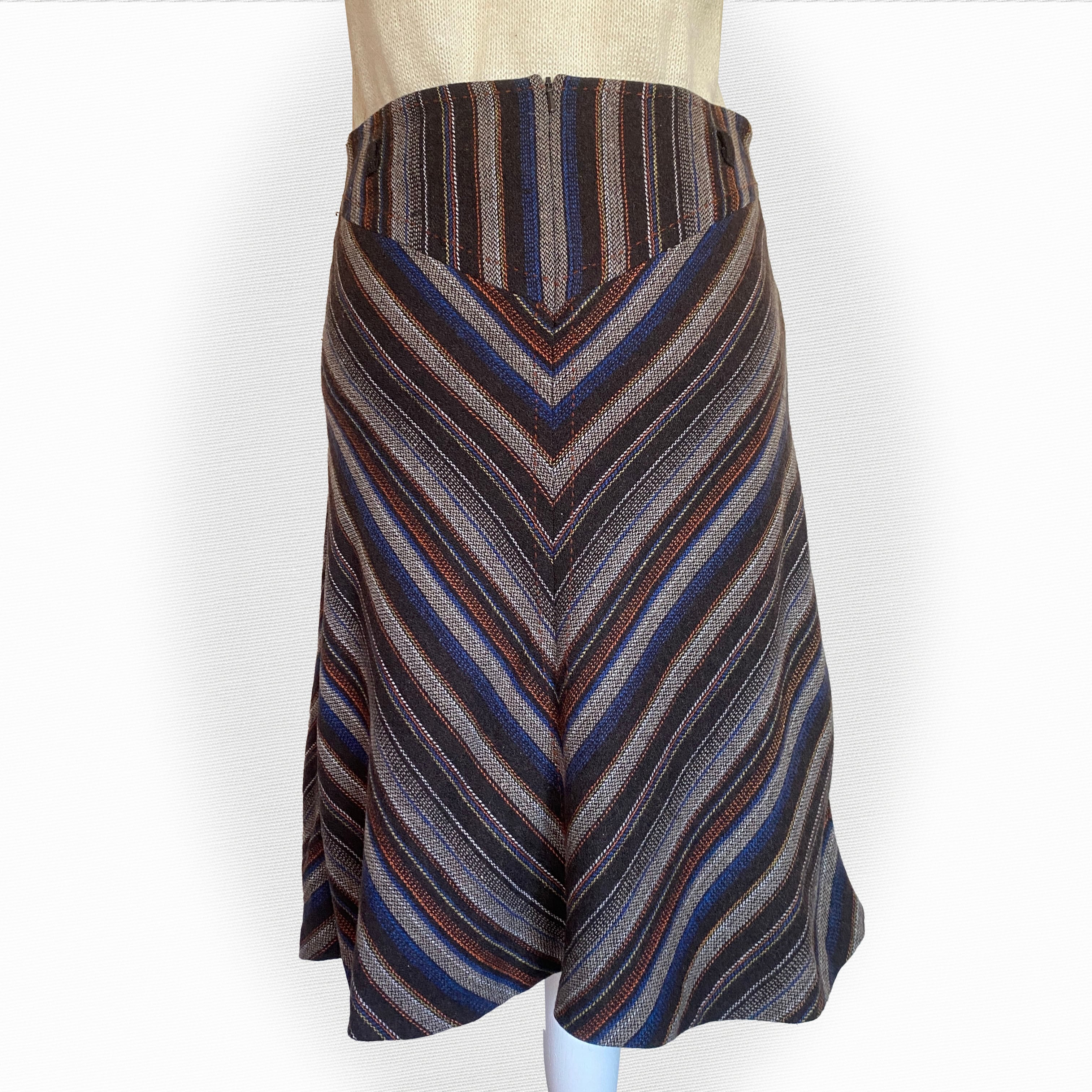 逆三角のブラウンストライプにブルーが効いた、ジオメトリックにも見えるウールのスカート。