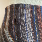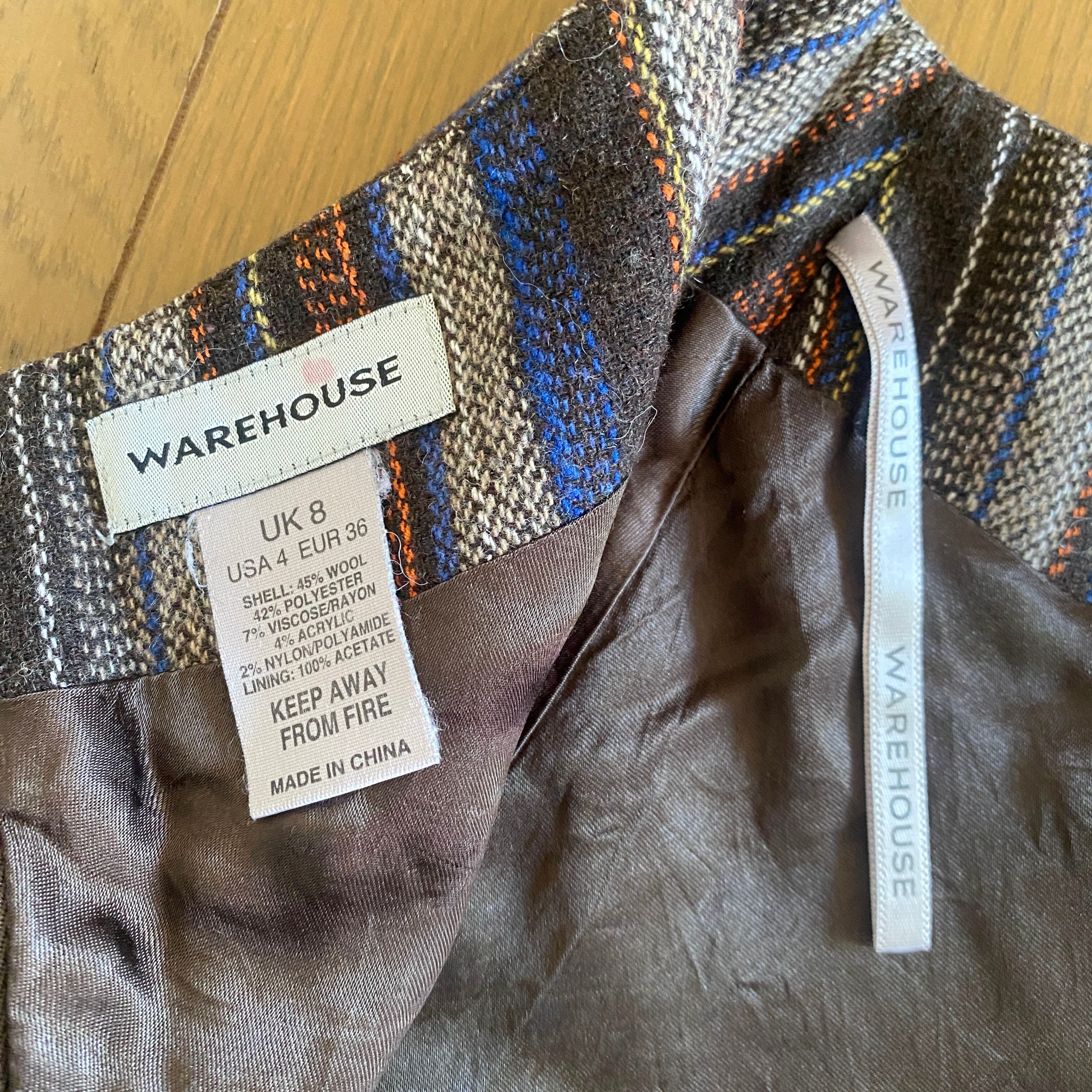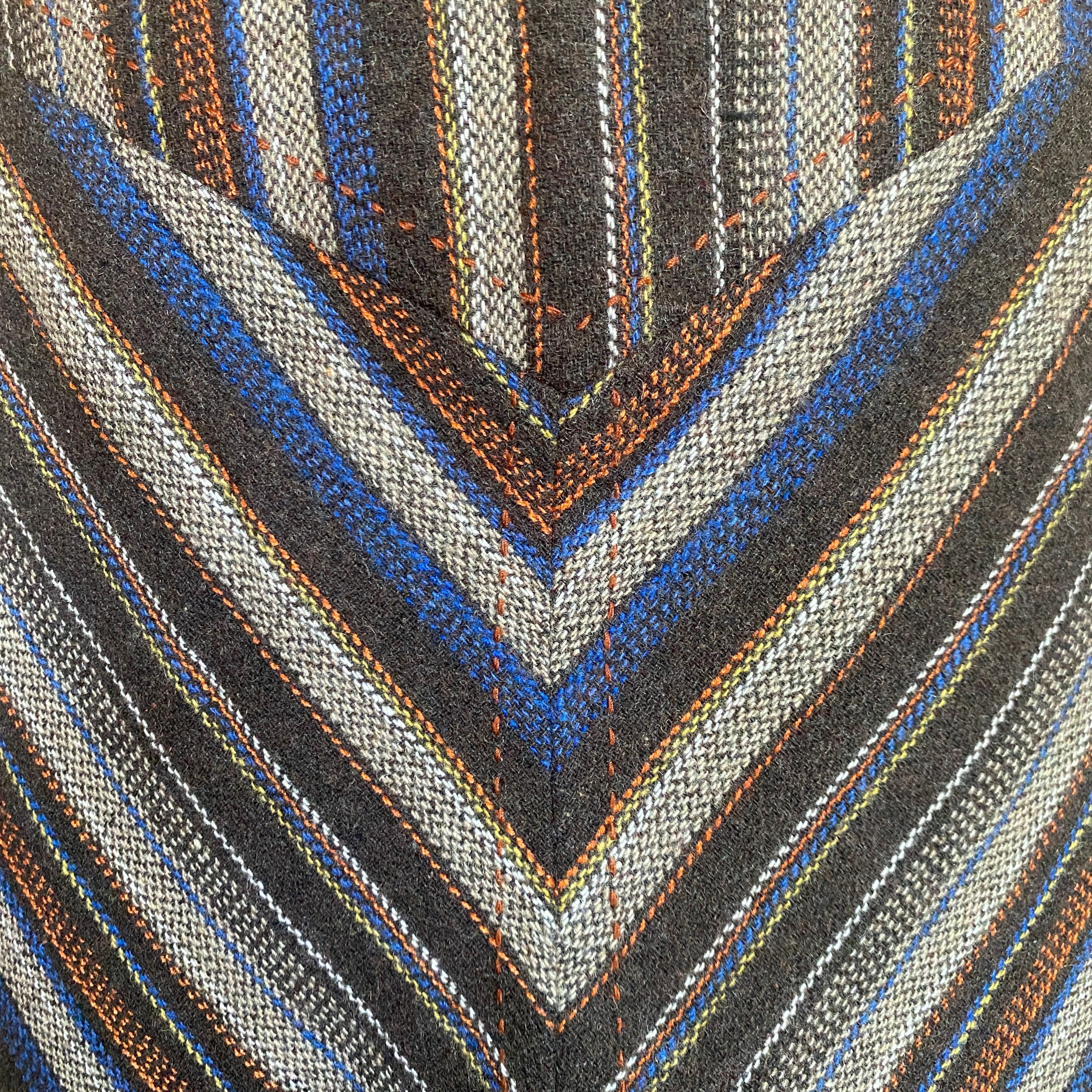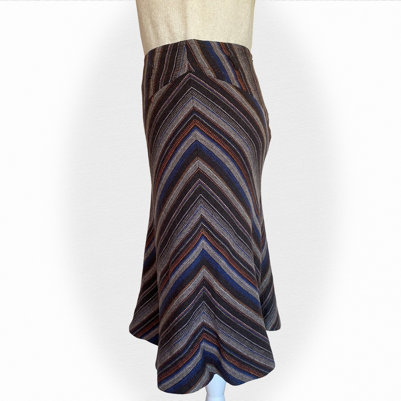 逆三角のブラウンストライプにブルーが効いた、ジオメトリックにも見えるウールのスカート。
