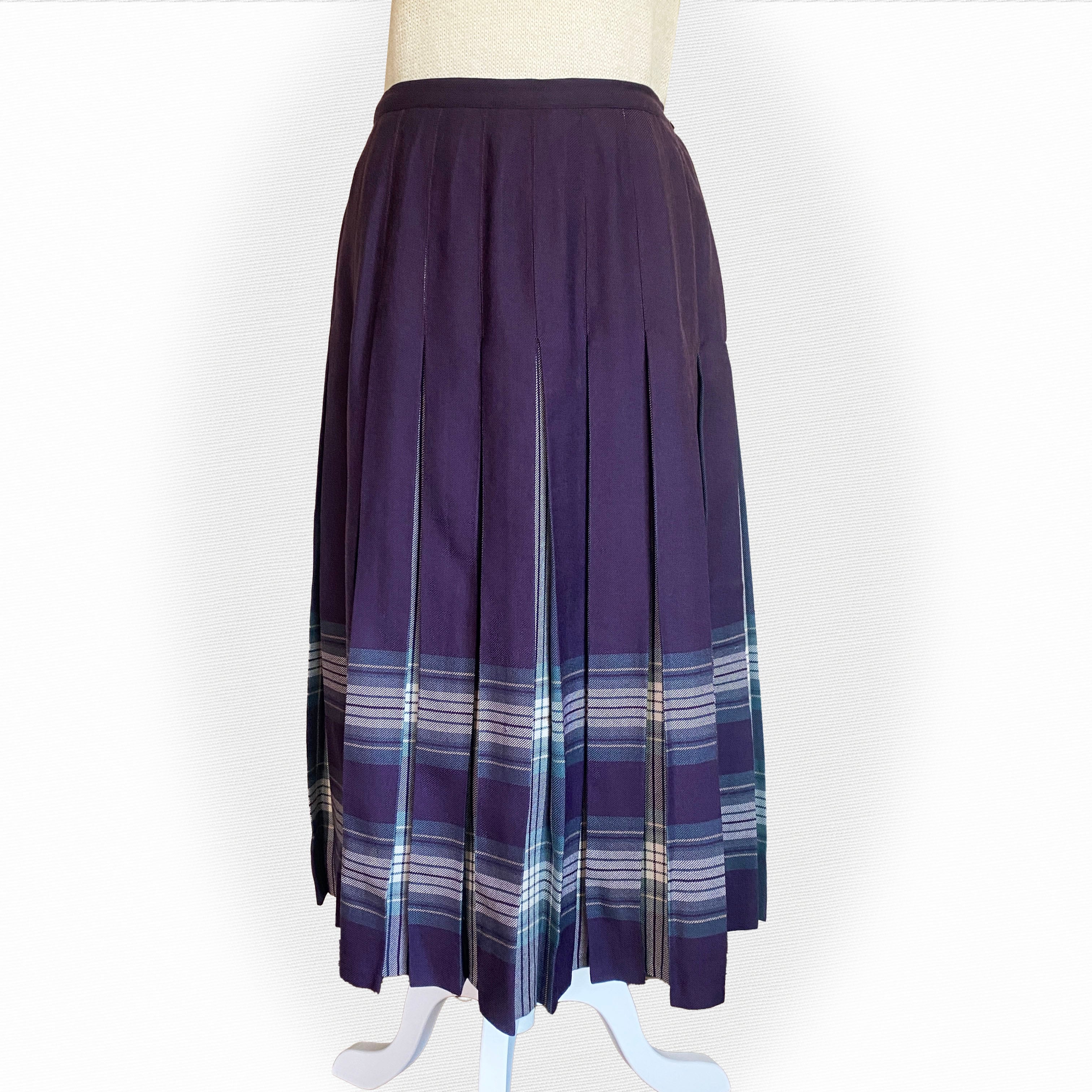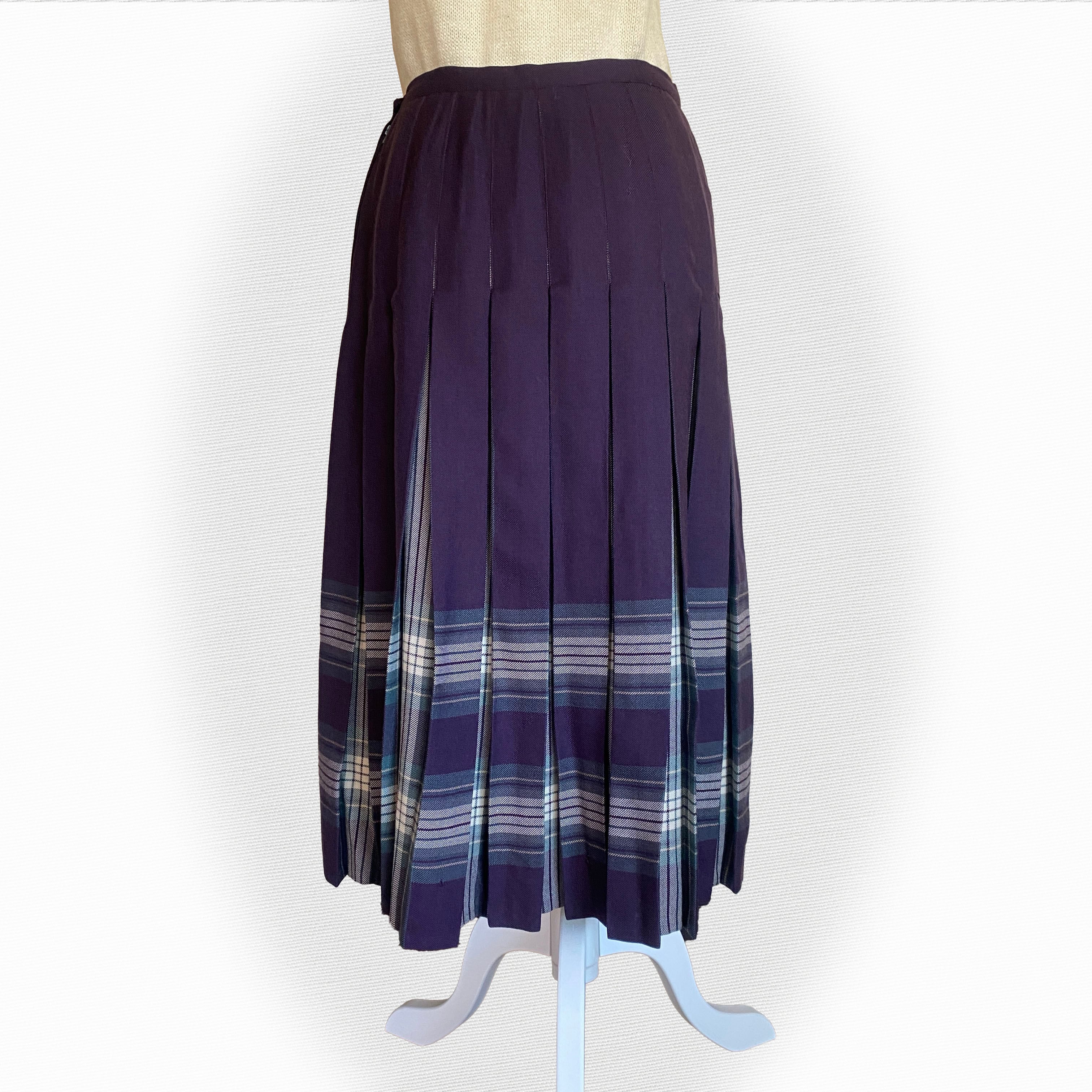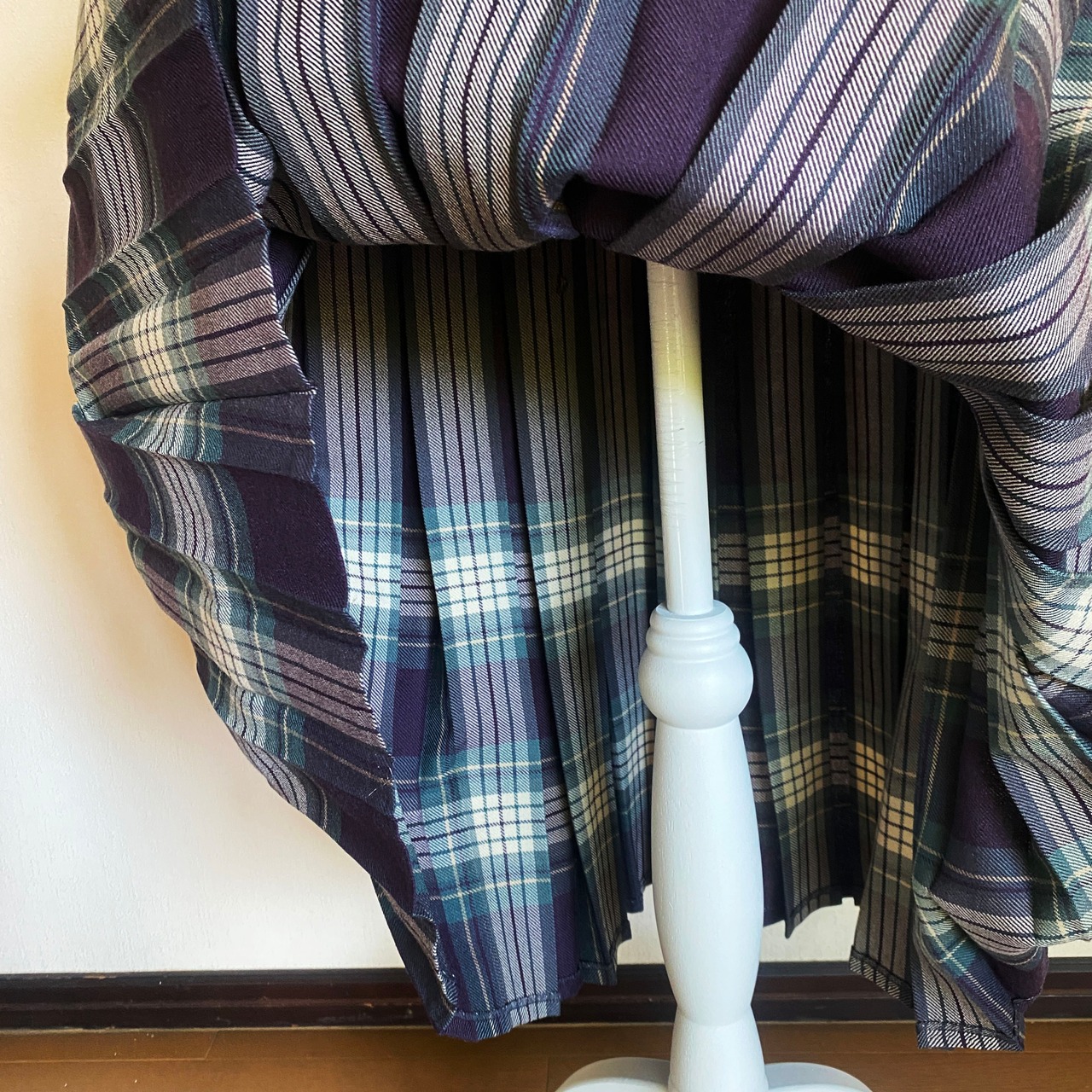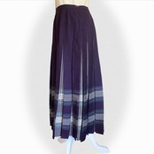 濃いパープルに、動くとのぞくホワイトのストライプ、グリーンのラインが効いたプリーツスカート。