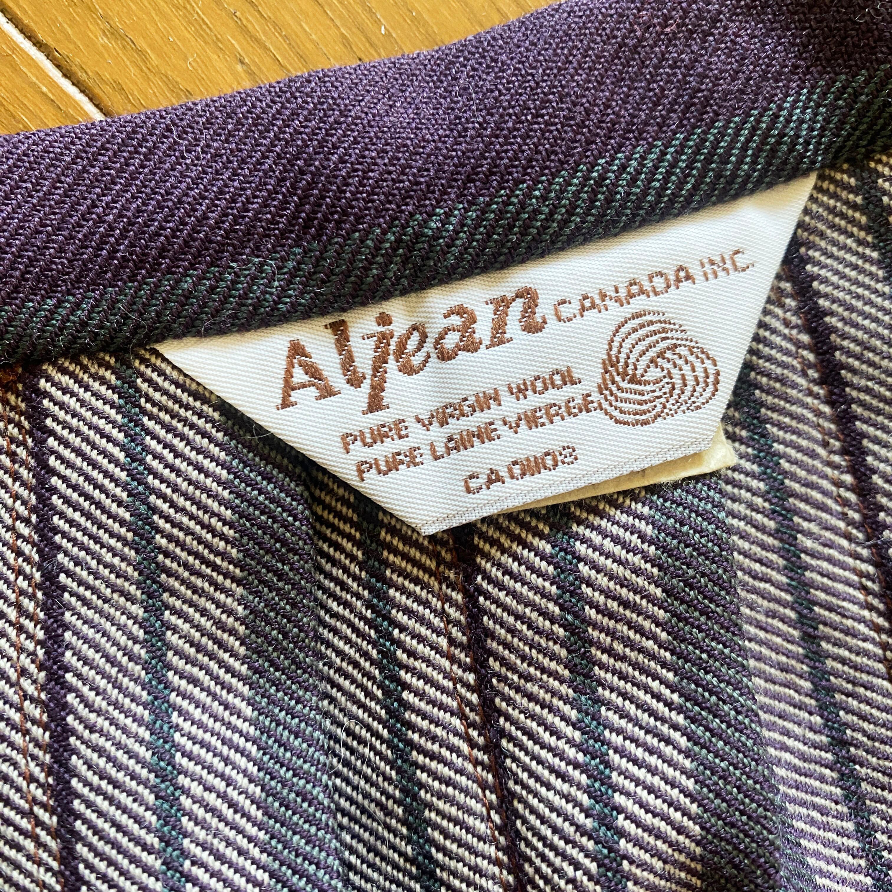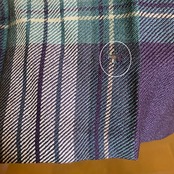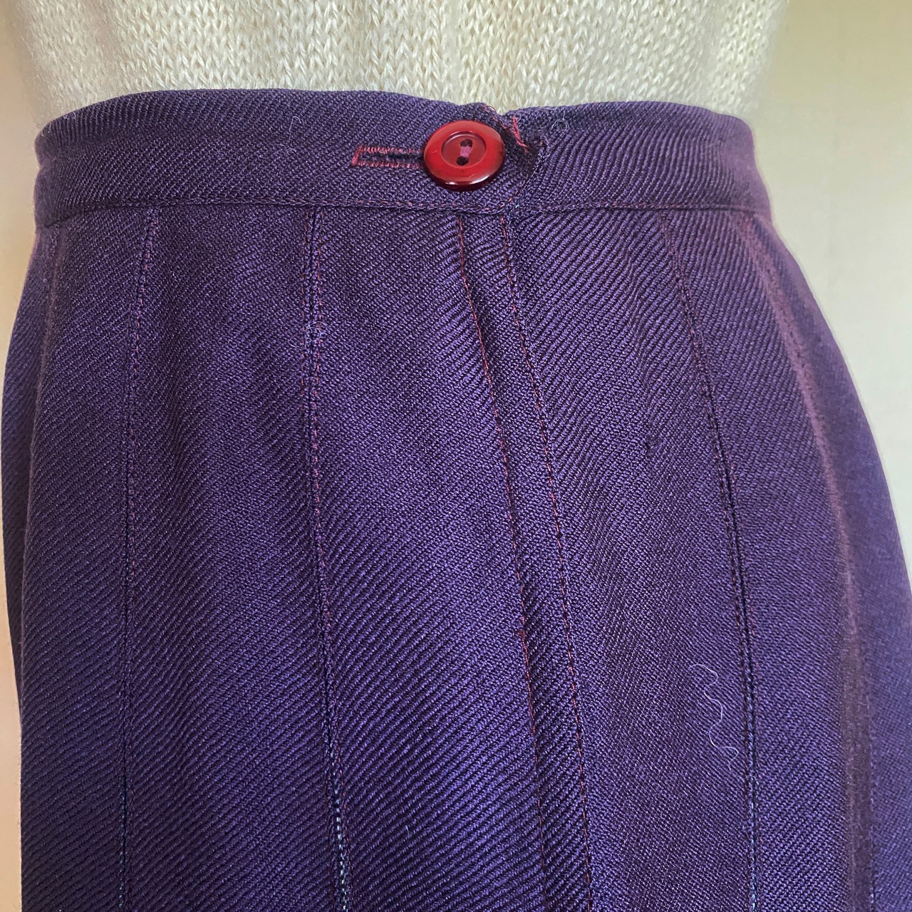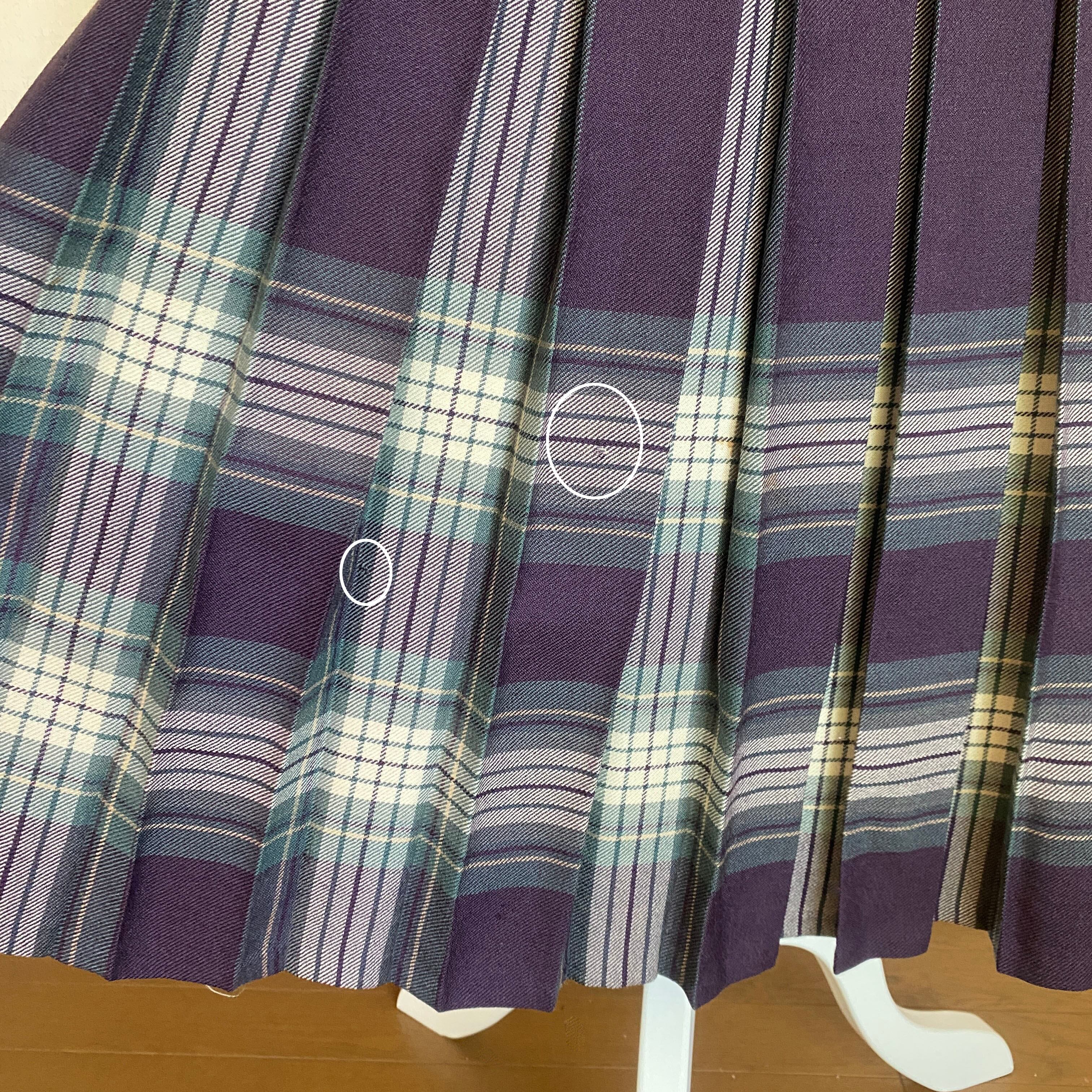 濃いパープルに、動くとのぞくホワイトのストライプ、グリーンのラインが効いたプリーツスカート。