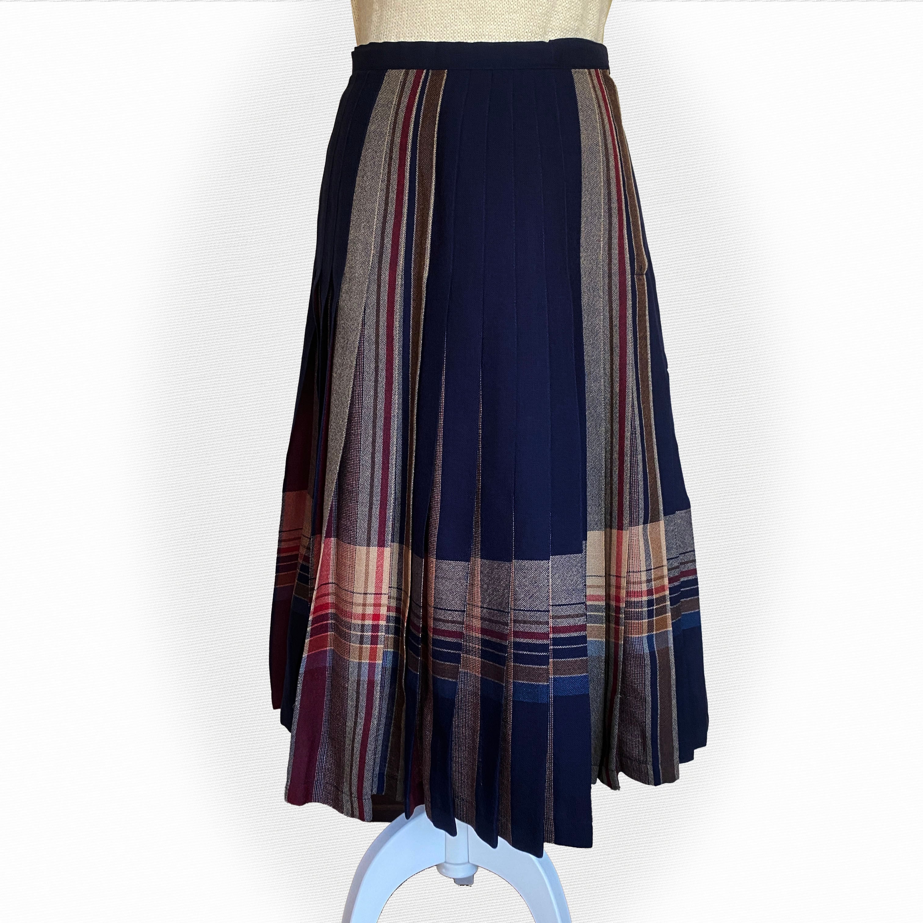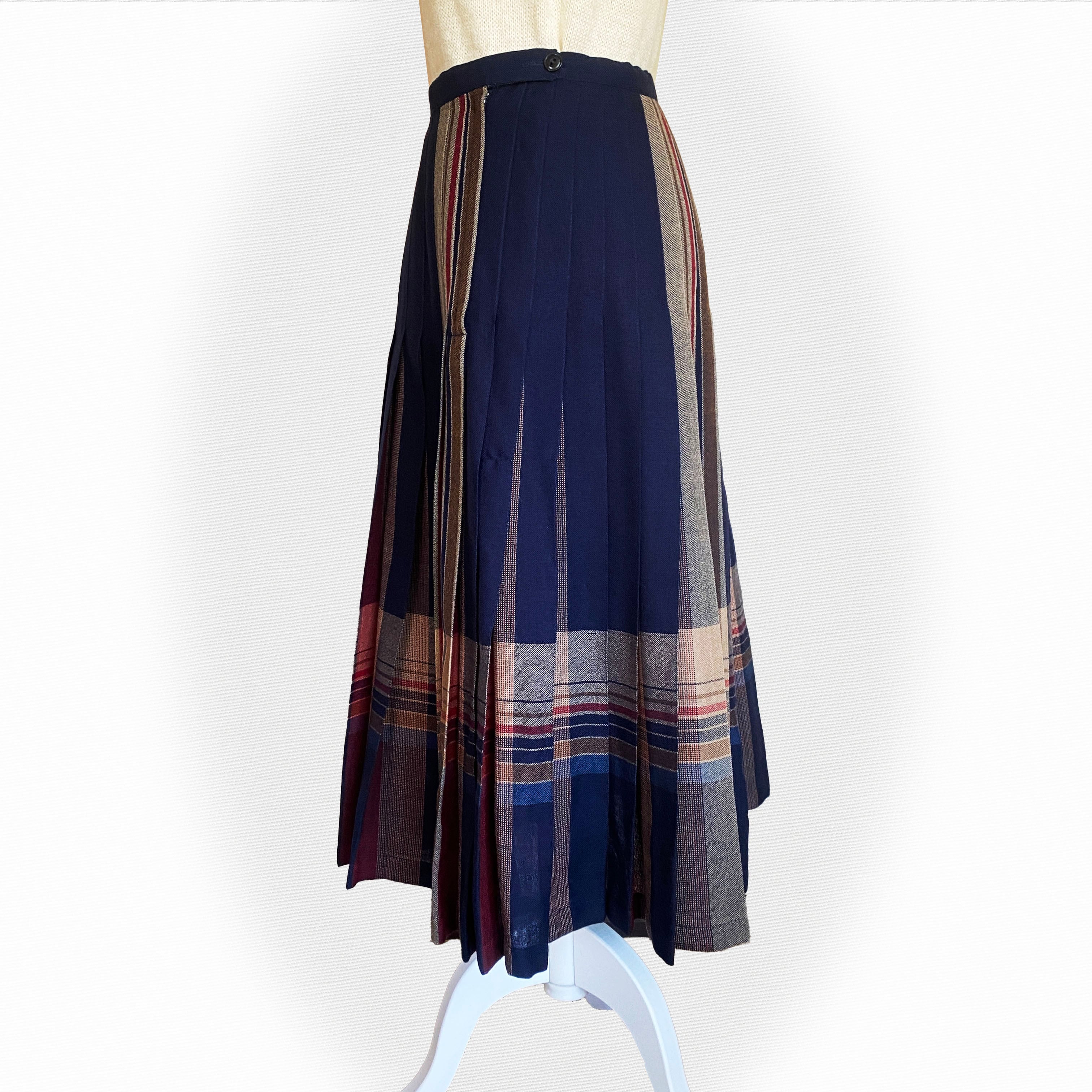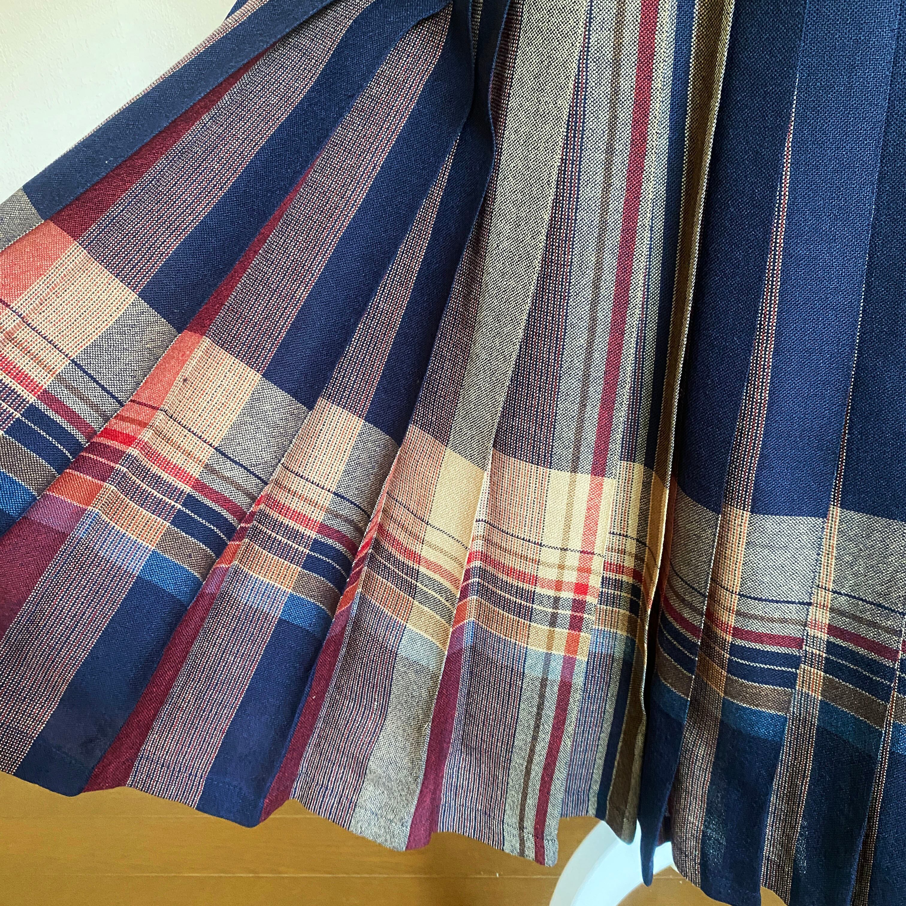 ネイビーがつくるきっちりめな印象に、左右にはいったベージュが作る縦ライン、シックな赤が効いた、トラッドでいながら新しい、ありそうでないプリーツスカートがこちら。