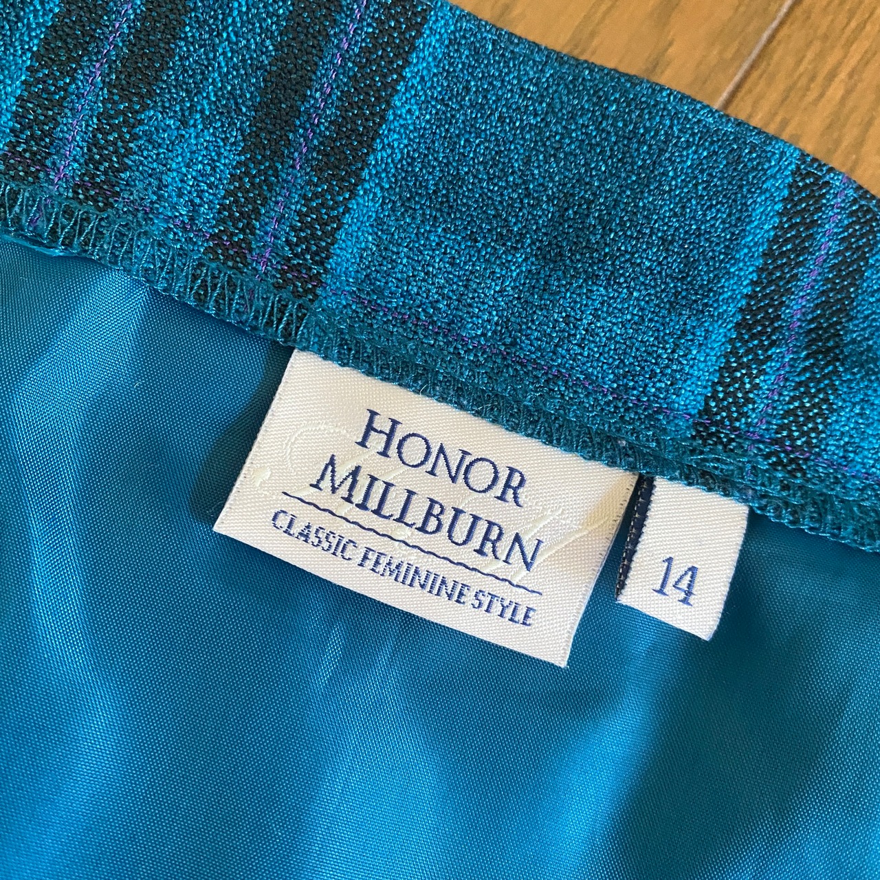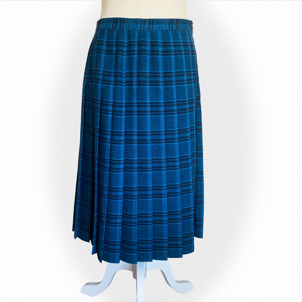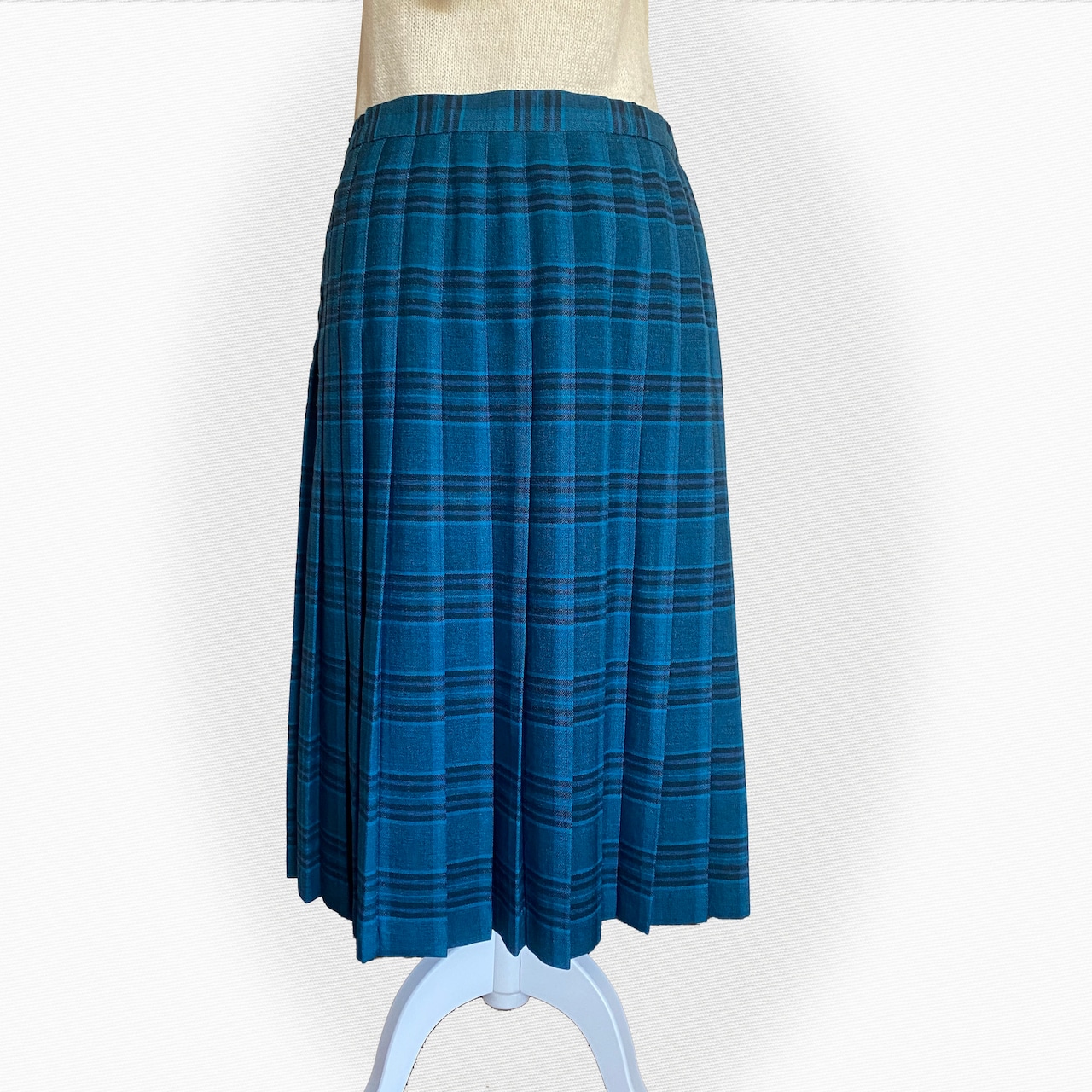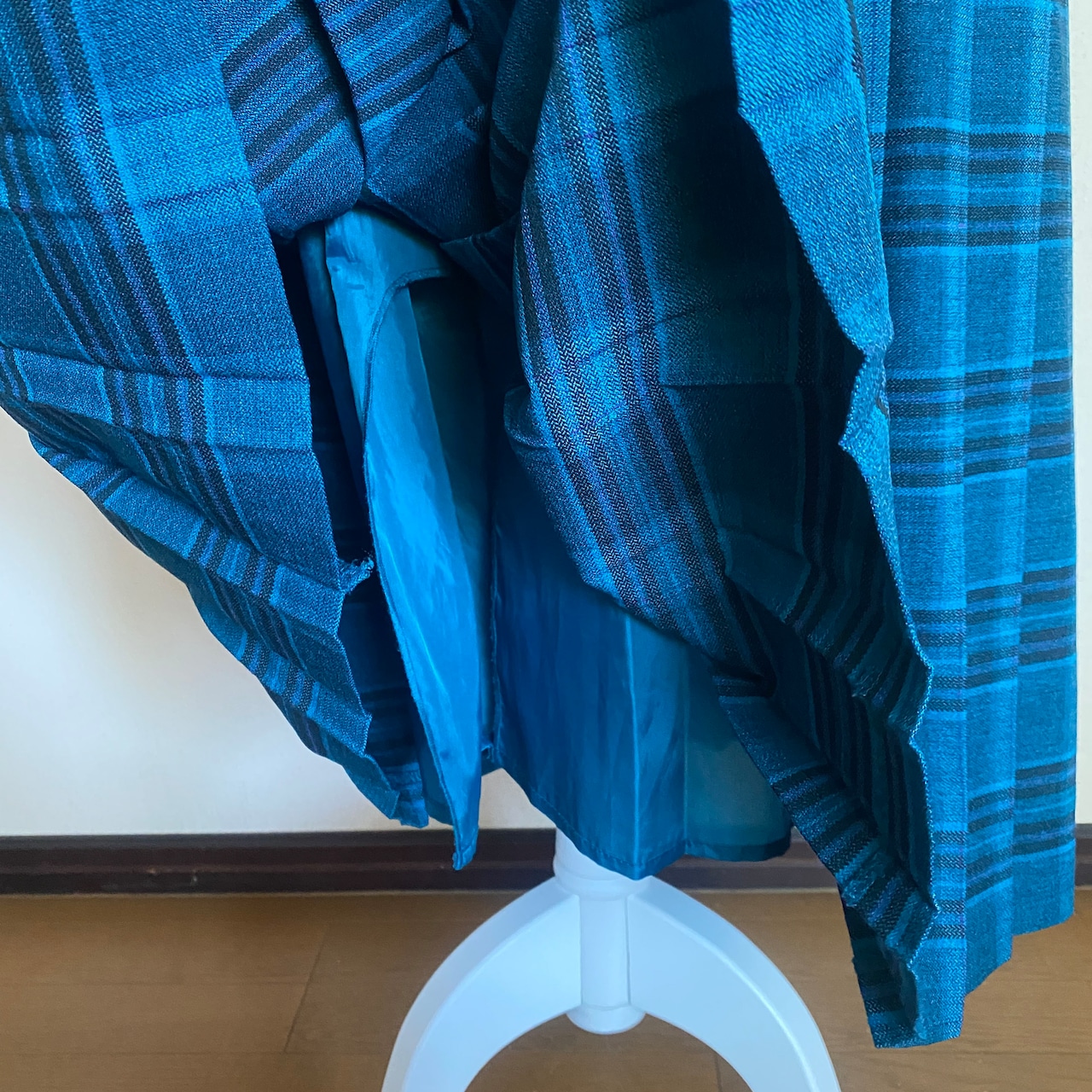 鮮やかなブルーに一枚グレートーンを重ねたような、全体にチェックが入ったプリーツスカート。