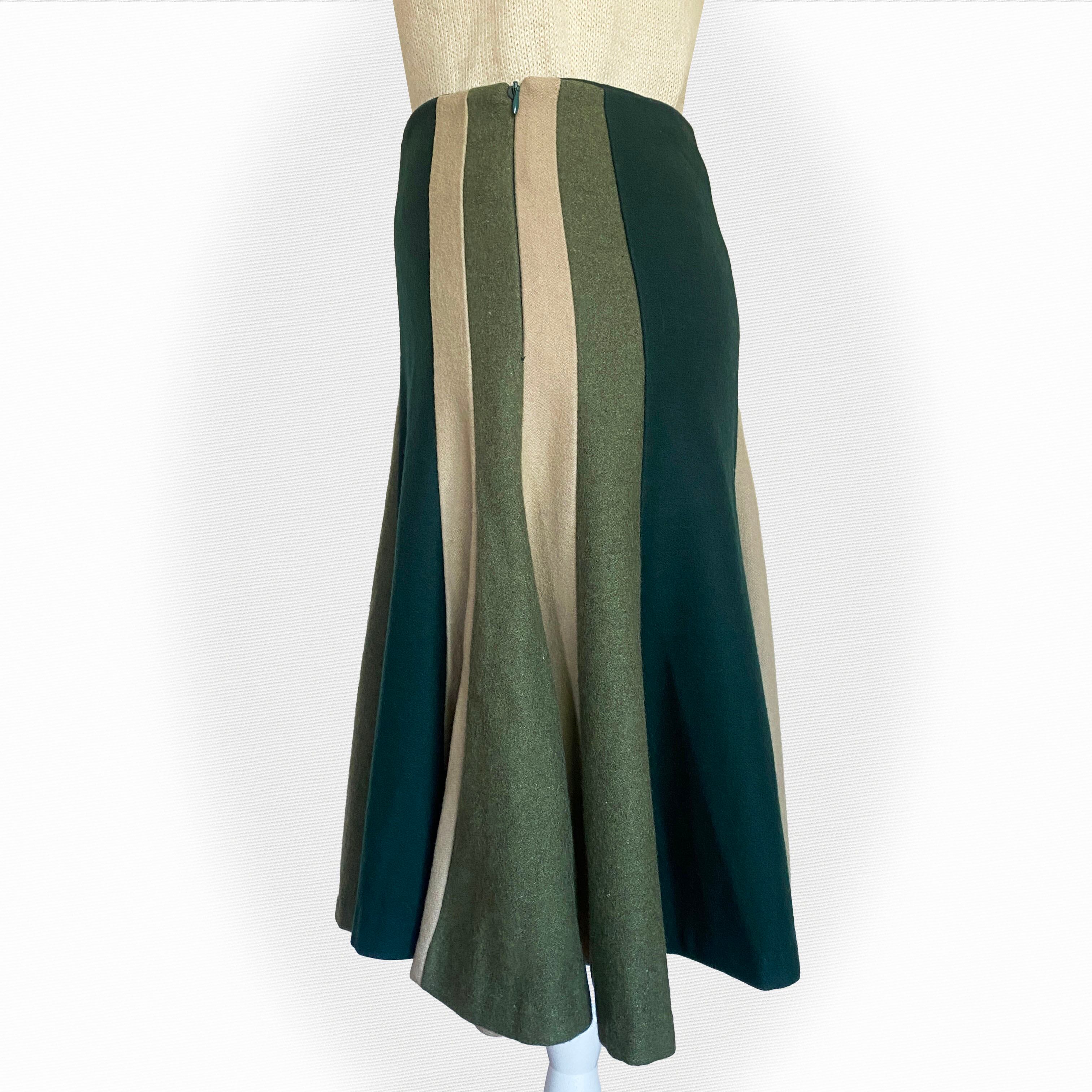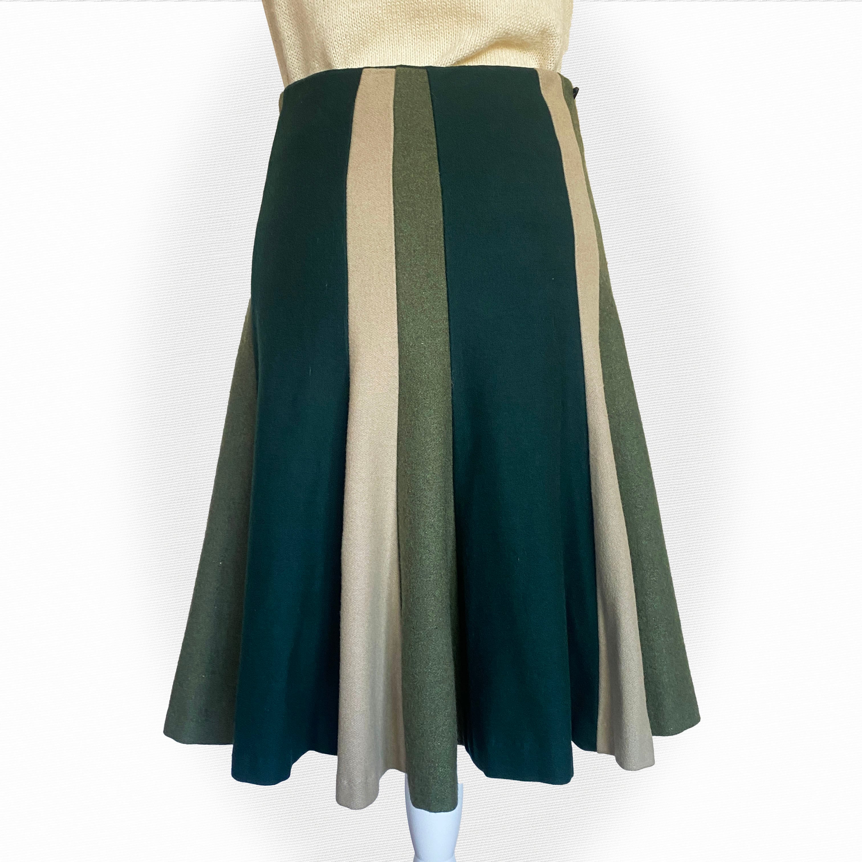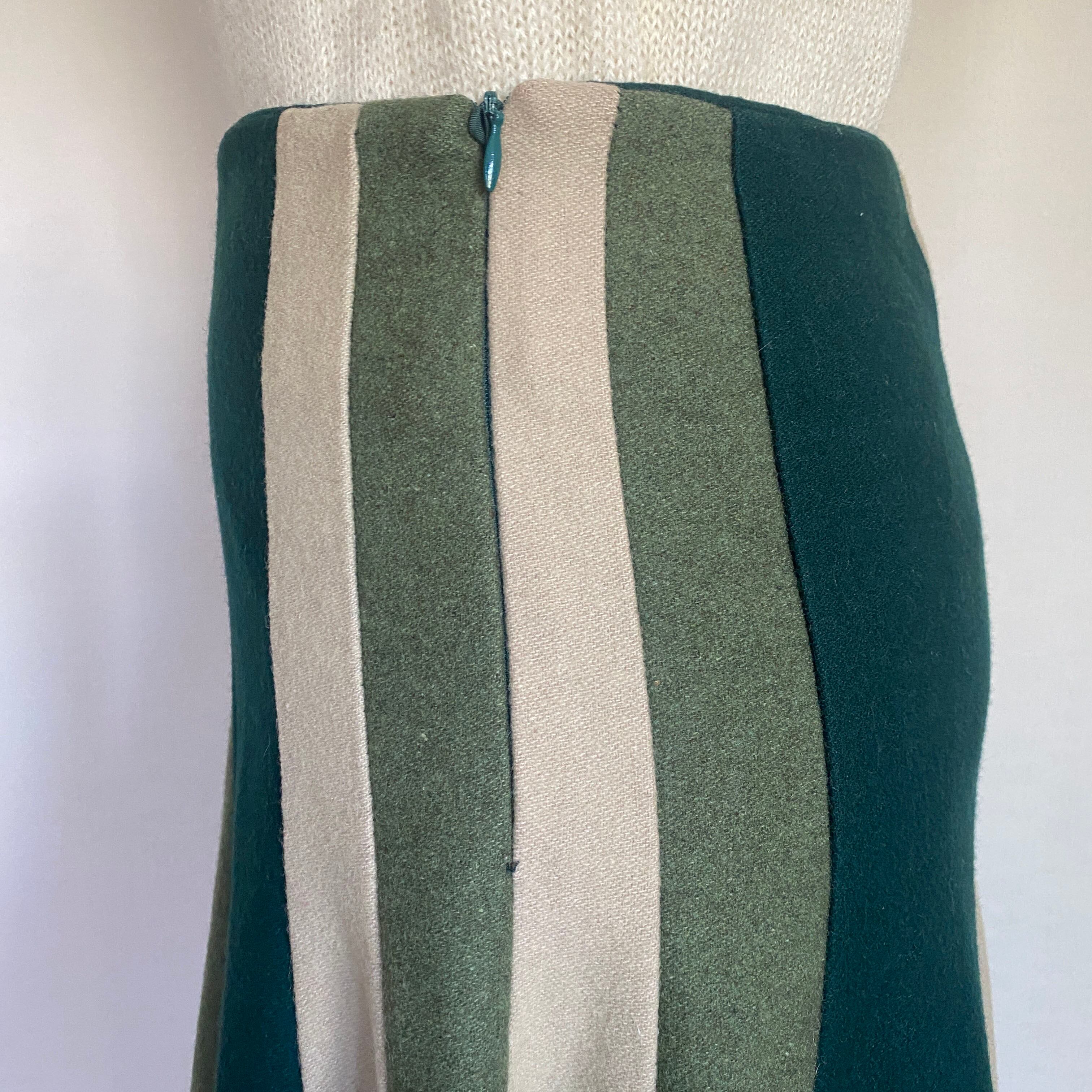 ランダムな幅で縦に切り替えた3色のコンビネーションがかわいい、グリーンがお好きなあなたにお届けしたいフレアスカート。