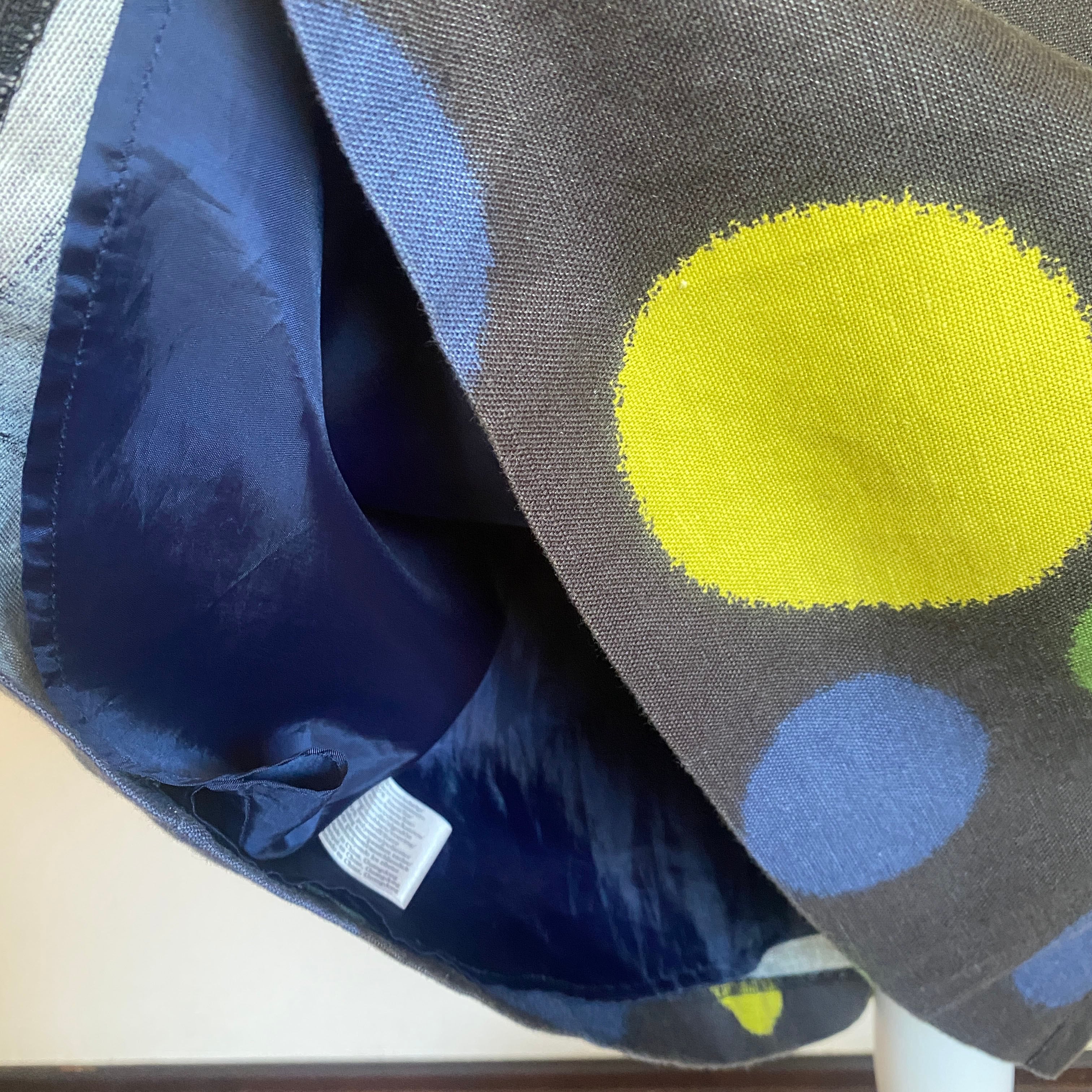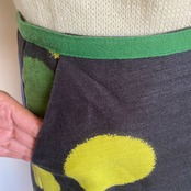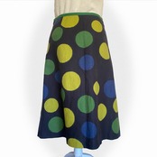 濃いめのグレーに、イエローグリーン・グリーン・ブルーのトーンが揃った大きなドットが目をひくスカート。