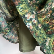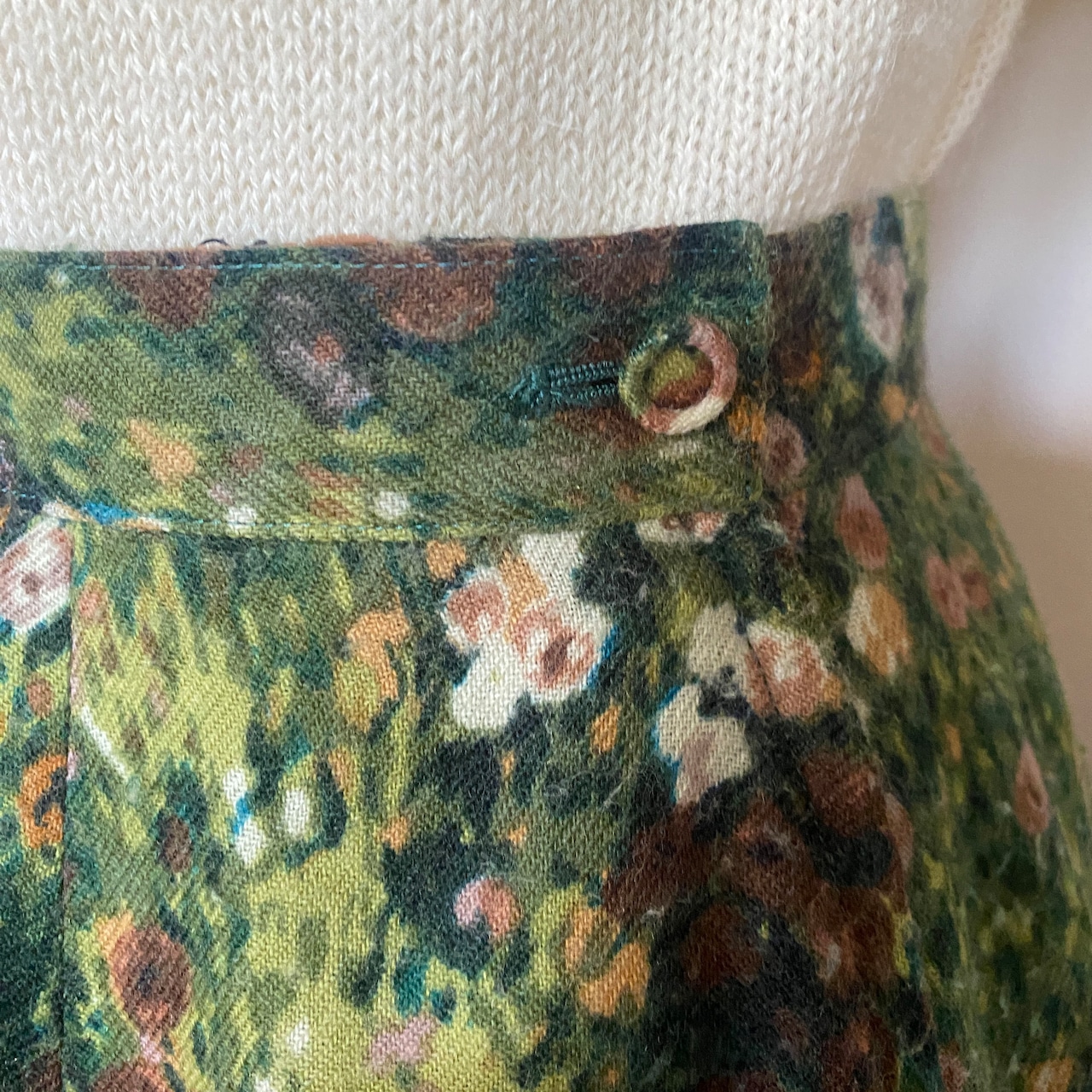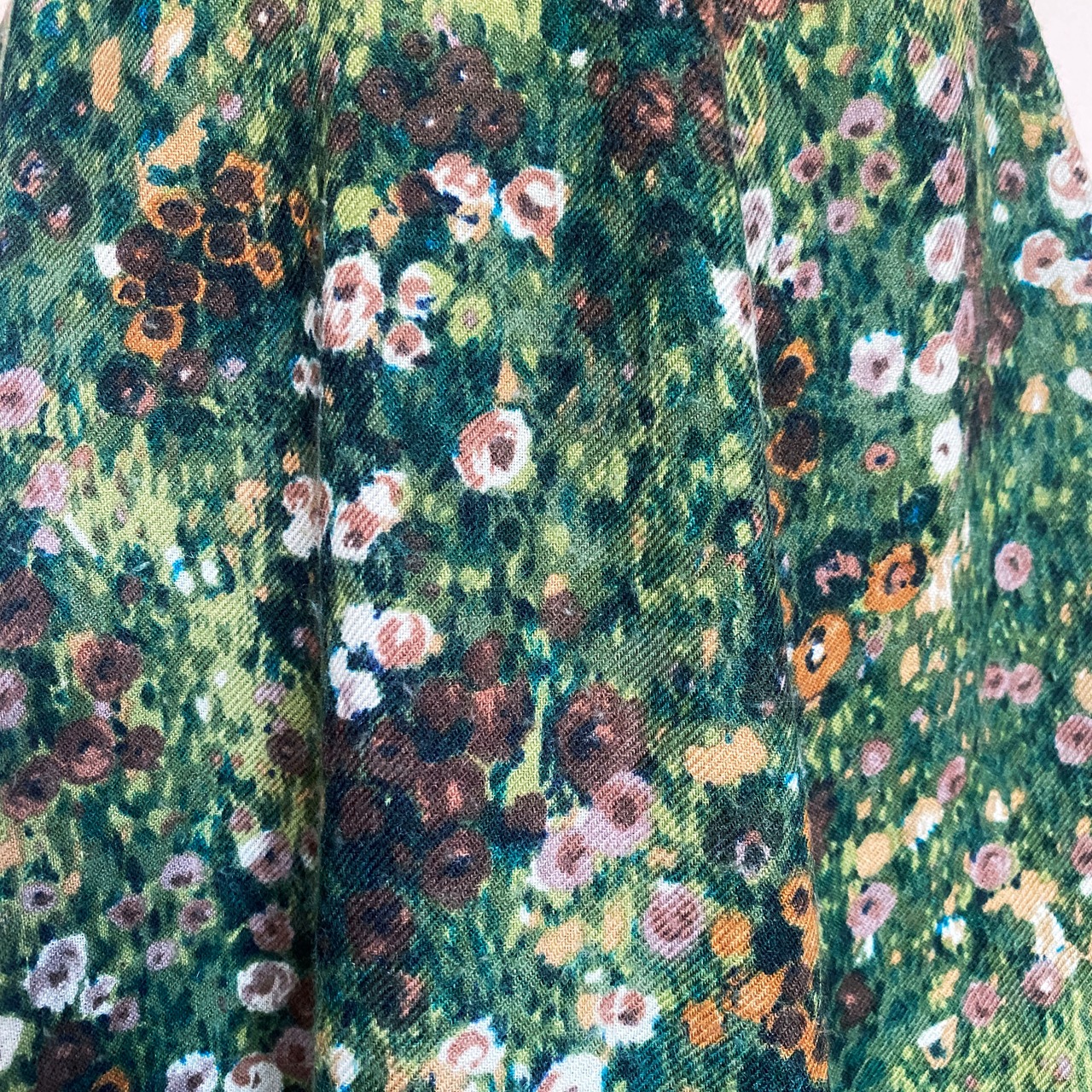 ふわりとした温かい生地に、一面の花畑が広がっている、フレアスカート。