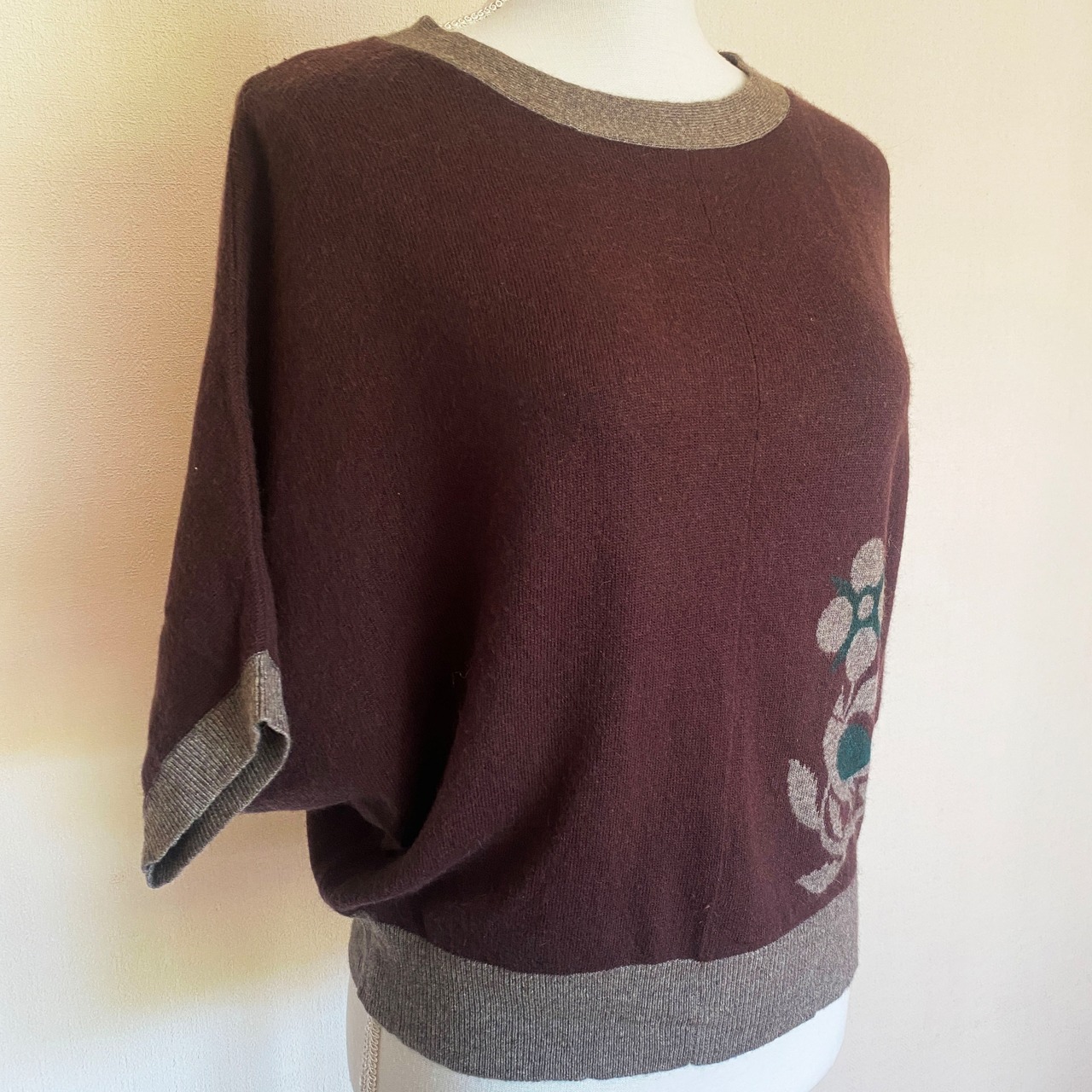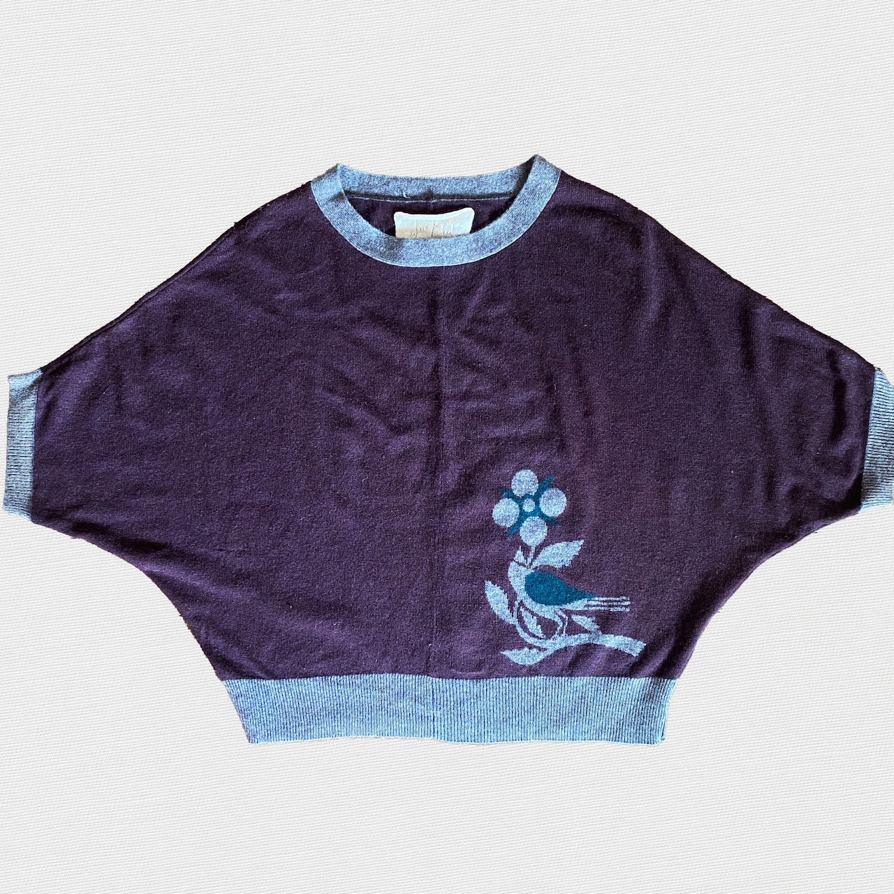 ふわふわとした柔らかいブラウンに、お花と鳥のモチーフが添えられたニット。