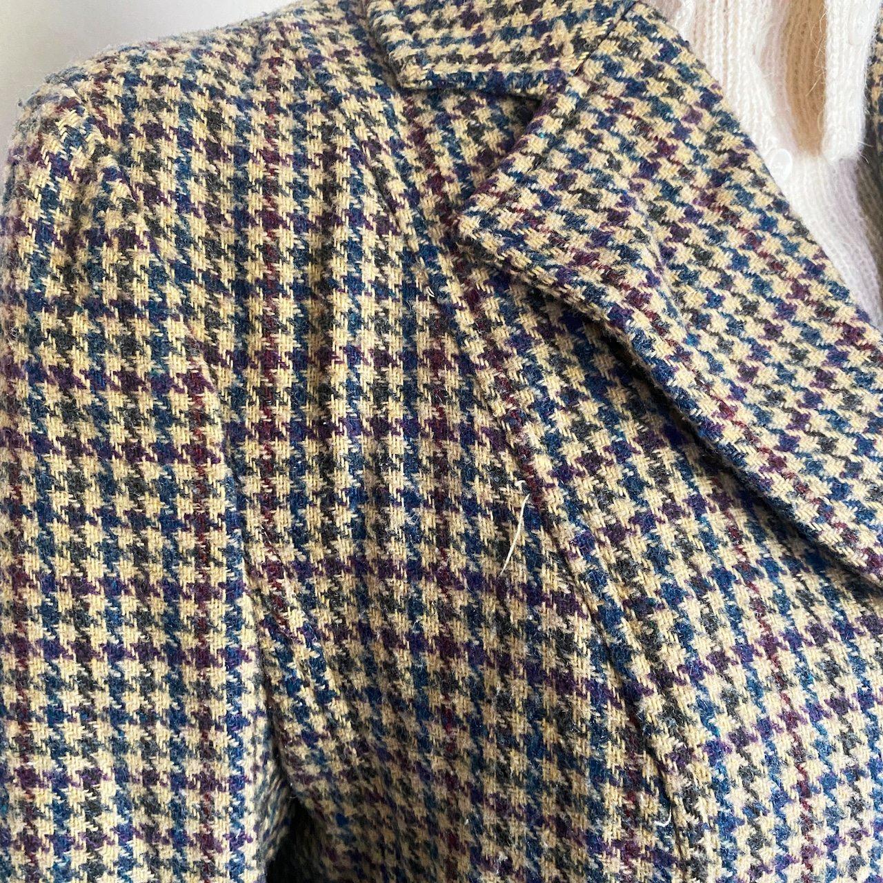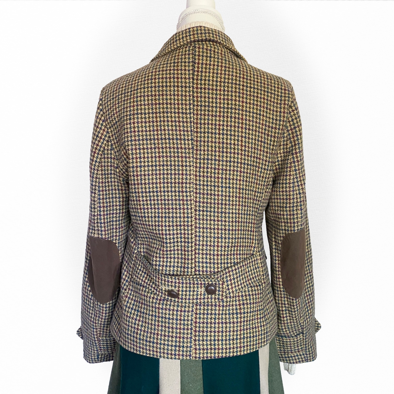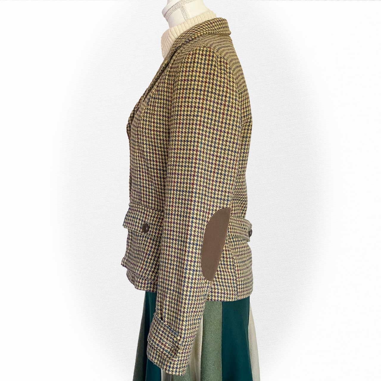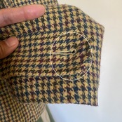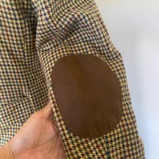 肘あてのついた千鳥格子のジャケット。