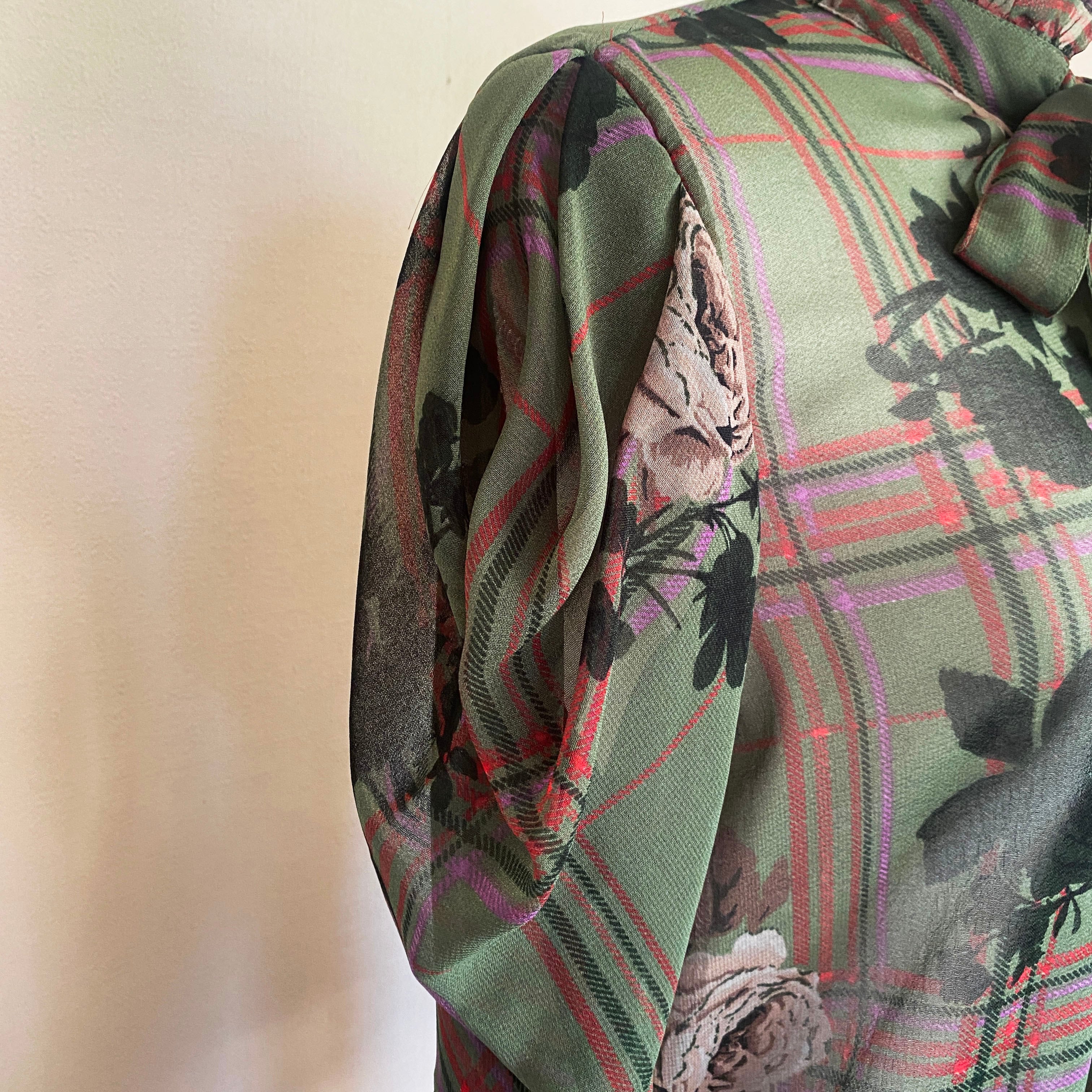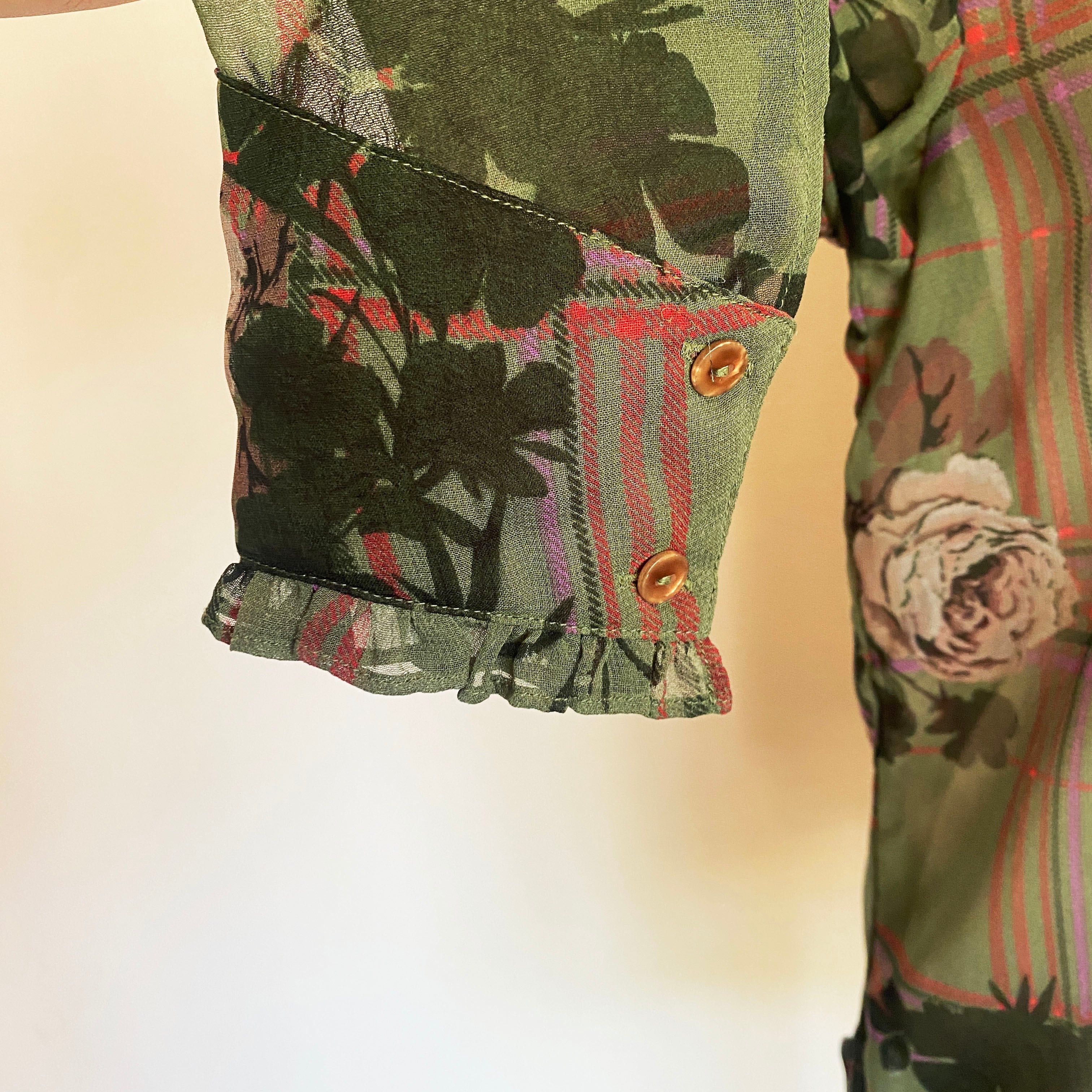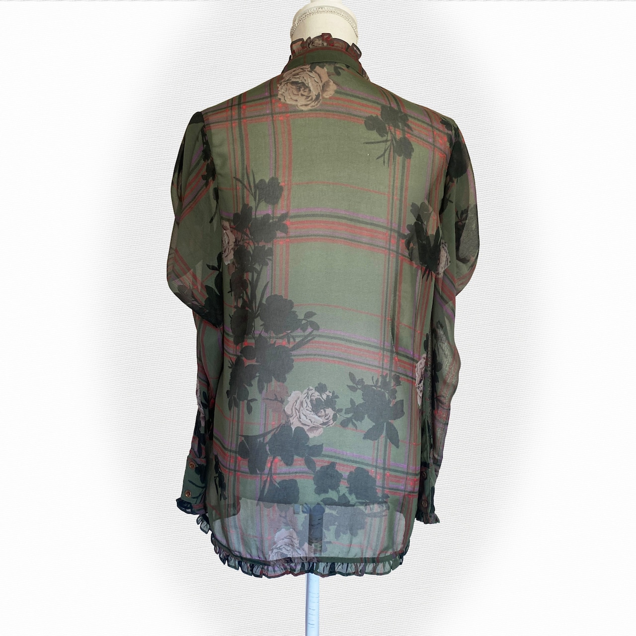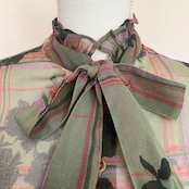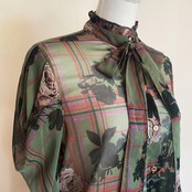 シアーなカーキ地に、シルエットの薔薇と、ビビッドなピンクのチェック模様が効いたシャツ。