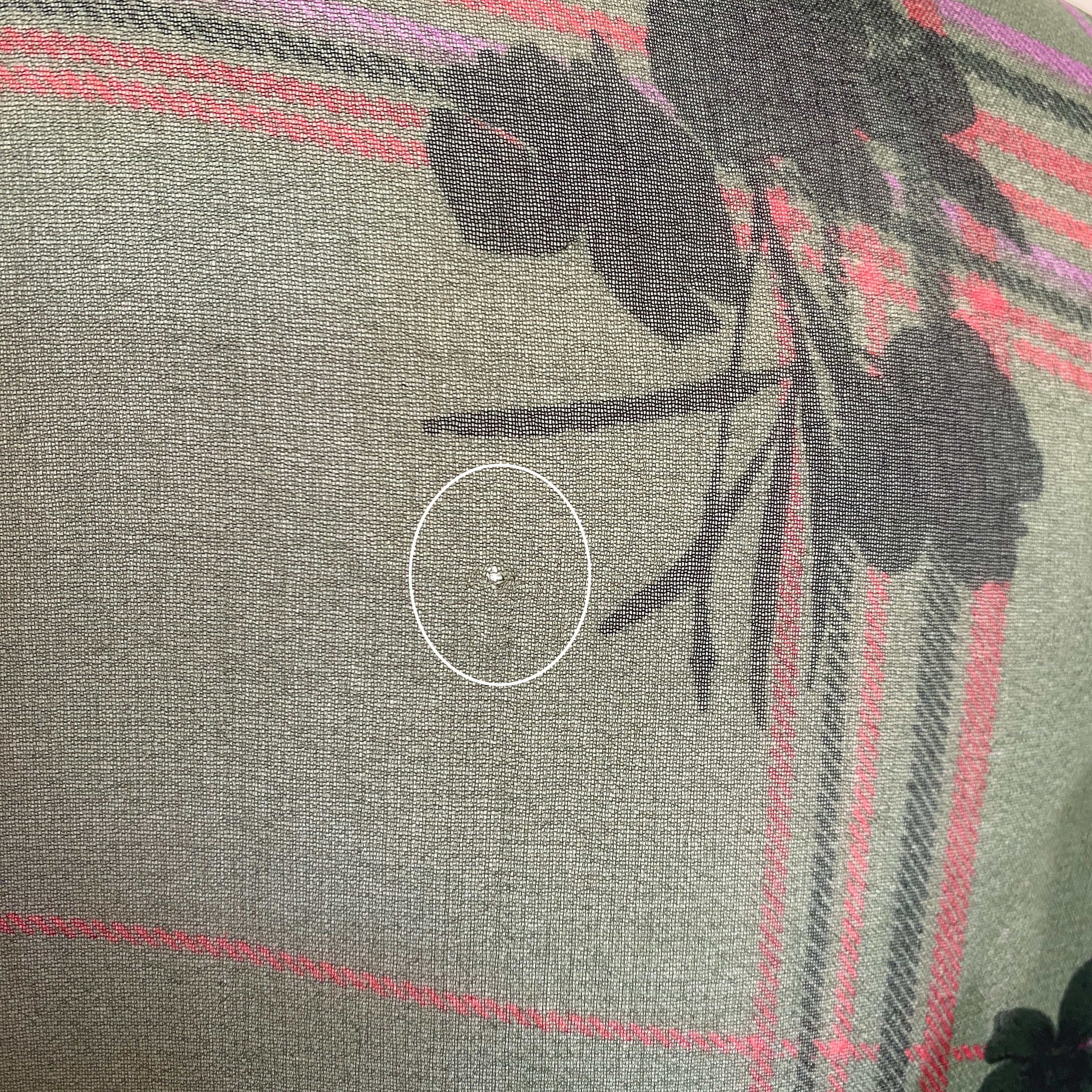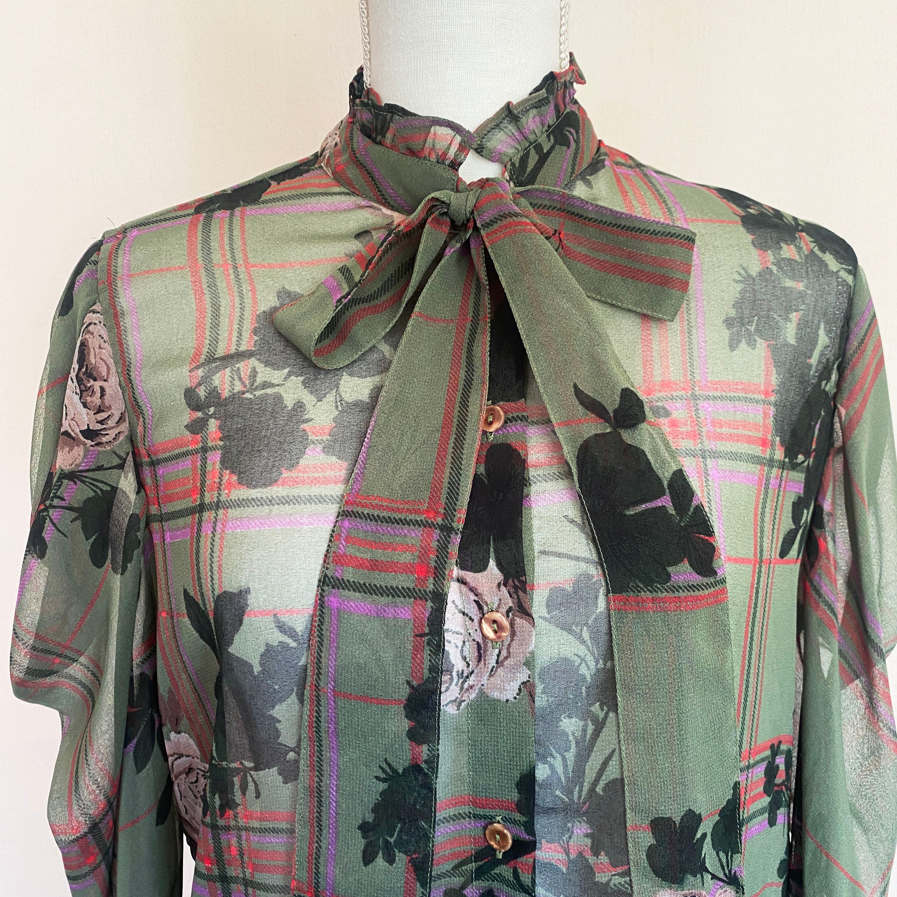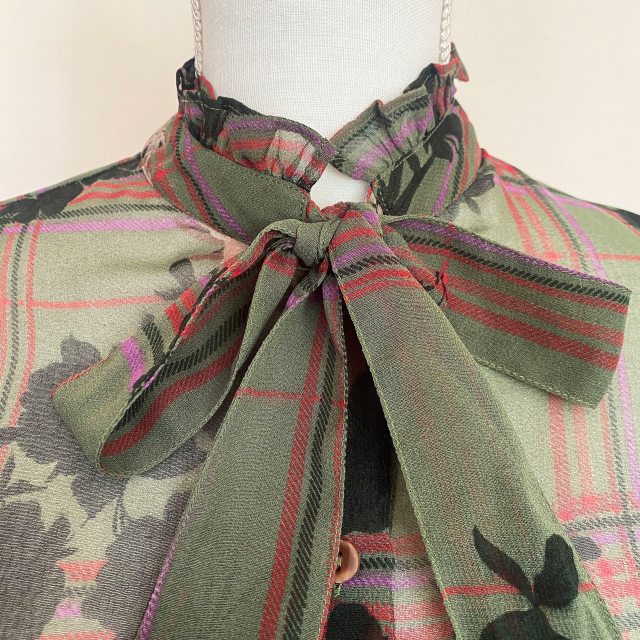 シアーなカーキ地に、シルエットの薔薇と、ビビッドなピンクのチェック模様が効いたシャツ。