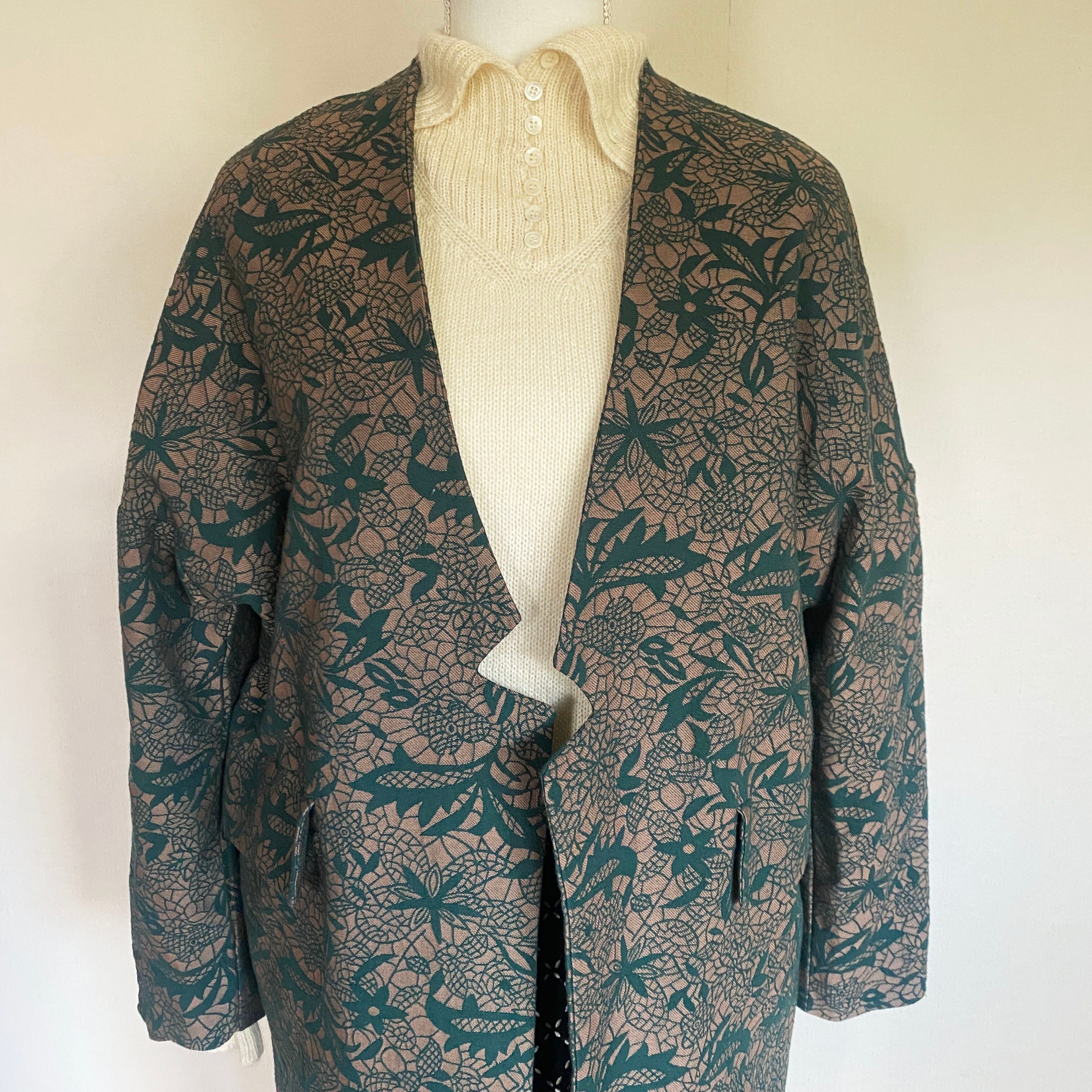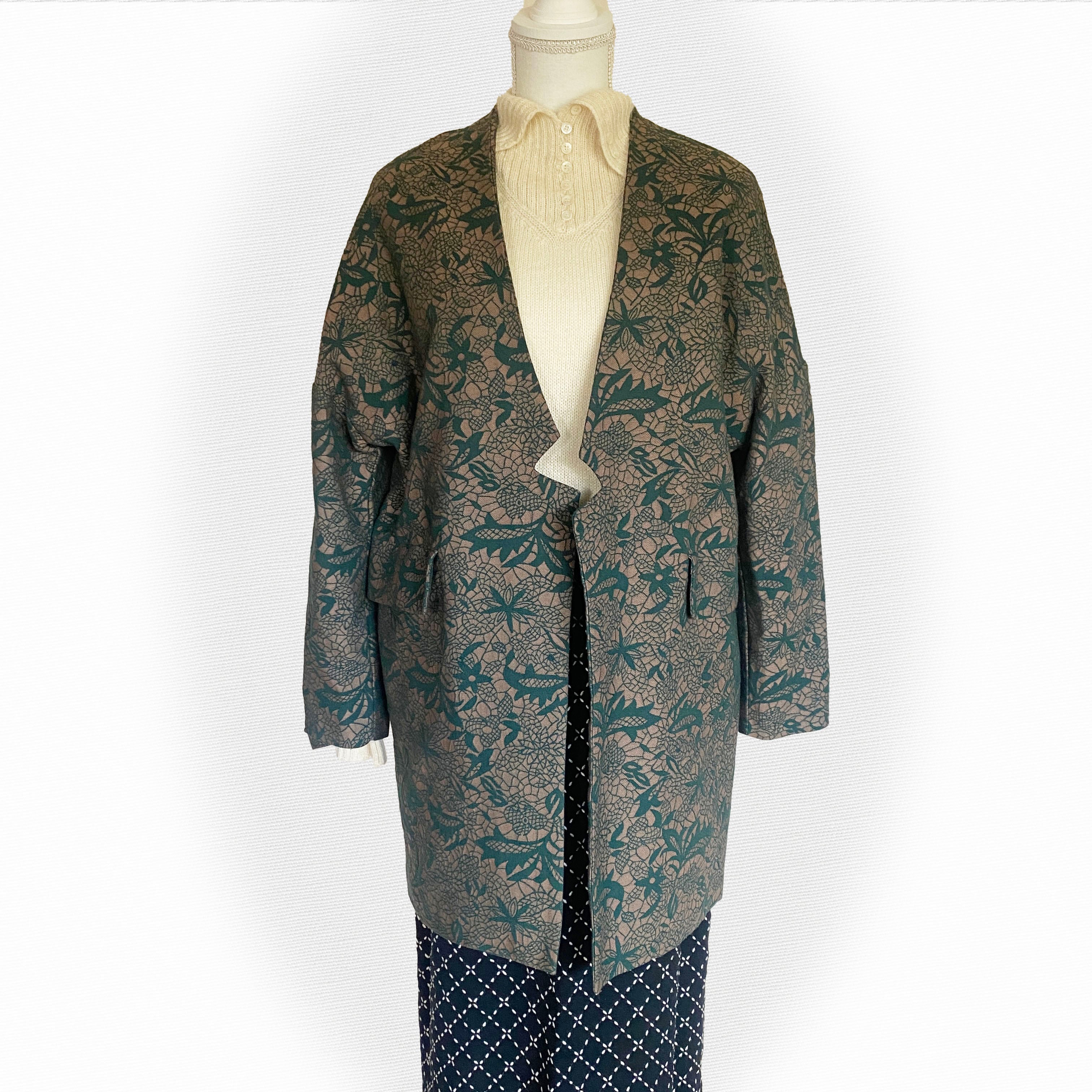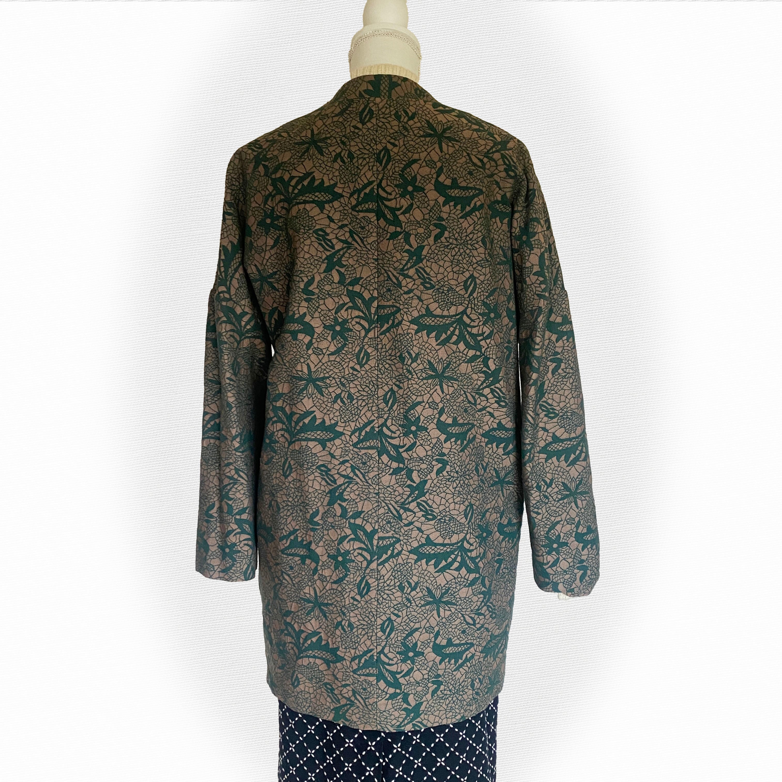 ブラウンに濃いグリーンで浮き出すようにボタニカルレースのような模様を織ったジャケット。