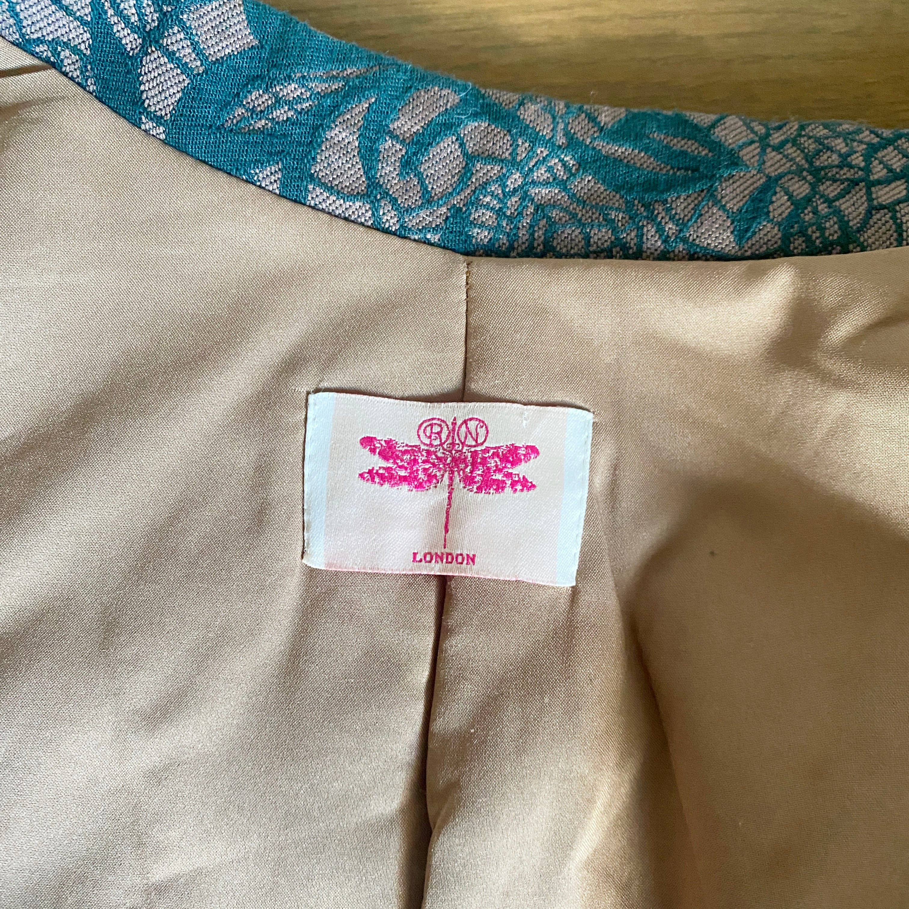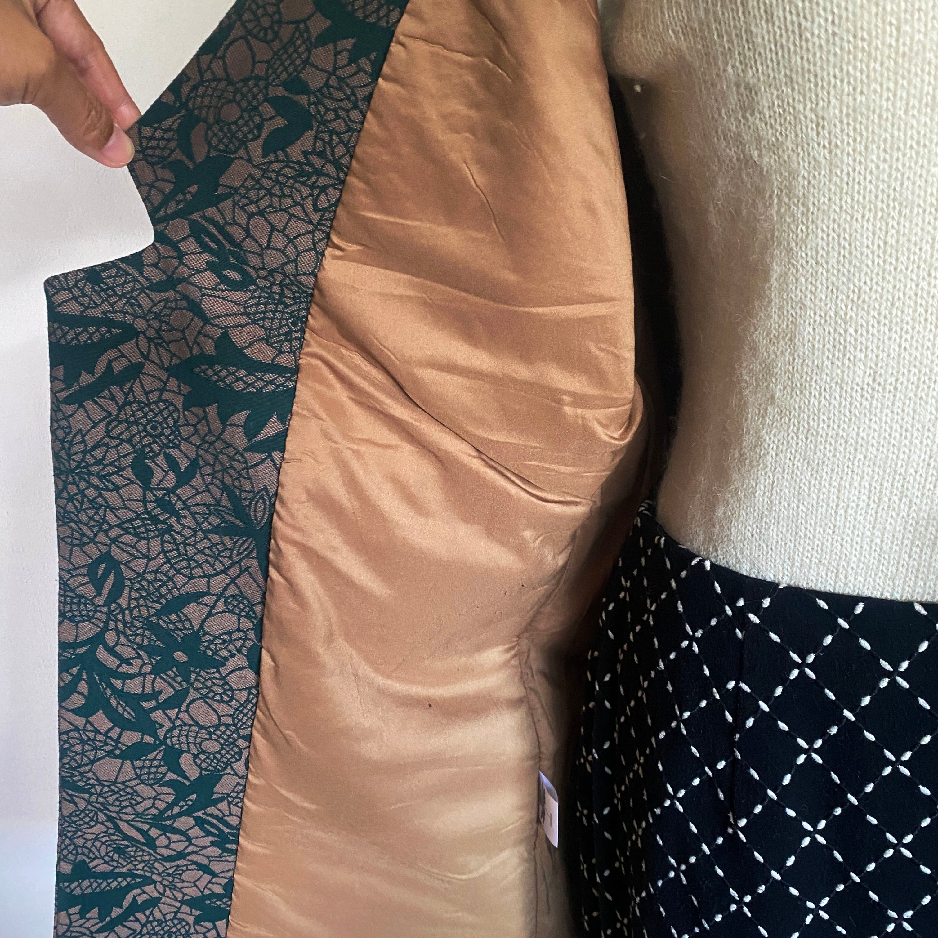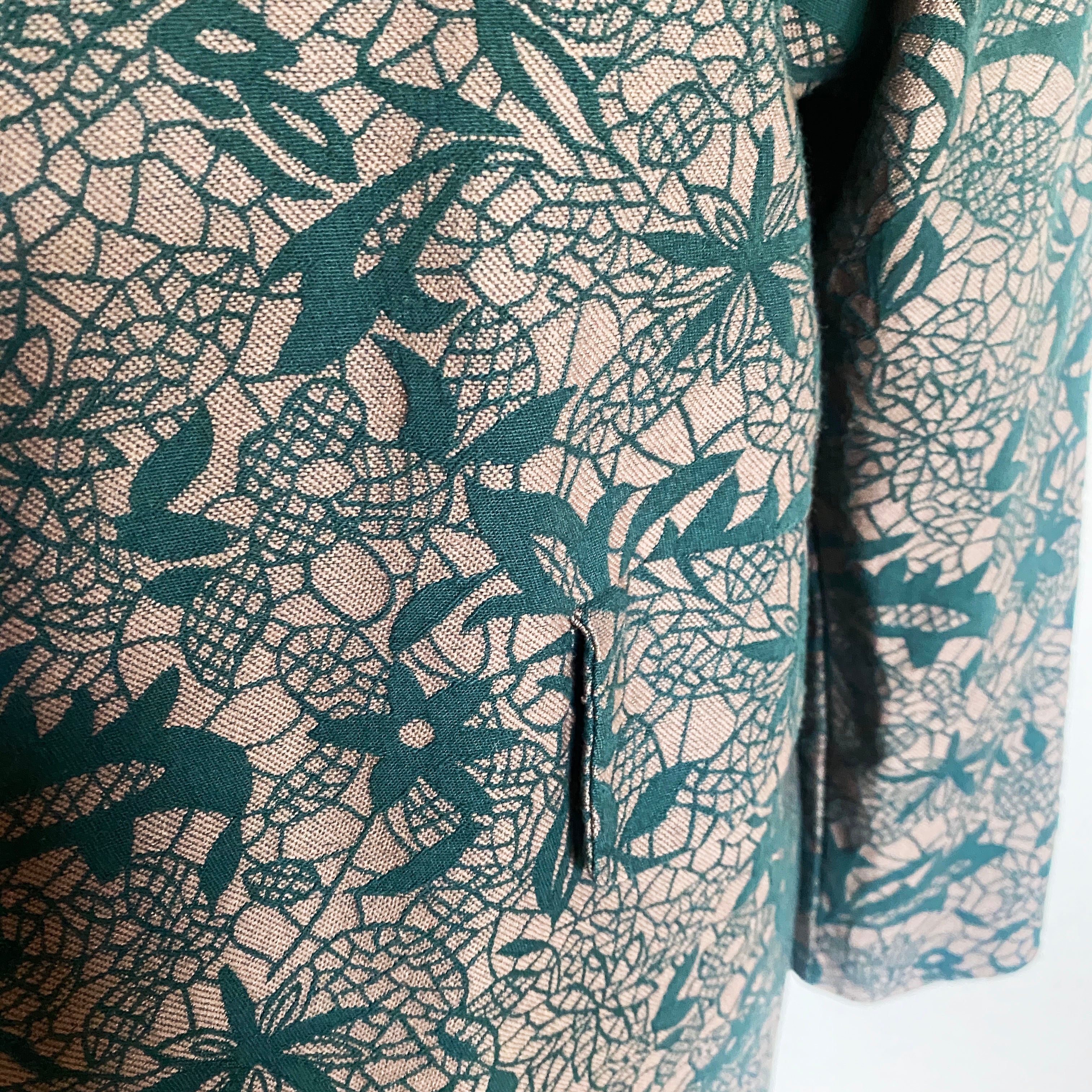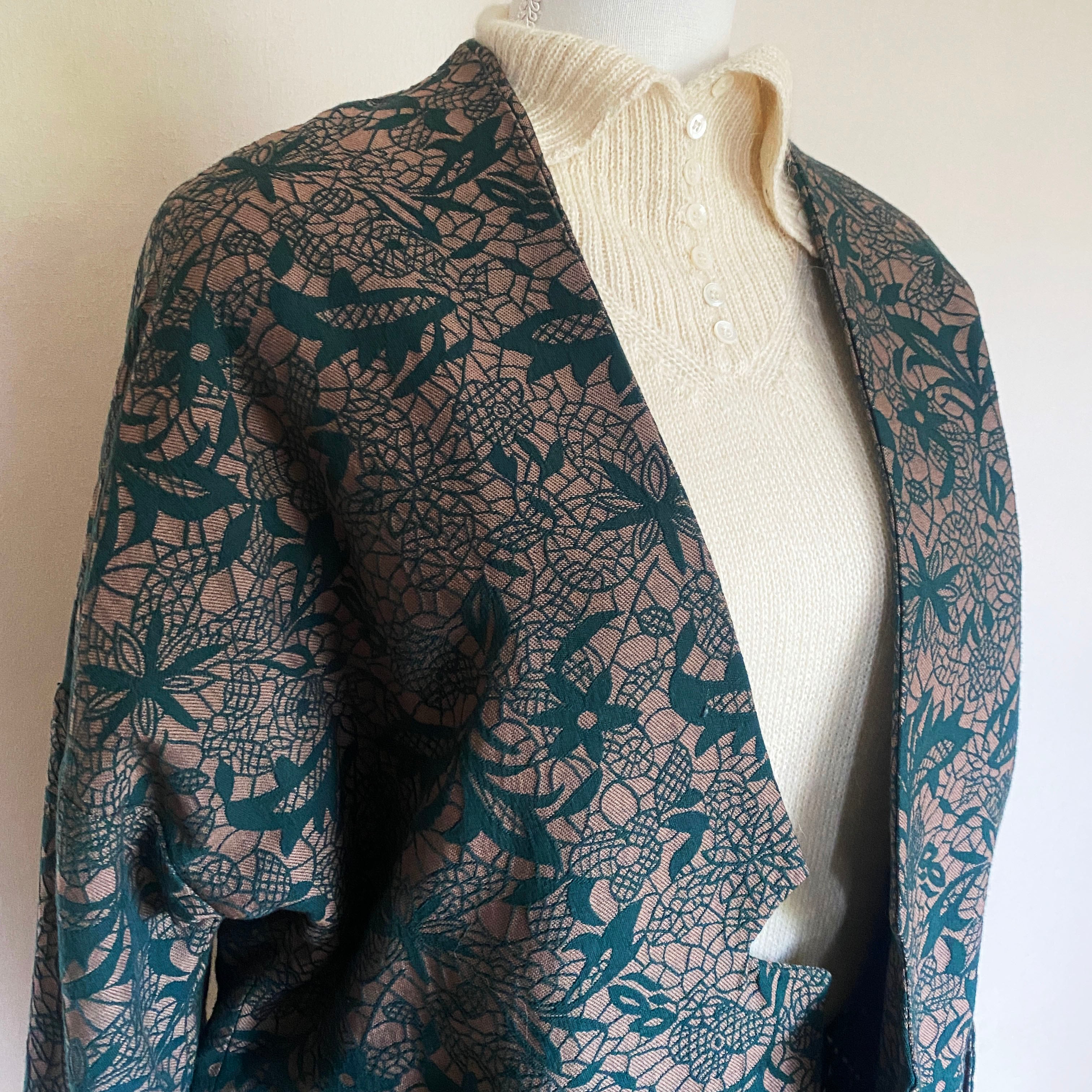 ブラウンに濃いグリーンで浮き出すようにボタニカルレースのような模様を織ったジャケット。