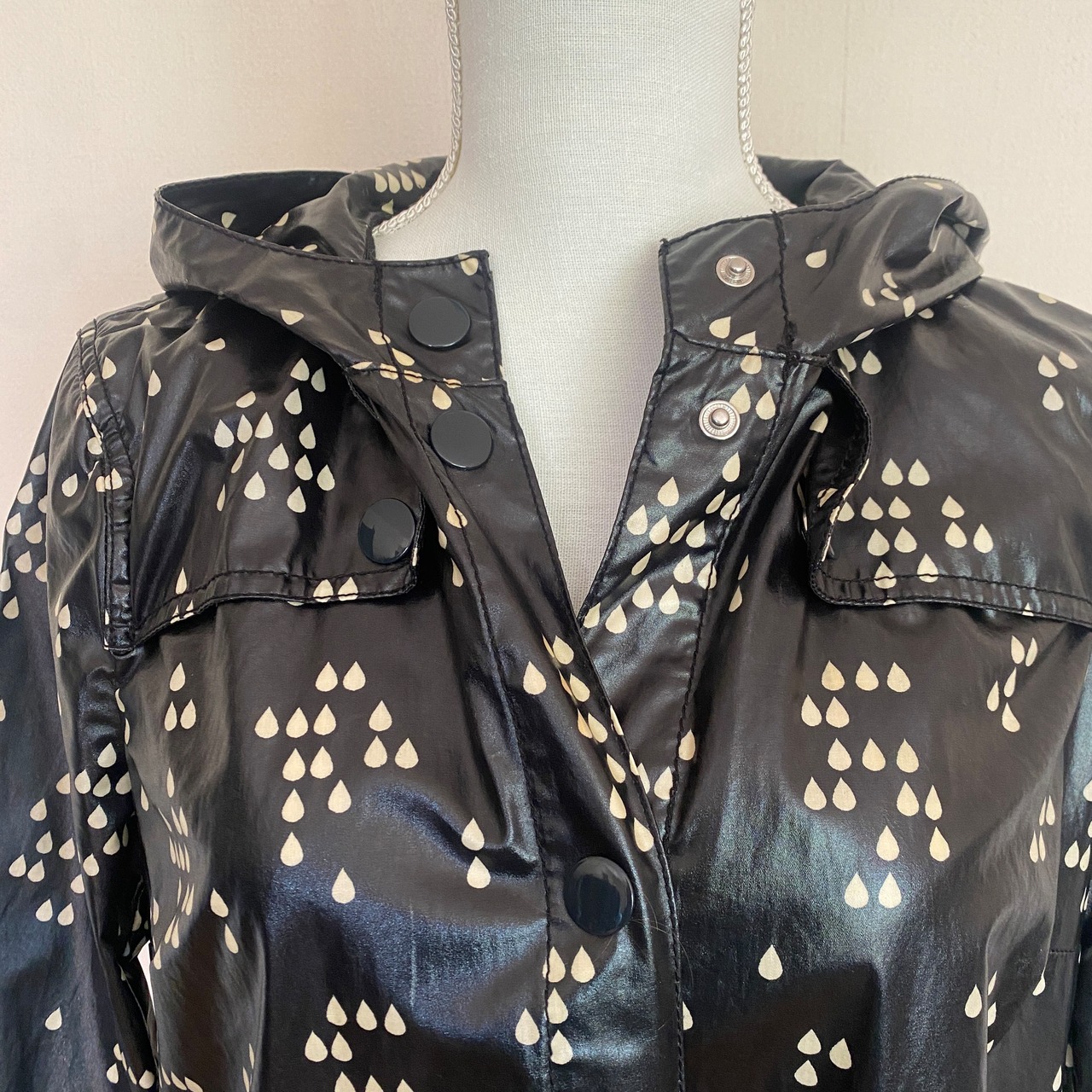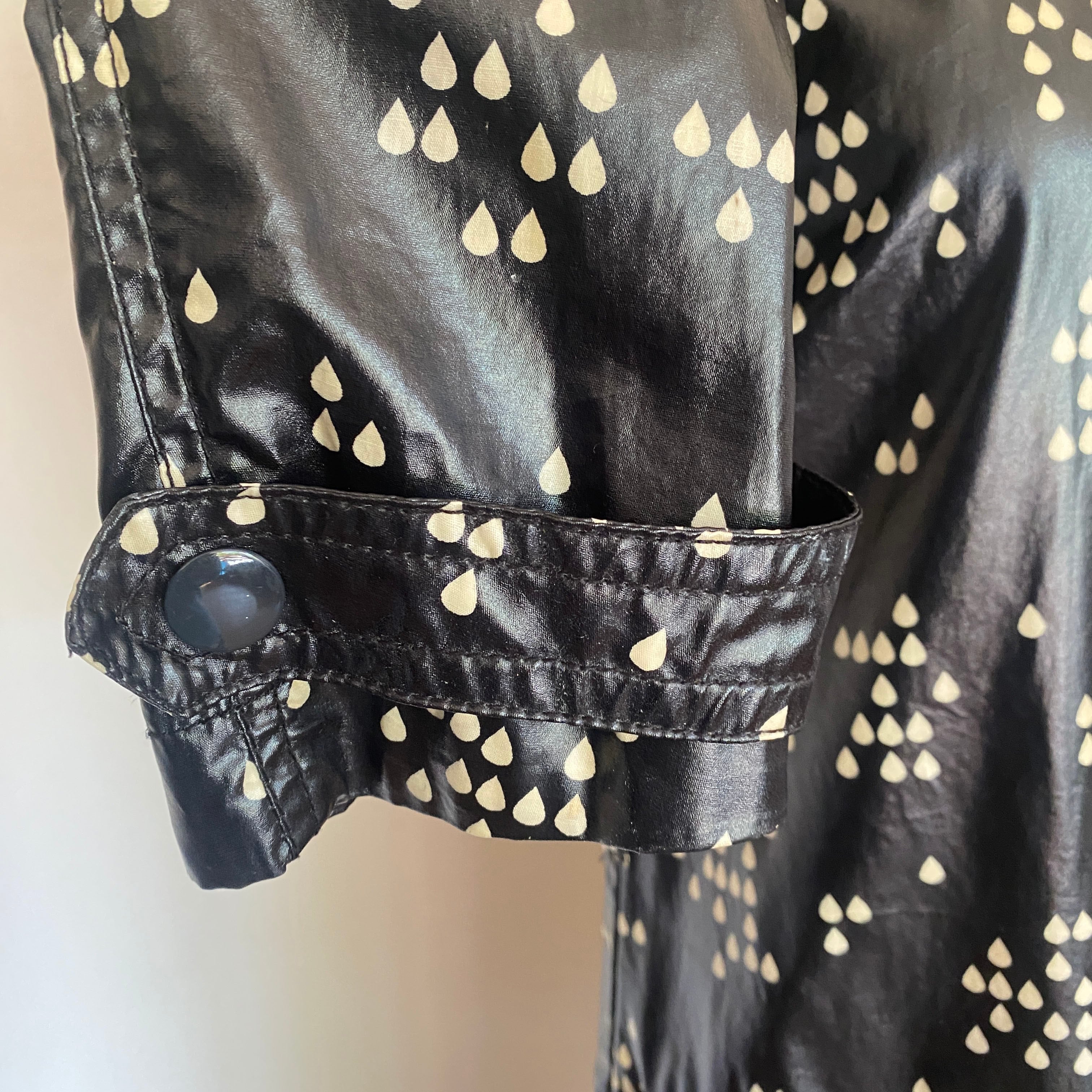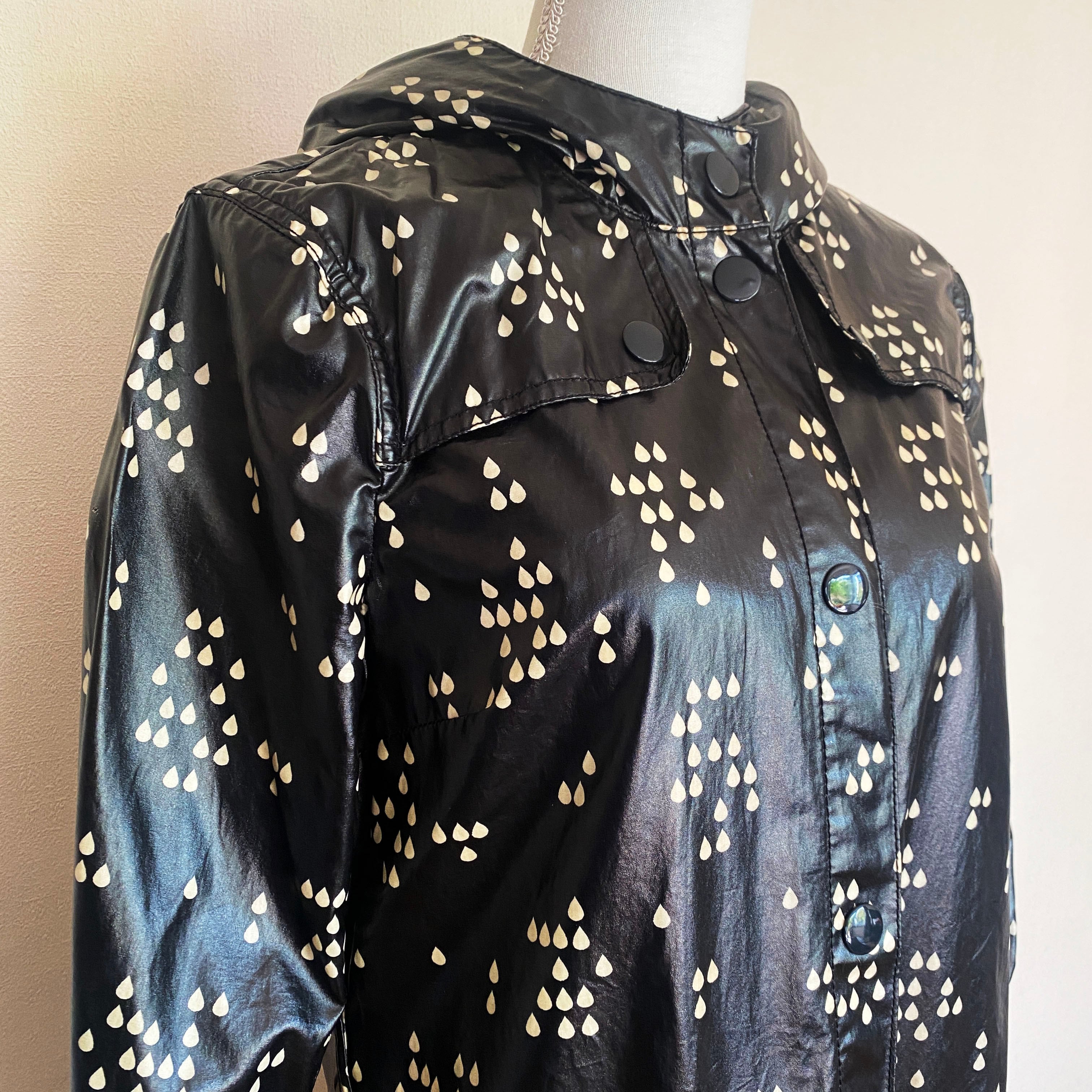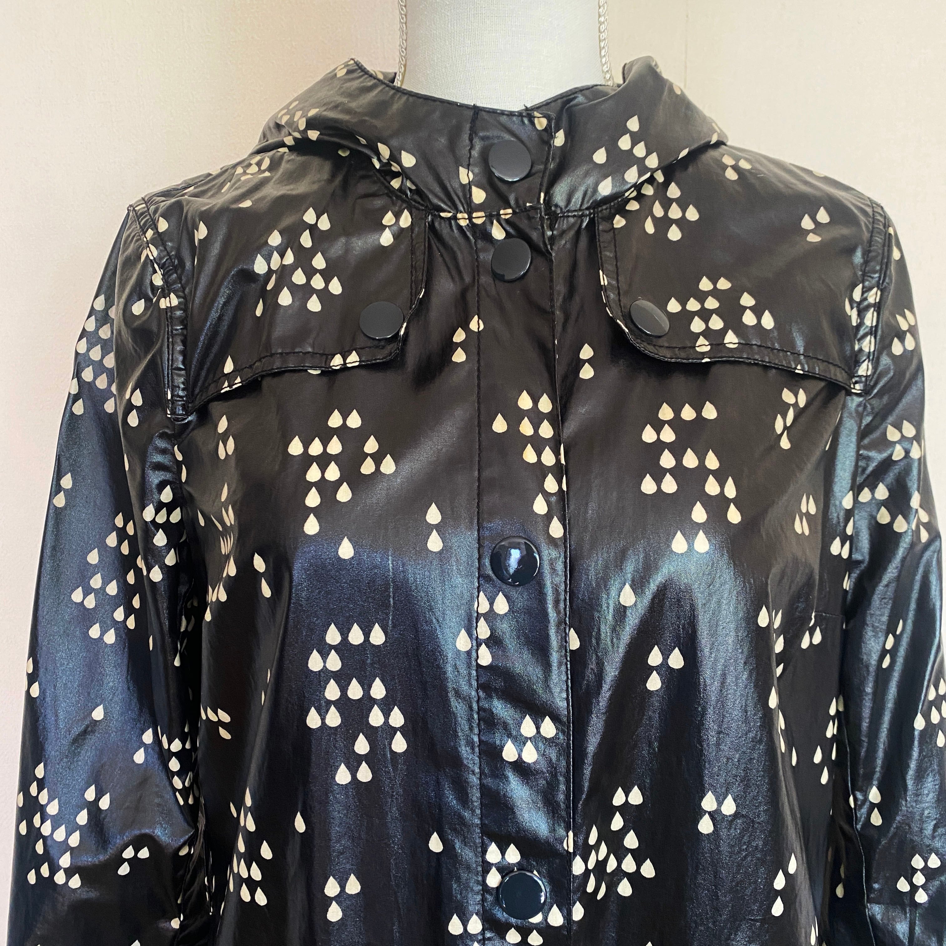 つやけしのビニールコート生地に、白のしずく型のランダムドットがかわいいレインコート。