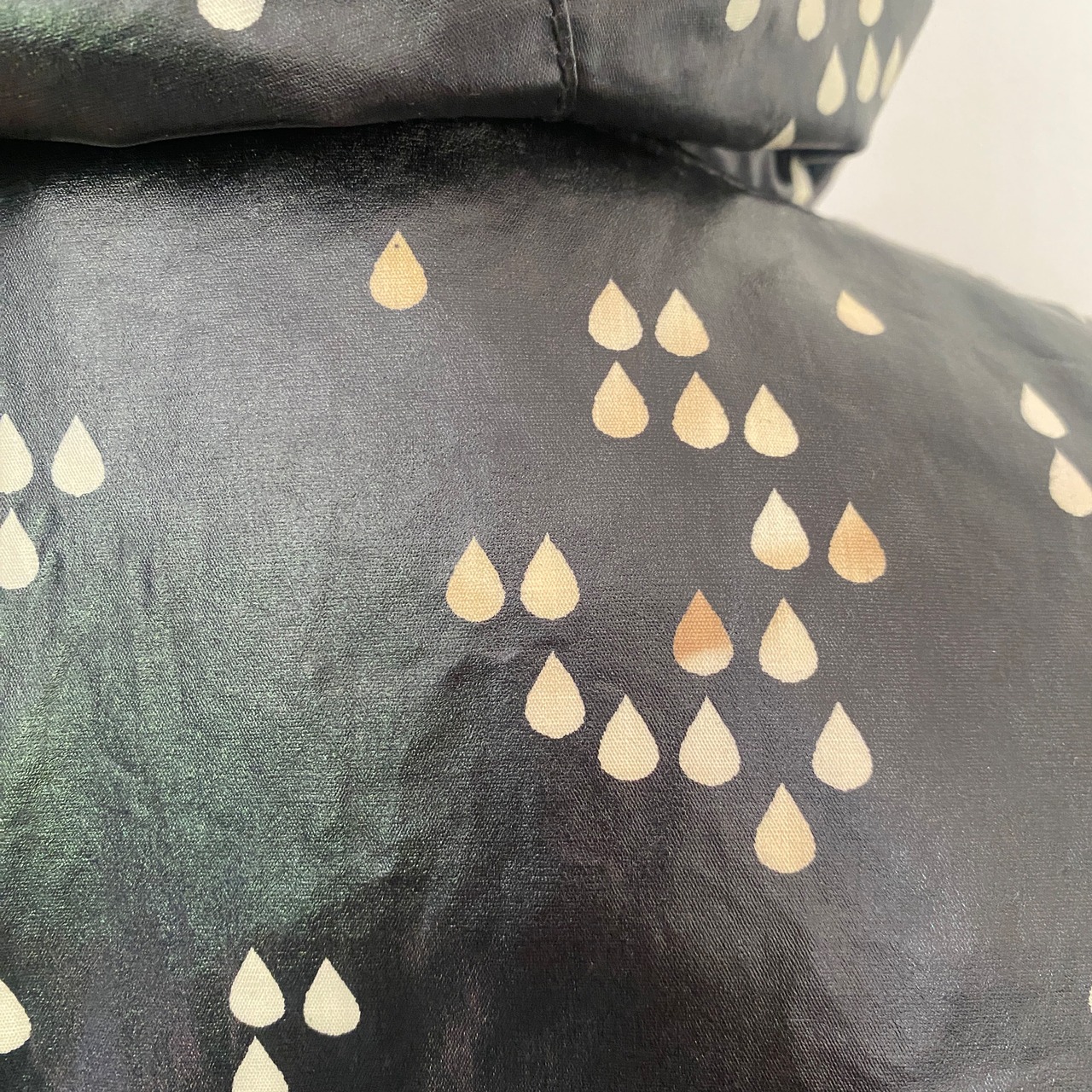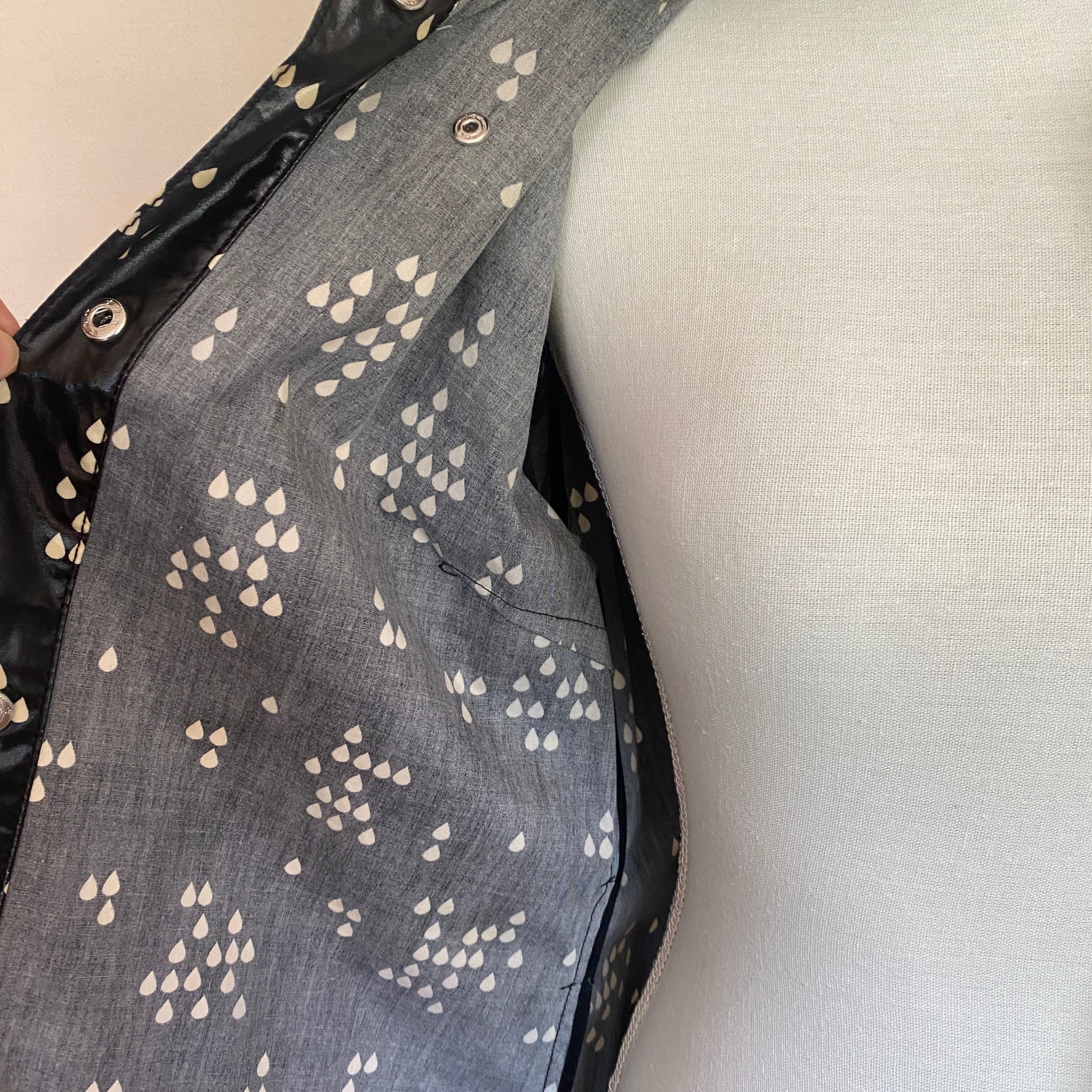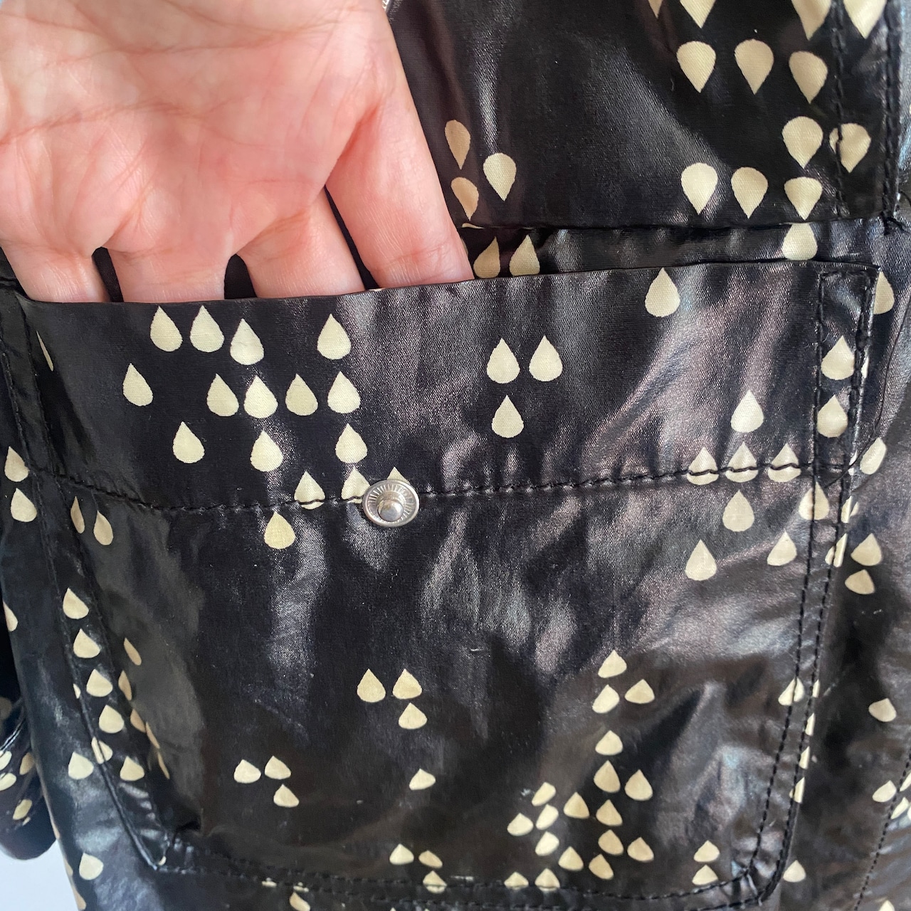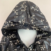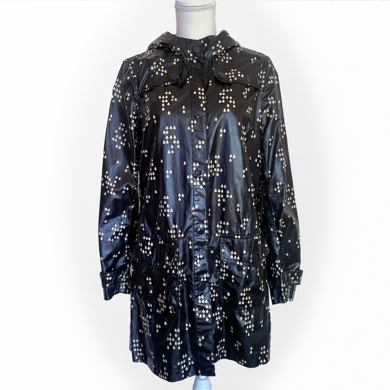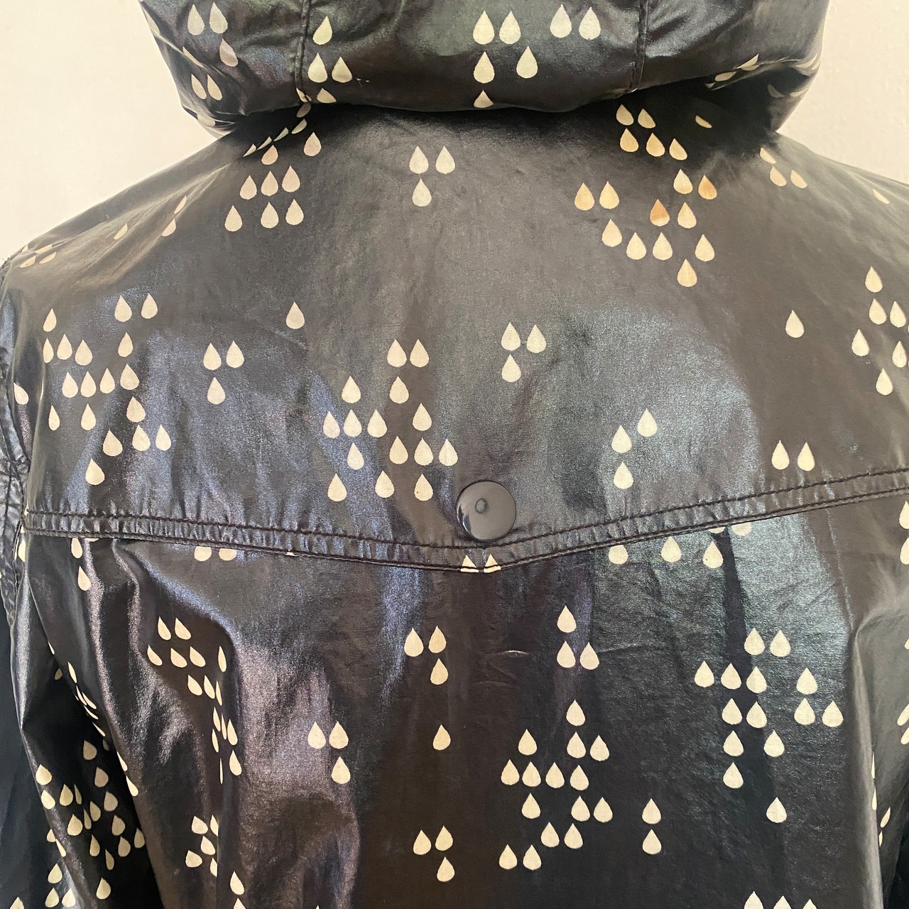 つやけしのビニールコート生地に、白のしずく型のランダムドットがかわいいレインコート。