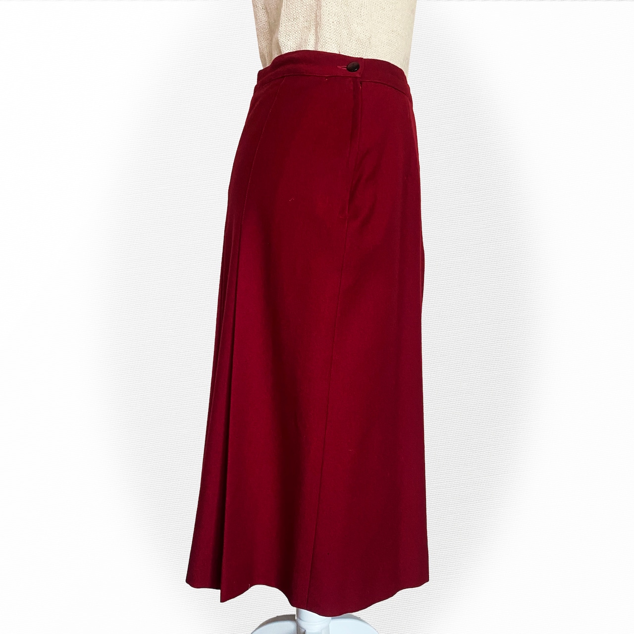 フロントのプリーツと、背面のキュロット感がクラシカルで、おちついた赤があたたかなコーディネイトを作ってくれそうです。